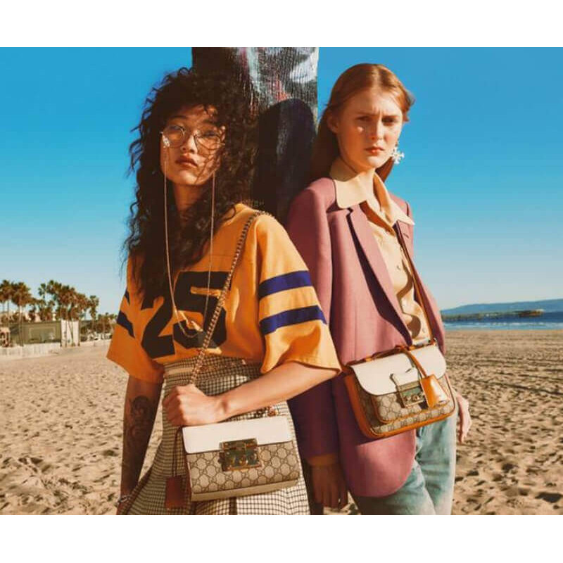 Inspired by a style from the archives, a mini version of the Padlock shoulder bag is introduced as a part of the Ouverture collection. Presented in a mix of white leather and GG Supreme canvas, the style is defined by the line s signature key lock closure. A colourful orange leather trim completes the style.