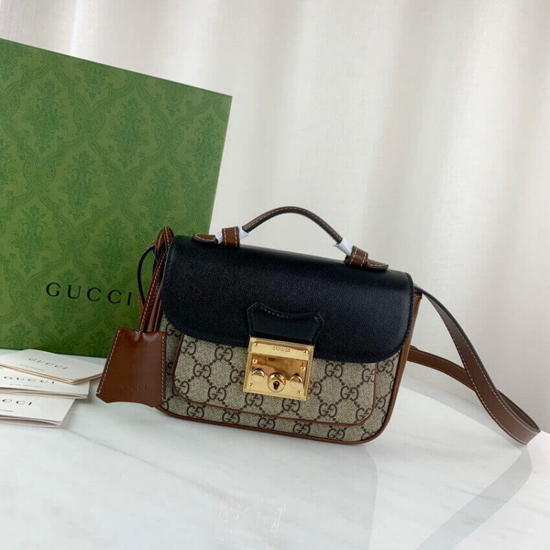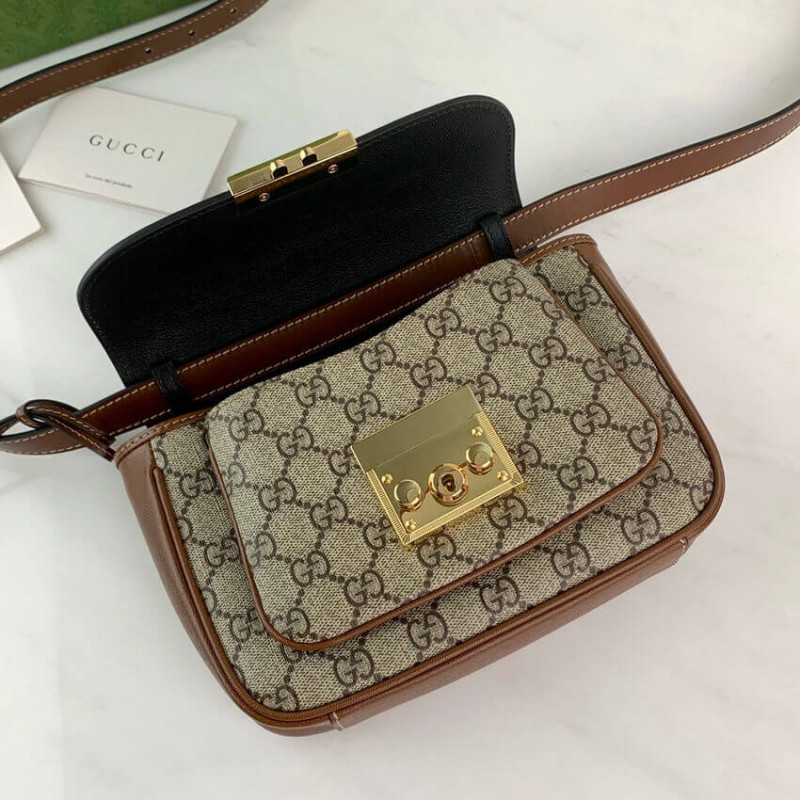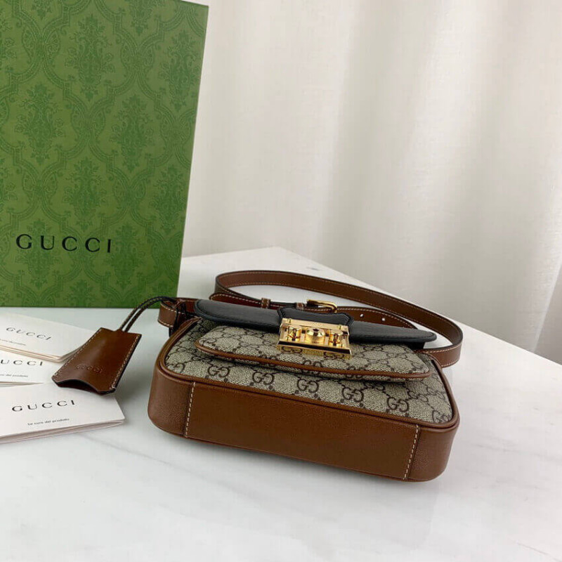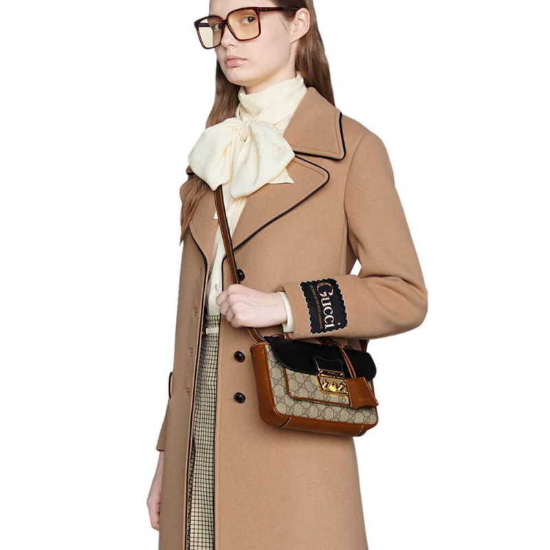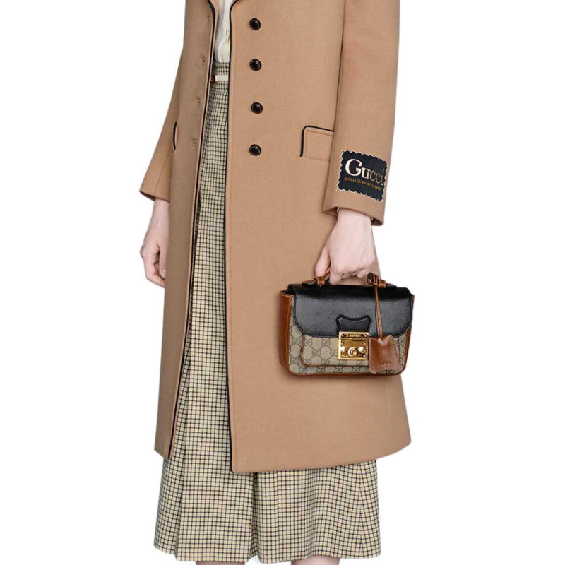 Inspired by a style from the archives, a mini version of the Padlock shoulder bag is introduced as a part of the Ouverture collection. Presented in a mix of white leather and GG Supreme canvas, the style is defined by the line s signature key lock closure. A colourful orange leather trim completes the style.