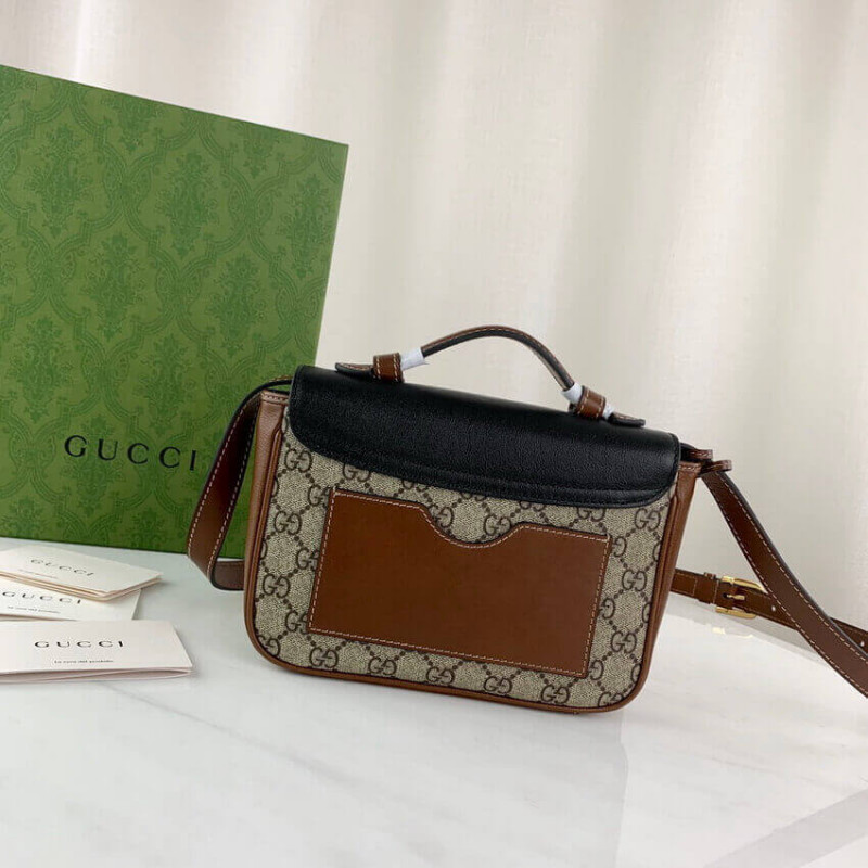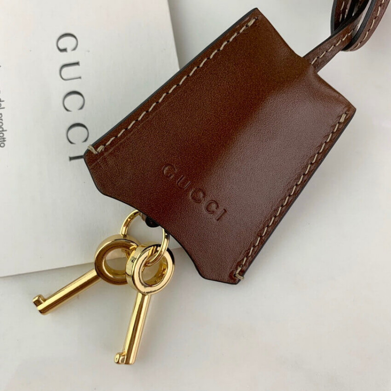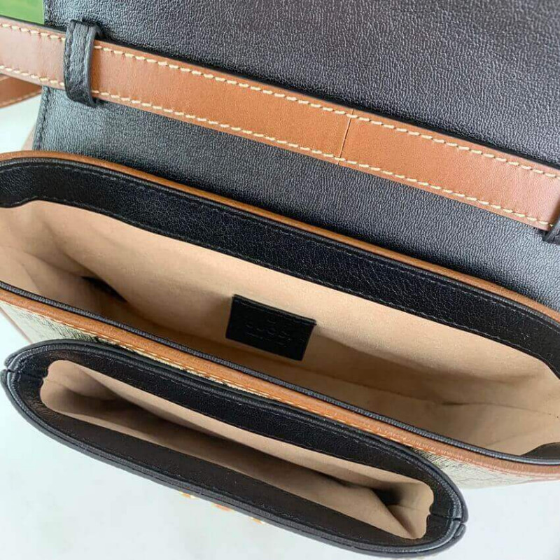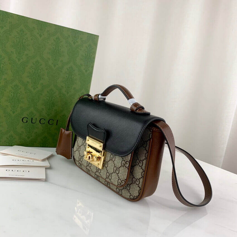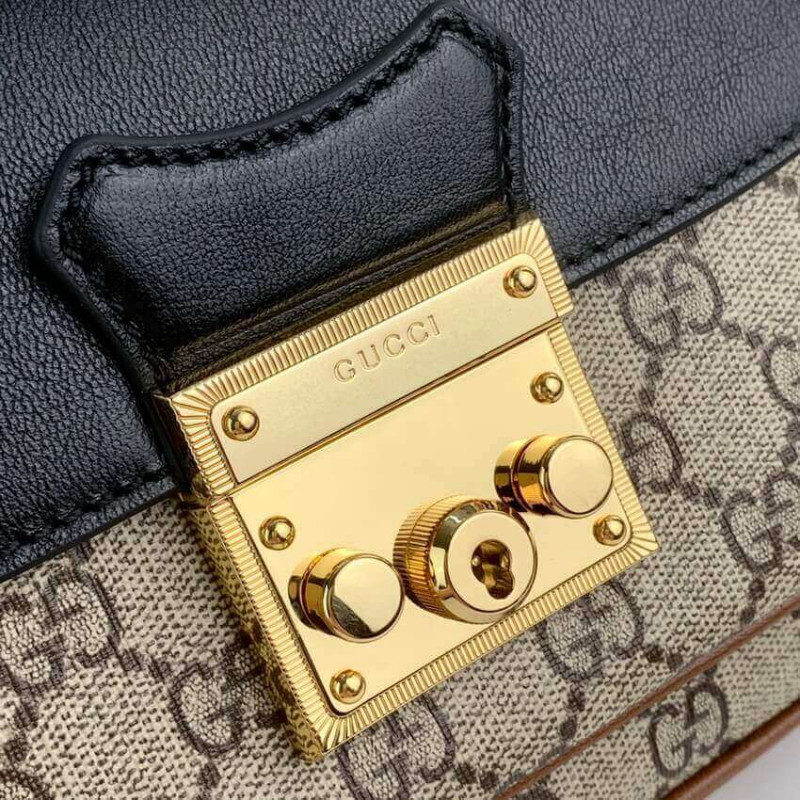 Inspired by a style from the archives, a mini version of the Padlock shoulder bag is introduced as a part of the Ouverture collection. Presented in a mix of white leather and GG Supreme canvas, the style is defined by the line s signature key lock closure. A colourful orange leather trim completes the style.