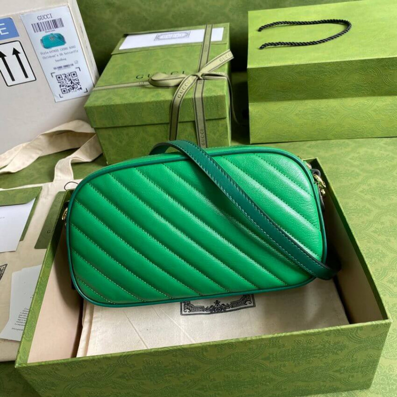 Reminiscent of precious emeralds, the GG Marmont bag is introduced in complementary shades of green leather. The Double G hardware, a signature feature of the line, is enriched with colorful enamel. The rectangular style is completed by a chain shoulder strap, allowing the accessory to be carried crossbody or on the shoulder.