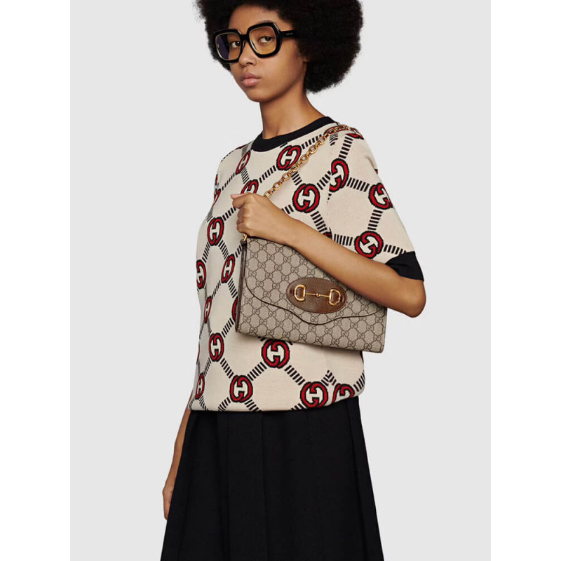 Embodying the notion of the versatility, the Gucci Horsebit 1955 is enriched with two detachable shoulder straps, one is crafted in emblematic green and red Web the other is in Gucci’s recognizable gold-toned chain design. The style is crafted from GG Supreme canvas and defined by the line s signature Horsebit hardware.