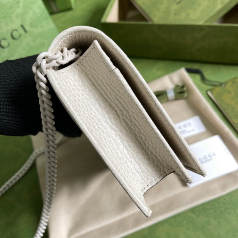 The GG Marmont chain wallet is introduced in timeless black leather for the Aria collection. First appearing as a belt buckle in the 70s, the Double G hardware is reimagined in tonal resin. The accessory monochrome shades add a contemporary feel to the emblematic design, accentuated by a detachable shoulder strap.