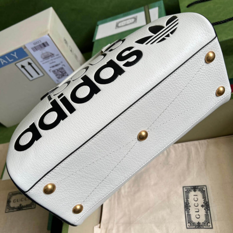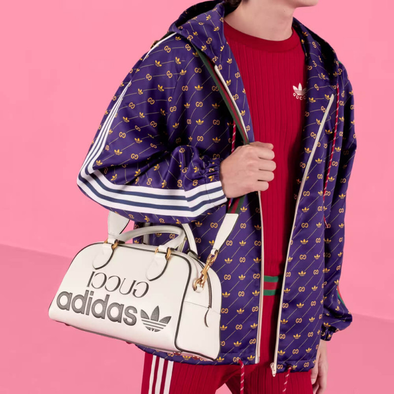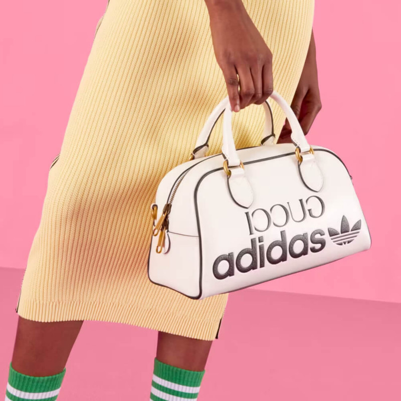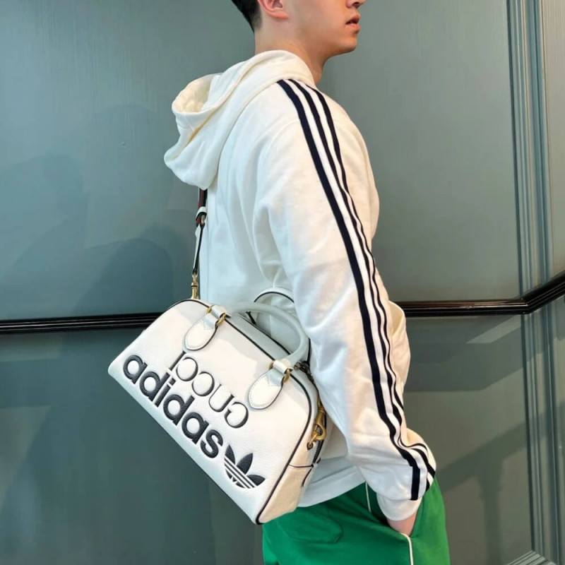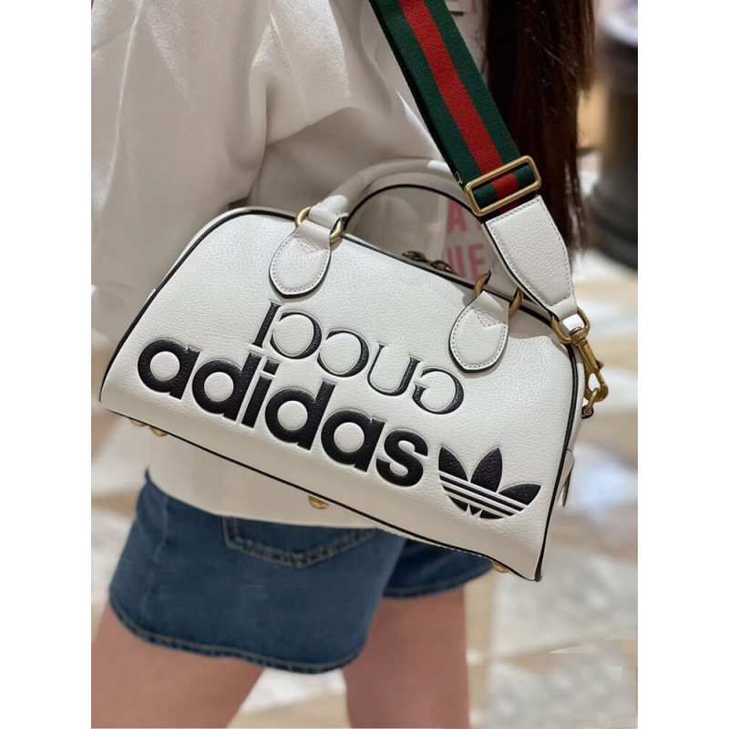 Part of the adidas x Gucci collection, this mini duffle bag features the Gucci adidas and Trefoil print. adidas and Gucci venture into a collection, where the Web juxtaposes with the three white stripes, and the GG monogram combines with the trefoil. Pulling inspiration from the Creative Director’s memories of the 80s and 90s, emblematic House’s motifs mix with those of the historic sportswear brand adidas resulting in a series of hybrid looks.