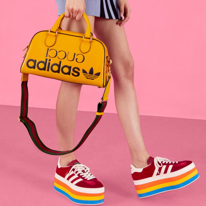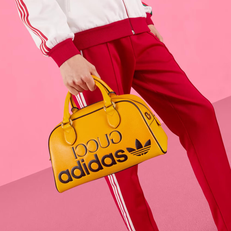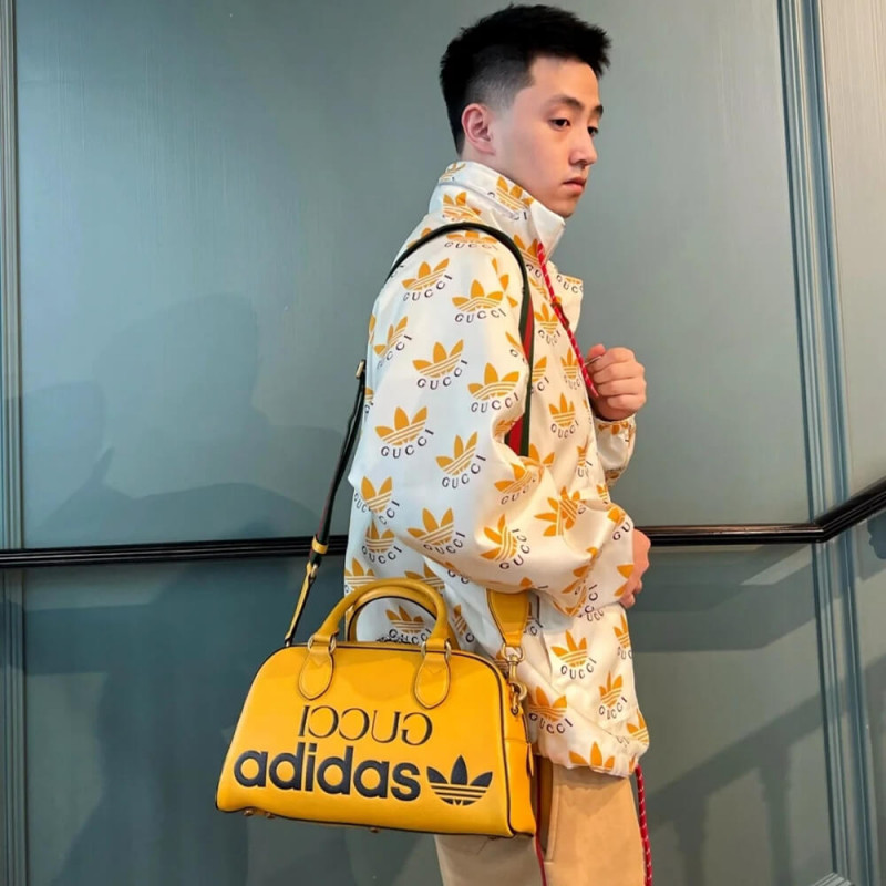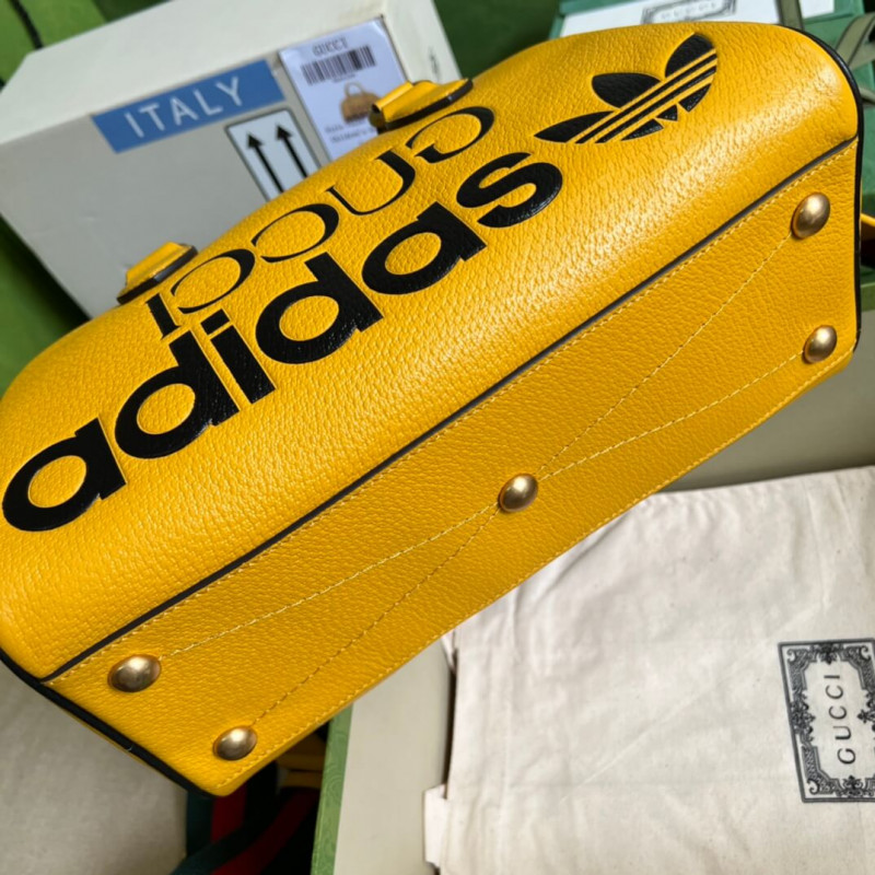 Part of the adidas x Gucci collection, this mini duffle bag features the Gucci adidas and Trefoil print. adidas and Gucci venture into a collection, where the Web juxtaposes with the three white stripes, and the GG monogram combines with the trefoil. Pulling inspiration from the Creative Director’s memories of the 80s and 90s, emblematic House’s motifs mix with those of the historic sportswear brand adidas resulting in a series of hybrid looks.