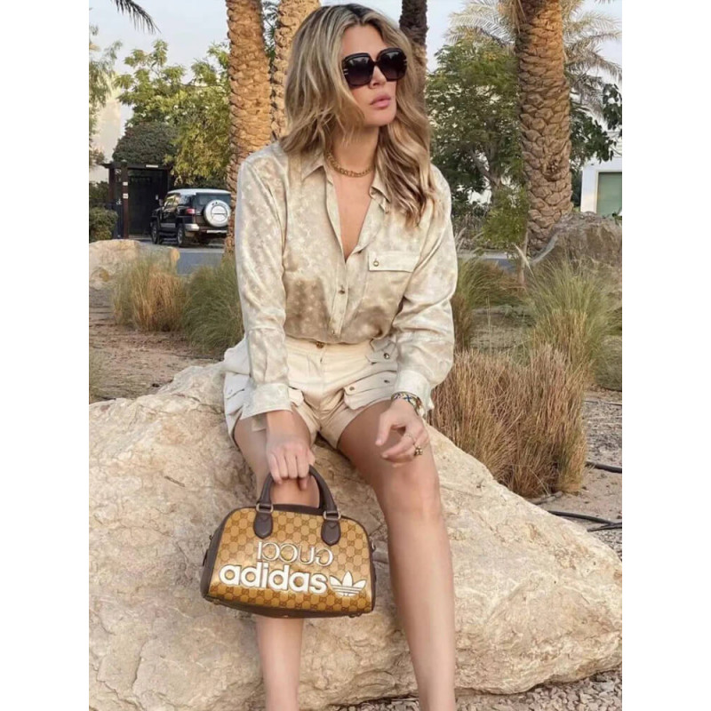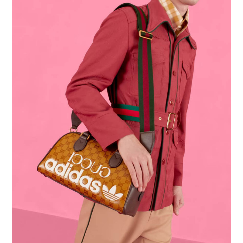 Part of the adidas x Gucci collection, this mini duffle bag features the Gucci adidas and Trefoil print. adidas and Gucci venture into a collection, where the Web juxtaposes with the three white stripes, and the GG monogram combines with the trefoil. Pulling inspiration from the Creative Director’s memories of the 80s and 90s, emblematic House’s motifs mix with those of the historic sportswear brand adidas resulting in a series of hybrid looks.