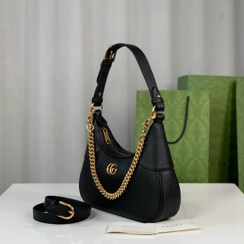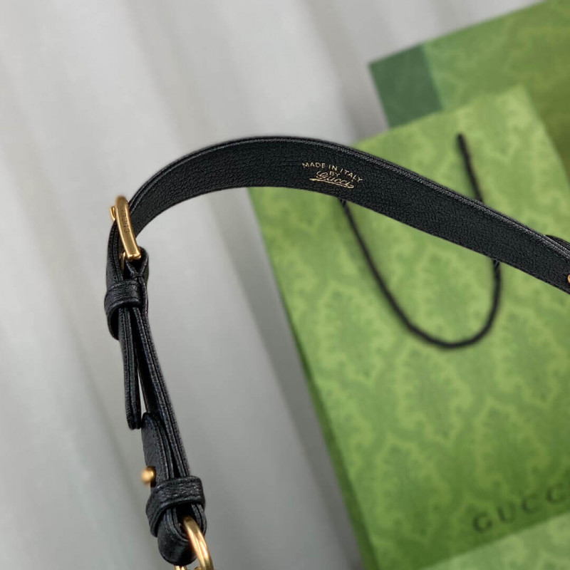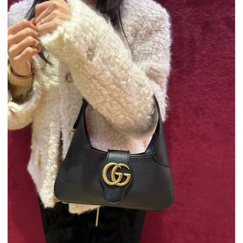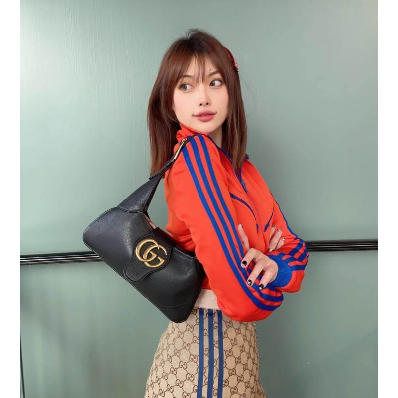 The Cruise 2023 Gucci Cosmogonie collection was presented against the backdrop of the historic Castel del Monte in Italy. The show brought together aesthetics from distant eras and geographies, and linked elements from the past with the present. This new crescent-shaped shoulder bag is part of a collection shown on the runway and was inspired by the House’s archives, it is crafted in soft leather and features the Double G emblem—a code originally introduced in the 1970s.