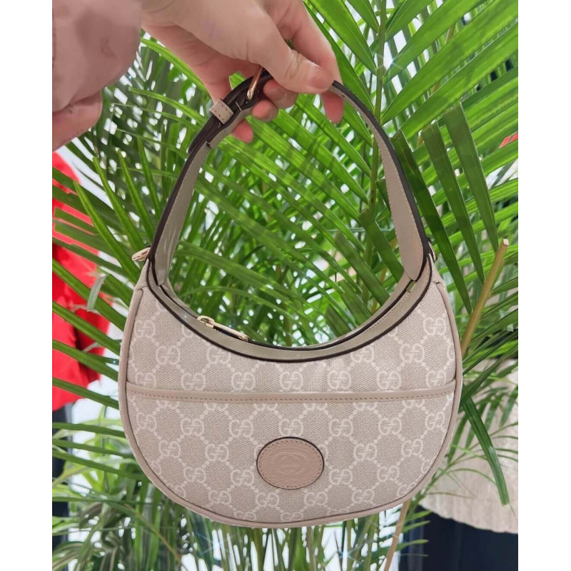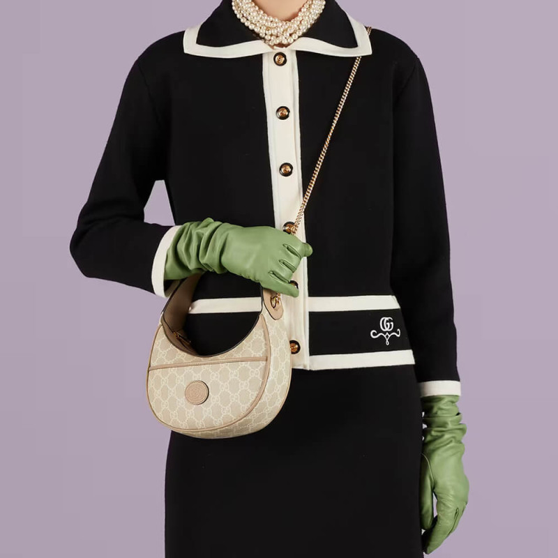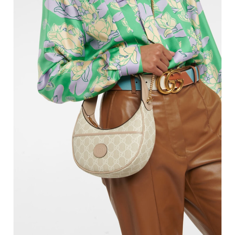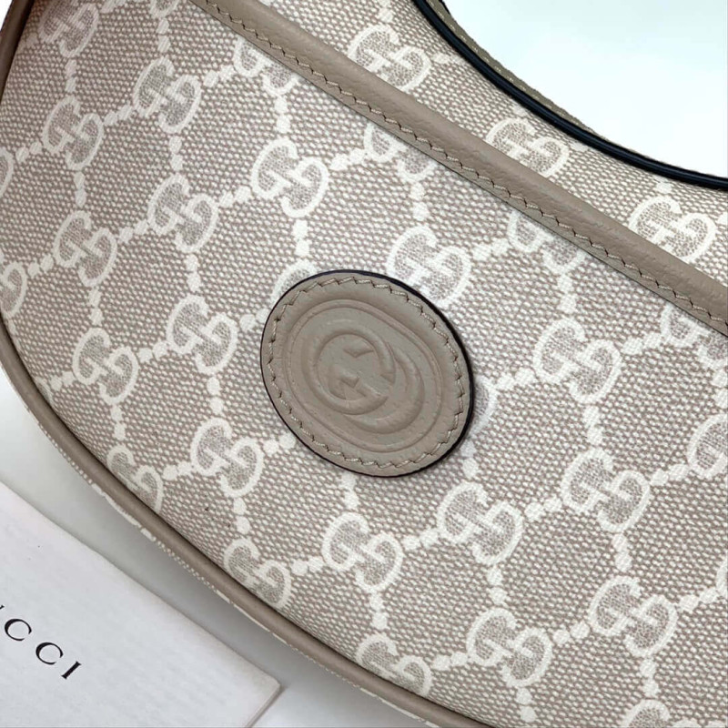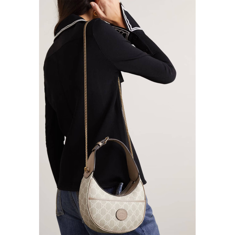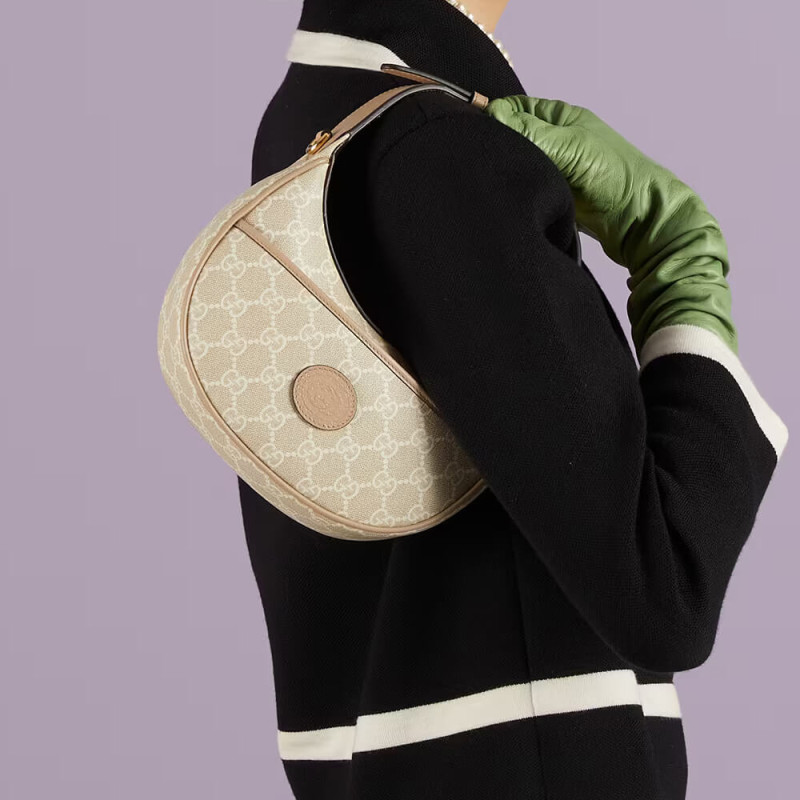 An instantly recognizable retro shape is reimagined through House codes. Appearing during the 30s, monogram canvas has appeared throughout the ensuing decades as an homage to the brand s roots. This half-moon-shaped bag is presented in beige and white GG Supreme canvas with a oatmeal leather trim. The mini accessory continues to pay tribute to the Founder of the House with an oval Interlocking G tag.