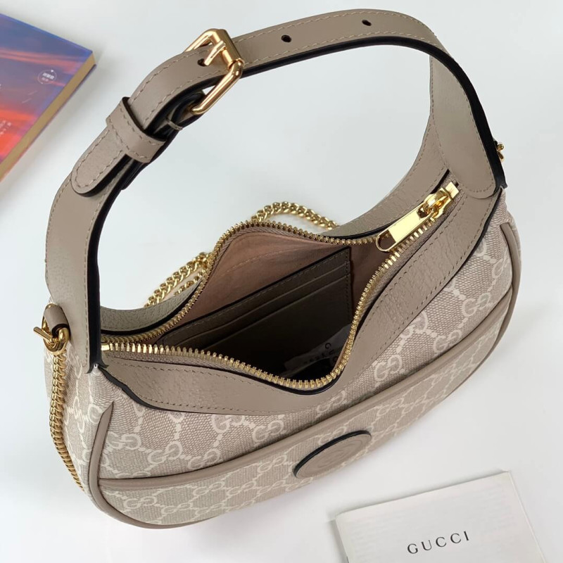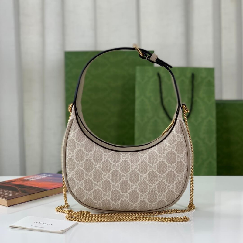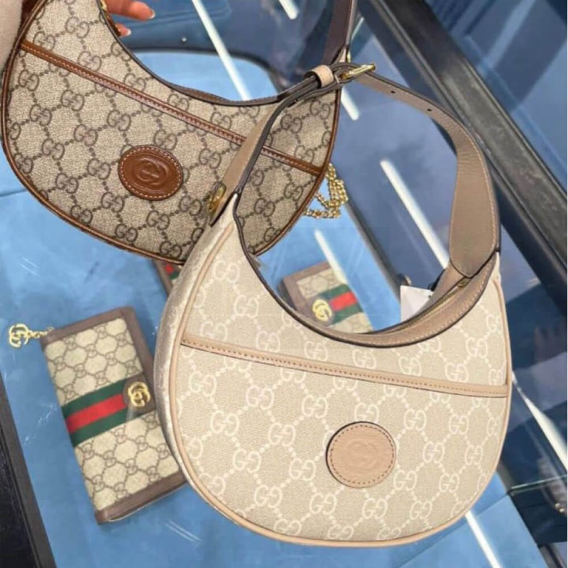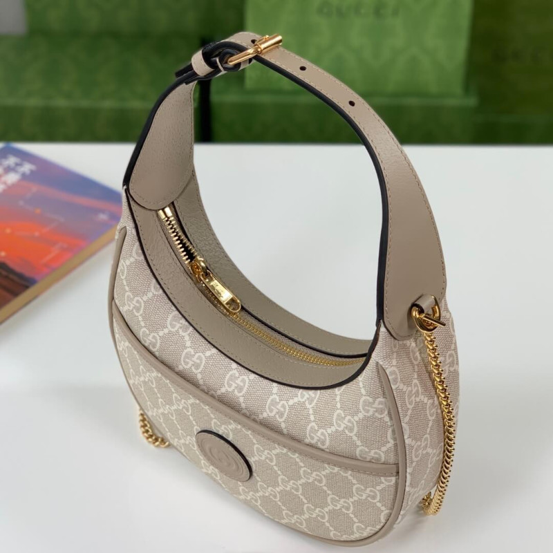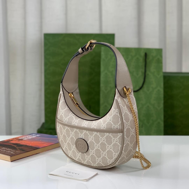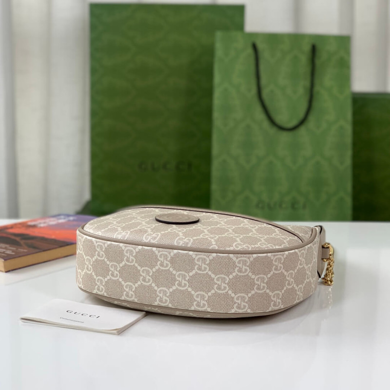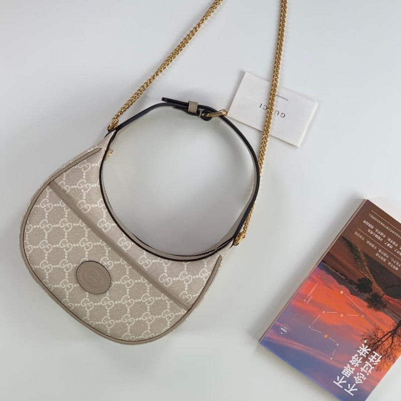 An instantly recognizable retro shape is reimagined through House codes. Appearing during the 30s, monogram canvas has appeared throughout the ensuing decades as an homage to the brand s roots. This half-moon-shaped bag is presented in beige and white GG Supreme canvas with a oatmeal leather trim. The mini accessory continues to pay tribute to the Founder of the House with an oval Interlocking G tag.