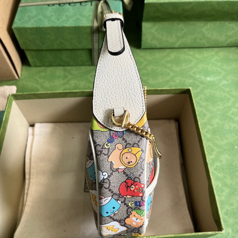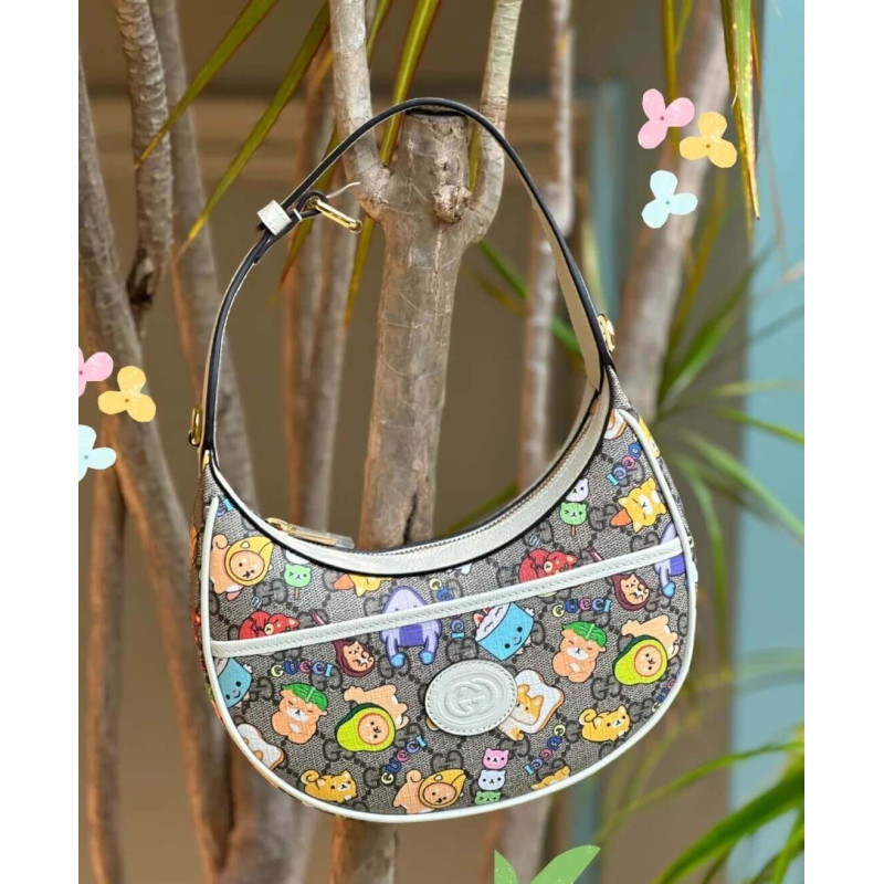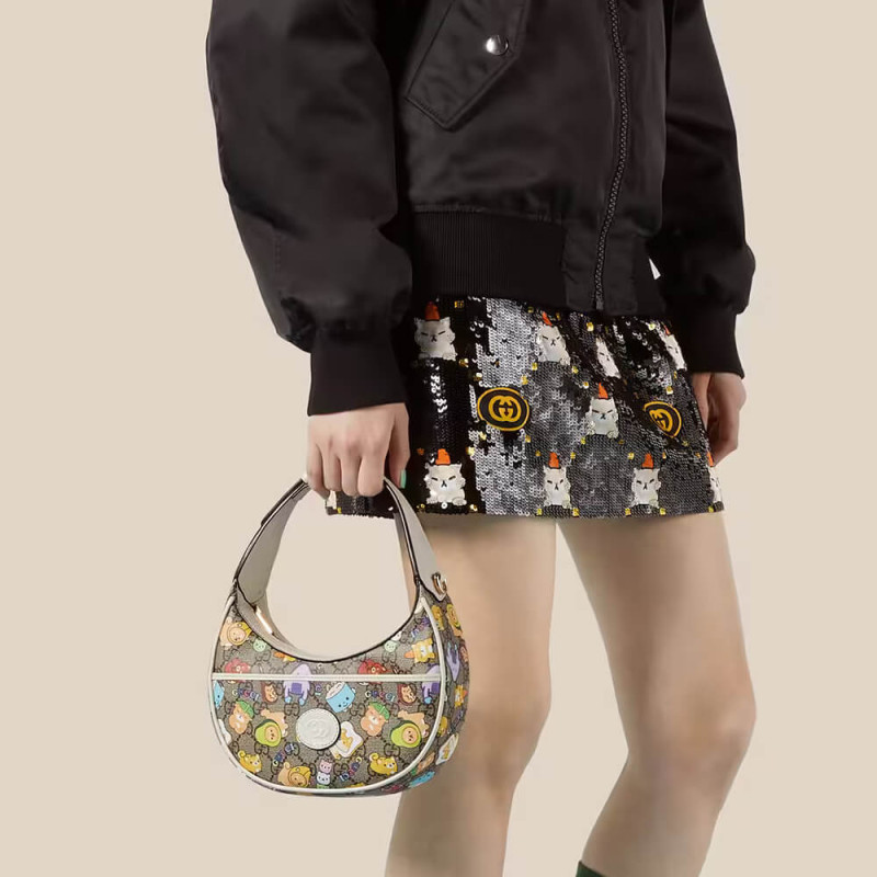 The artwork by America-based illustrator and designer, Angela Nguyen, also known as Pikarar , adds a playful touch to ready-to-wear pieces and accessories with vibrant prints or embroideries inspired by pop culture, anime, and animals. Here this mini bag is defined by a Gucci animal print.