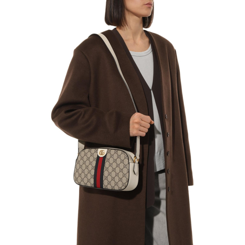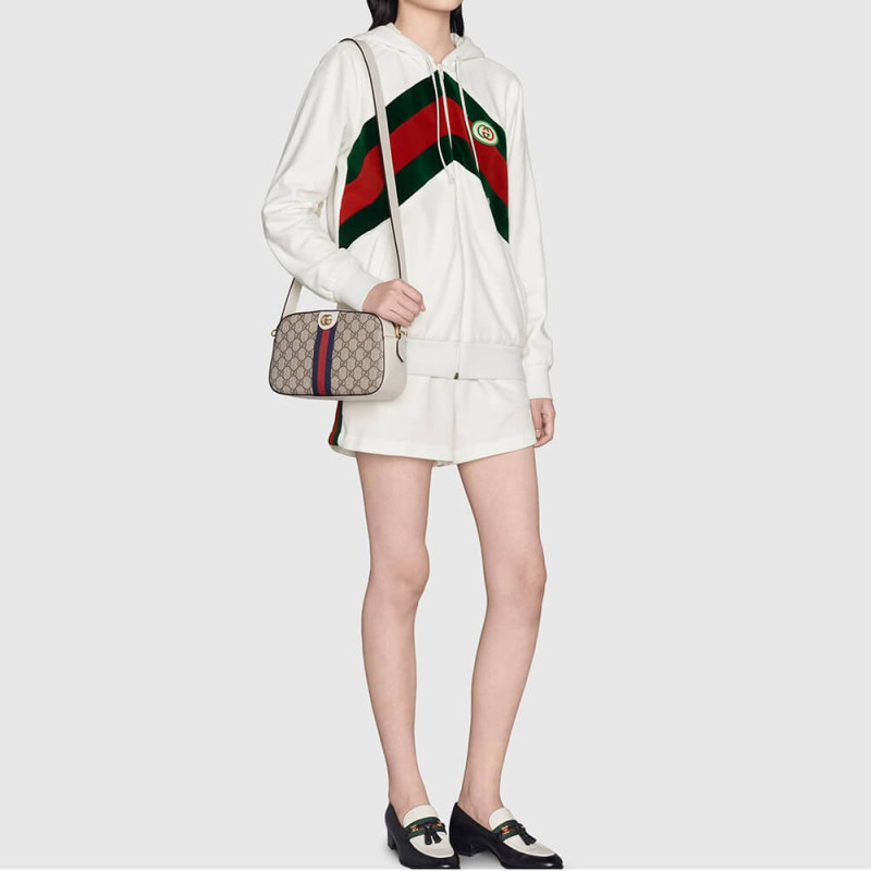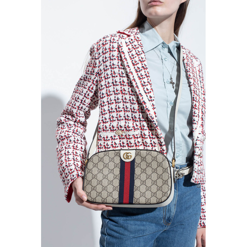 Mirroring the material s historic origins, GG Supreme is introduced in a timeless mix of blue and beige for Gucci Love Parade. The canvas has come to the front of each collection decade after decade to become a hallmark of the House. Here, the classic palette defines this Ophidia camera bag.