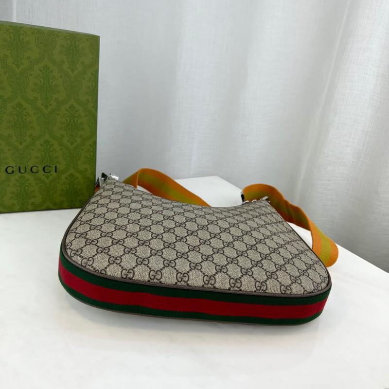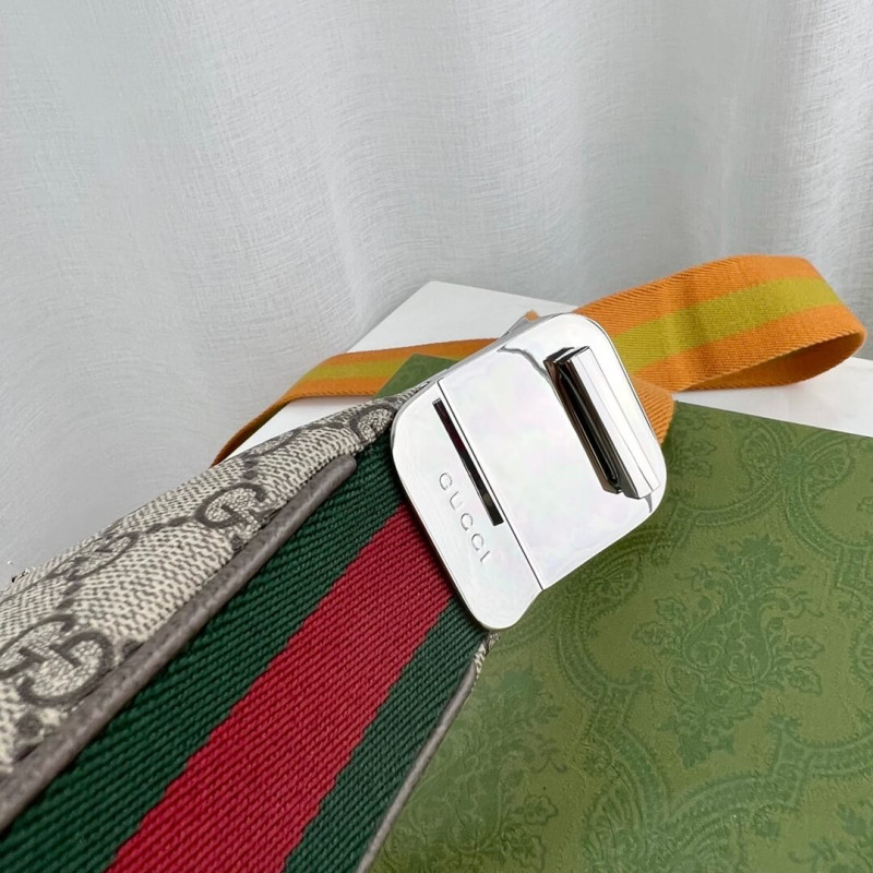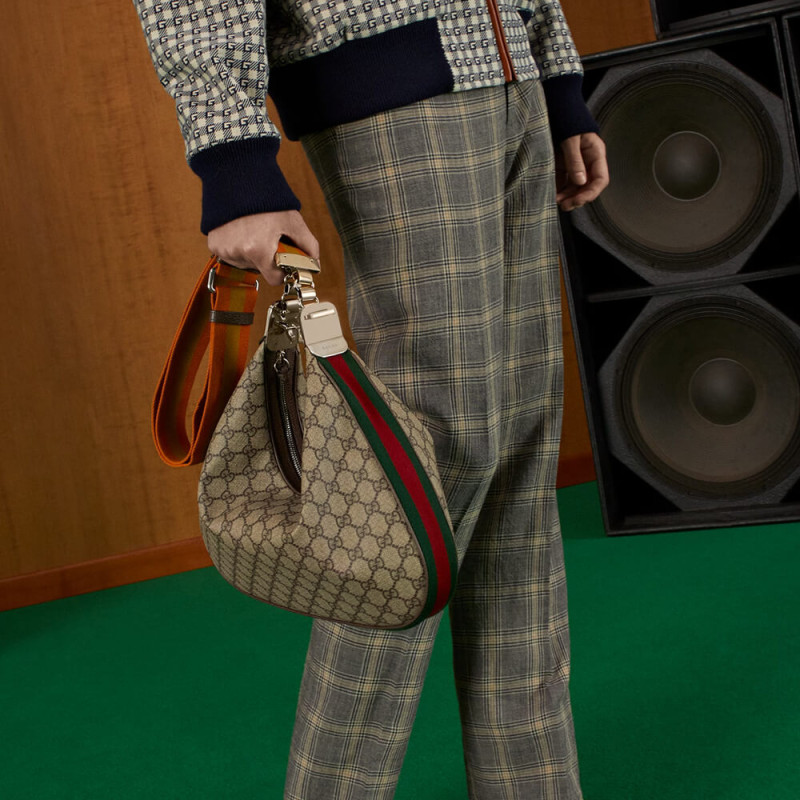 An ode to the timeless Hollywood glamour that shaped Gucci Love Parade, classic elements from the House s archives are reintroduced. Distinguished by its crescent moon shape, the accessory is further defined by a G shaped hook closure. Paired with soft materials, the heritage hardware creates a refined design with vintage appeal. This medium version is crafted from beige and blue GG Supreme canvas, complete with a blue and red Web trim.