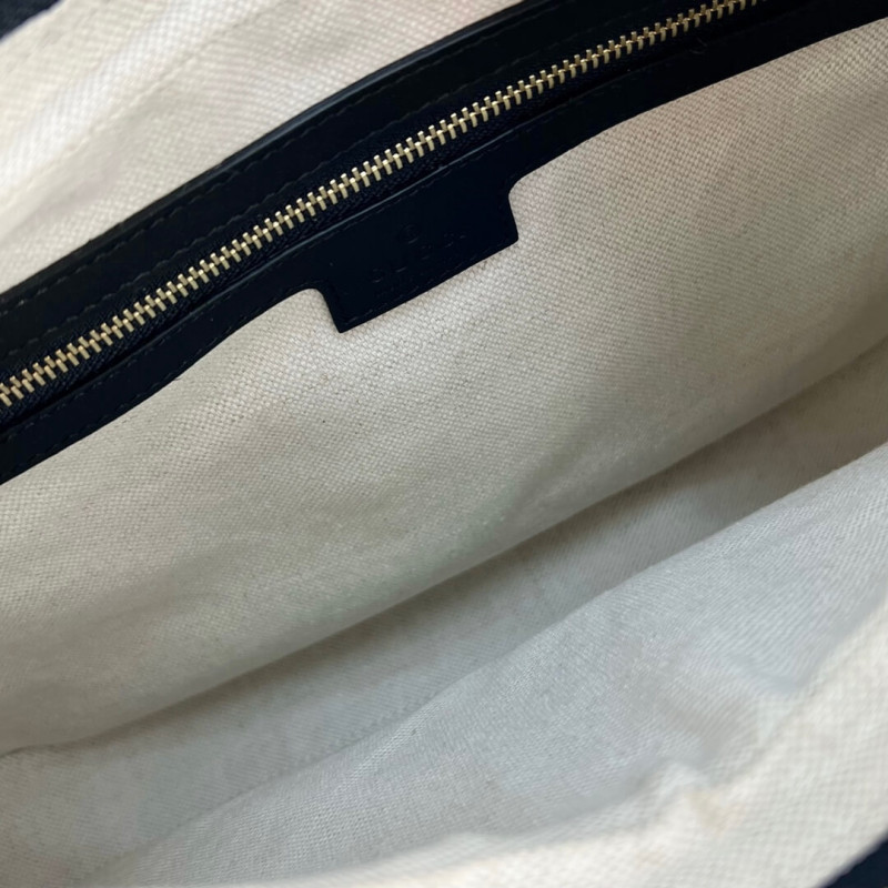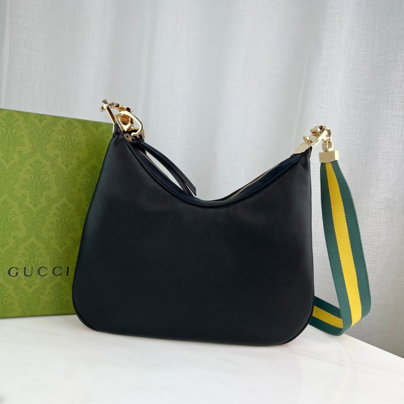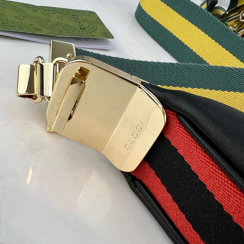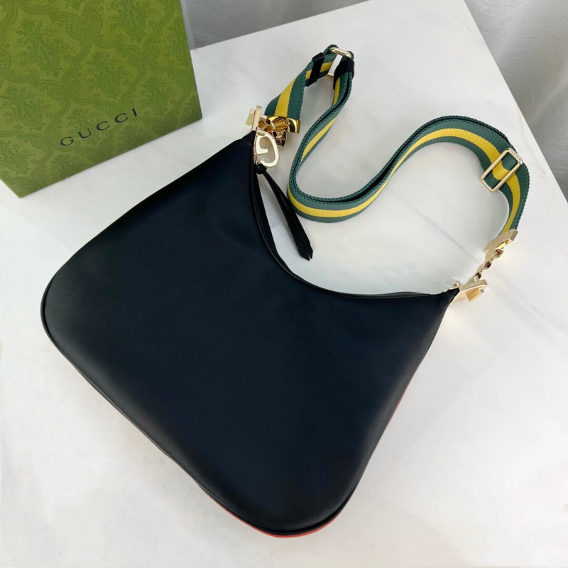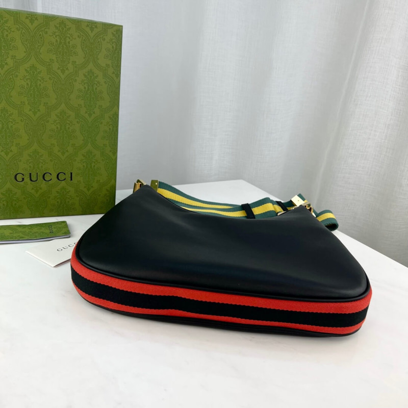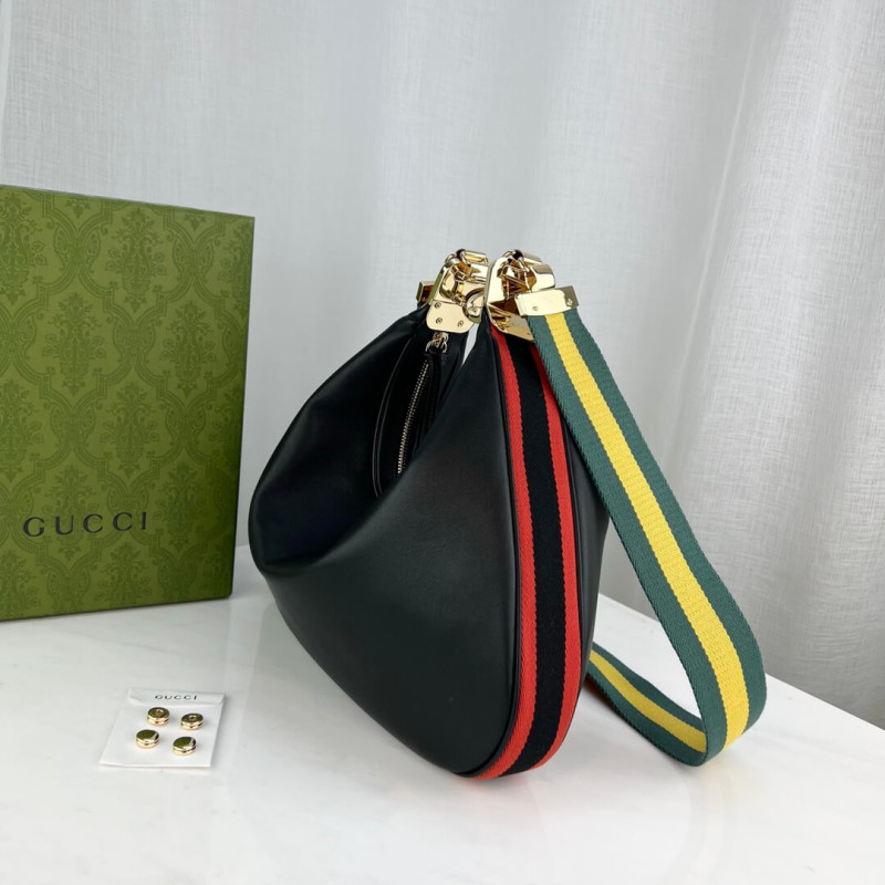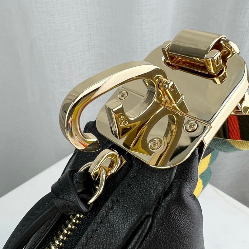 An ode to the timeless Hollywood glamour that shaped Gucci Love Parade, classic elements from the House s archives are reintroduced. Distinguished by its crescent moon shape, the accessory is further defined by a G shaped hook closure. Paired with soft materials, the heritage hardware creates a refined design with vintage appeal. This medium version is crafted in black leather with orange and black Web trim.