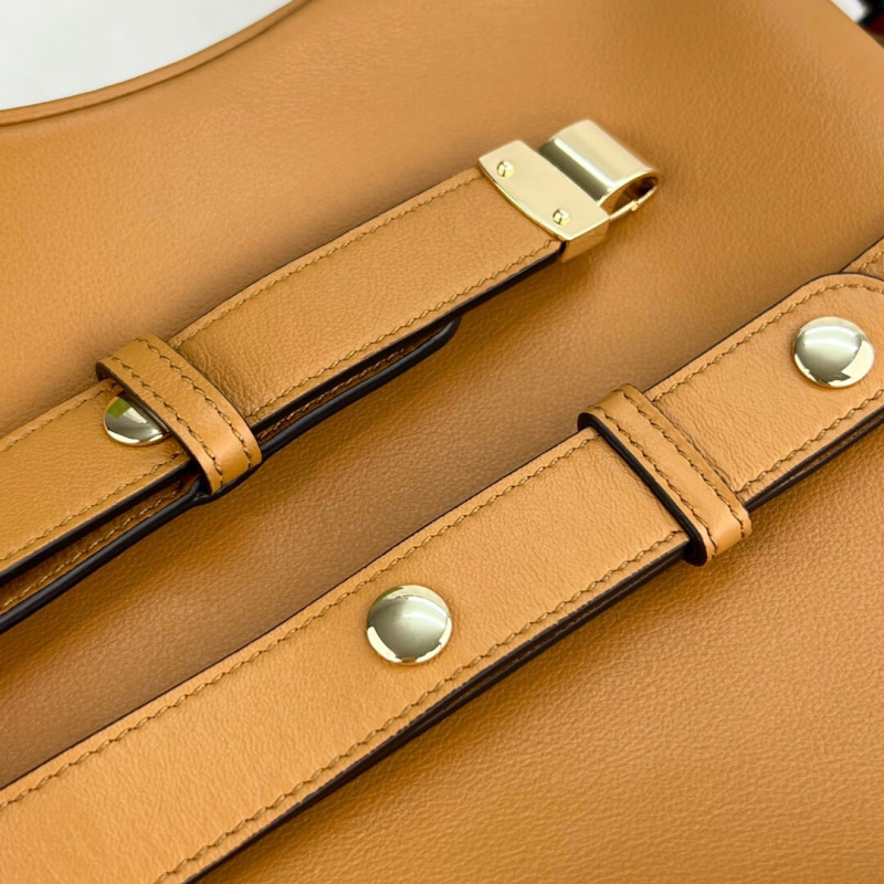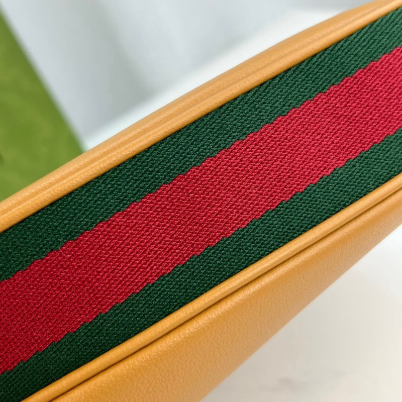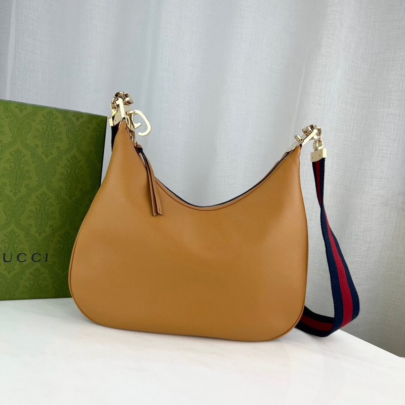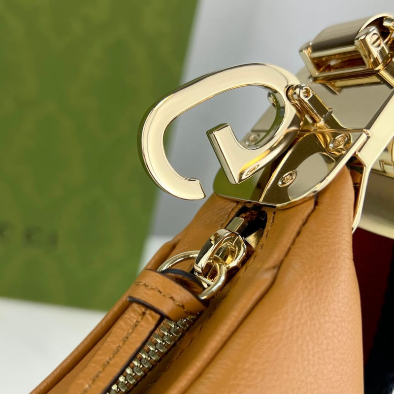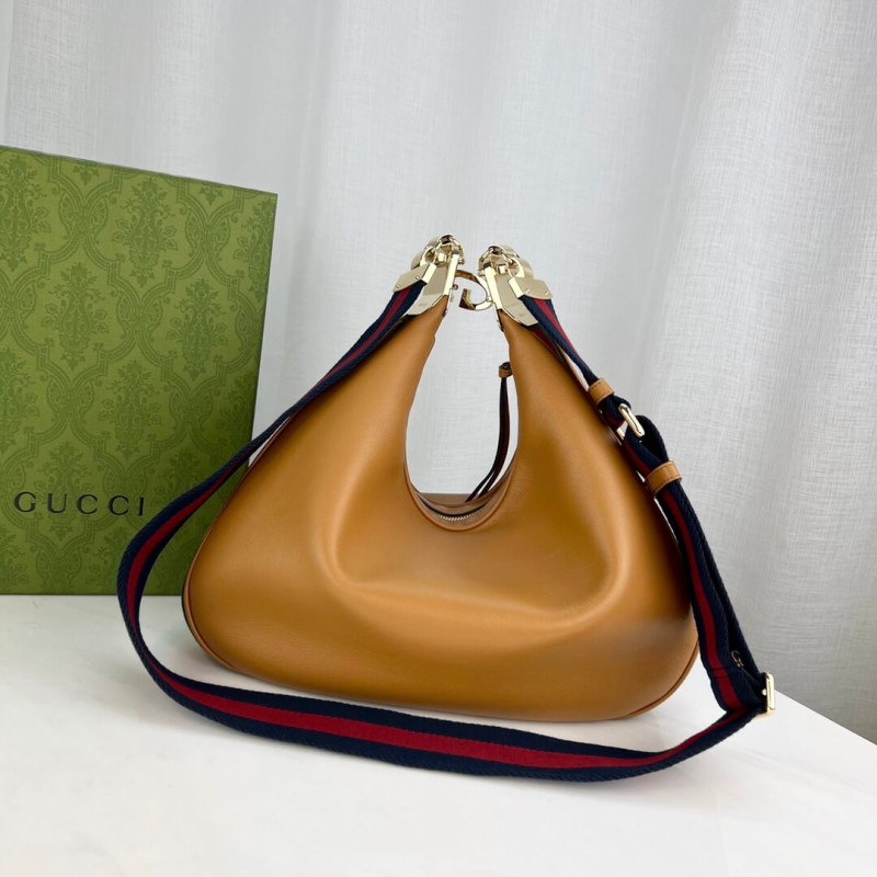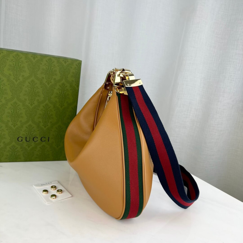 An ode to the timeless Hollywood glamour that shaped Gucci Love Parade, classic elements from the House s archives are reintroduced. Distinguished by its crescent moon shape, the accessory is further defined by a G shaped hook closure. Paired with soft materials, the heritage hardware creates a refined design with vintage appeal. This medium version is crafted in black leather with orange and black Web trim.