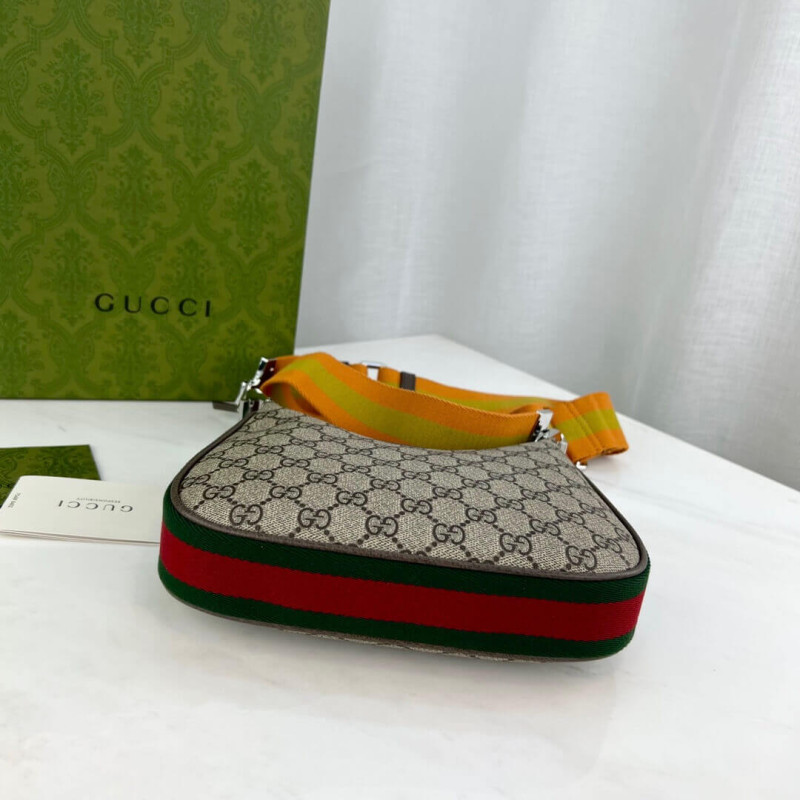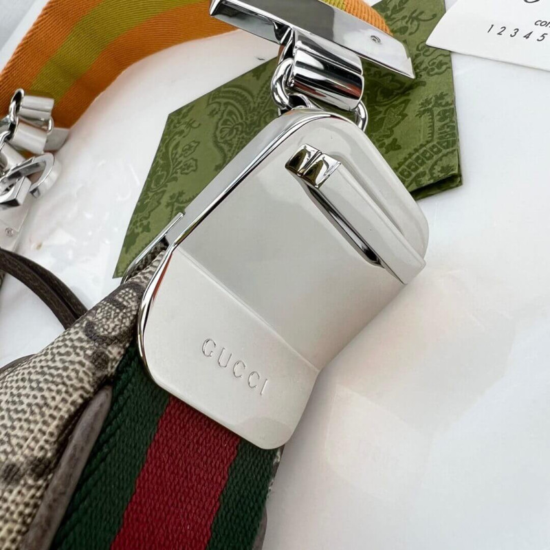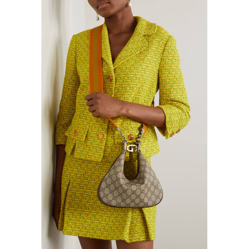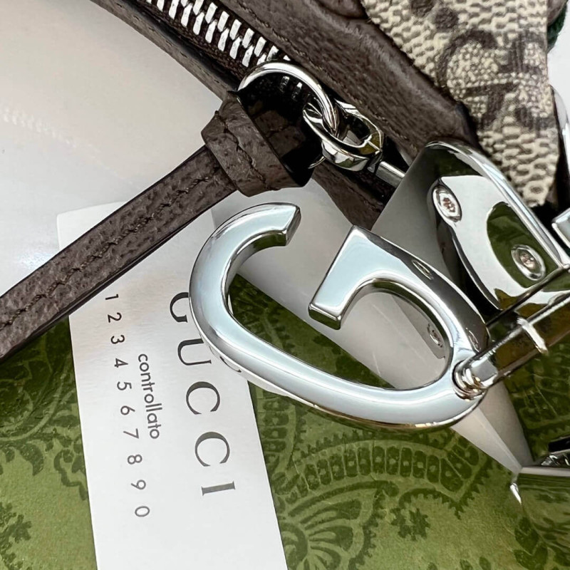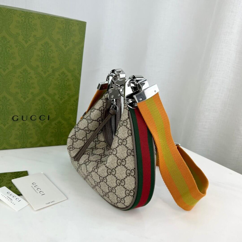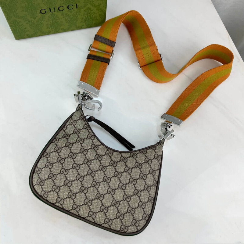 An ode to the timeless Hollywood glamour that shaped Gucci Love Parade, classic elements from the House s archives are reintroduced. Distinguished by its crescent moon shape, the accessory is further defined by a G shaped hook closure. Paired with soft materials, the heritage hardware creates a refined design with vintage appeal. This small version is crafted in beige and ebony GG Supreme canvas with brown leather trim.