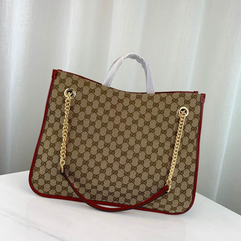 Designed with rounded edges and a soft shape, the tote bag is introduced to the Gucci 1955 Horsebit collection for Spring Summer 2020. Made from GG Supreme canvas with brown leather trim, the large double-handled silhouette has a chain shoulder strap that complements its modern spirit, finished with an organizational interior and magnetic snap closure. The collection unifies details first introduced on the original bag that inspired the line from over six decades ago with a modern spirit, highlighting the Horsebit. Part of Gucci’s genetic code, the double ring and bar design has been established as one of the most distinctive elements among the House symbols borrowed from the equestrian world.