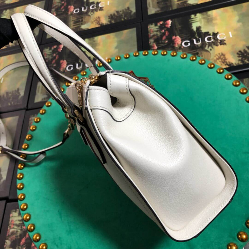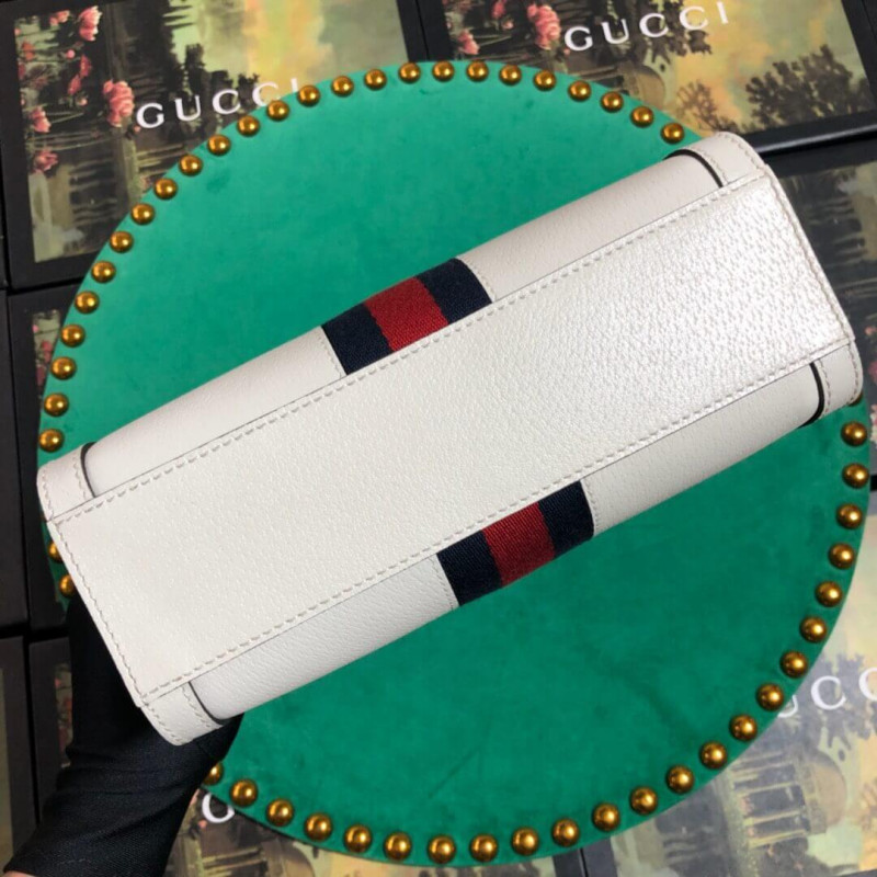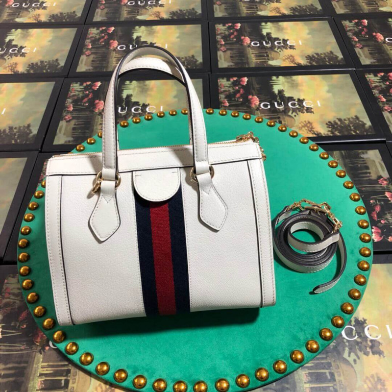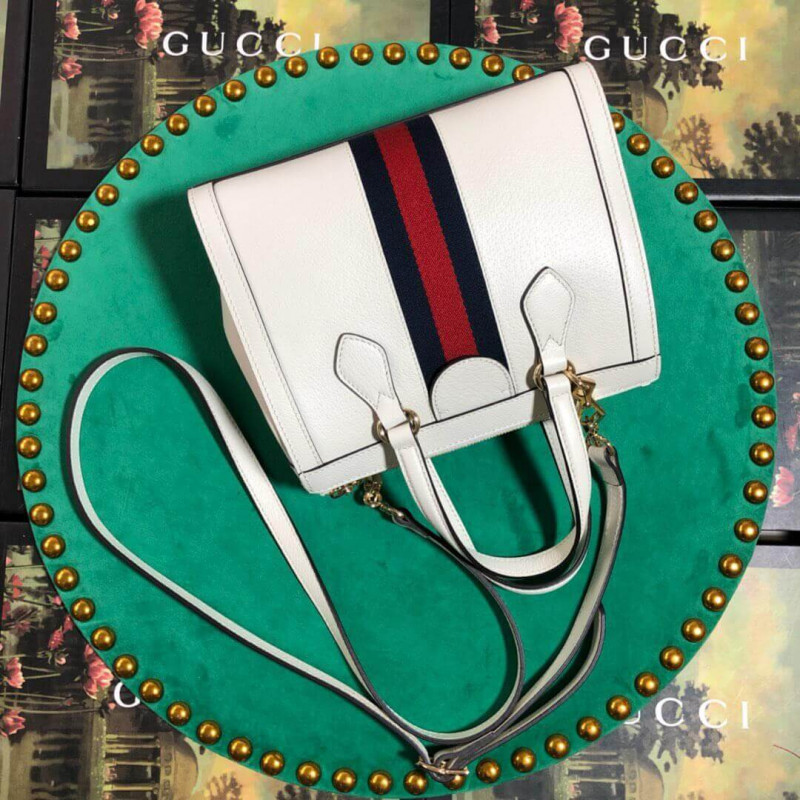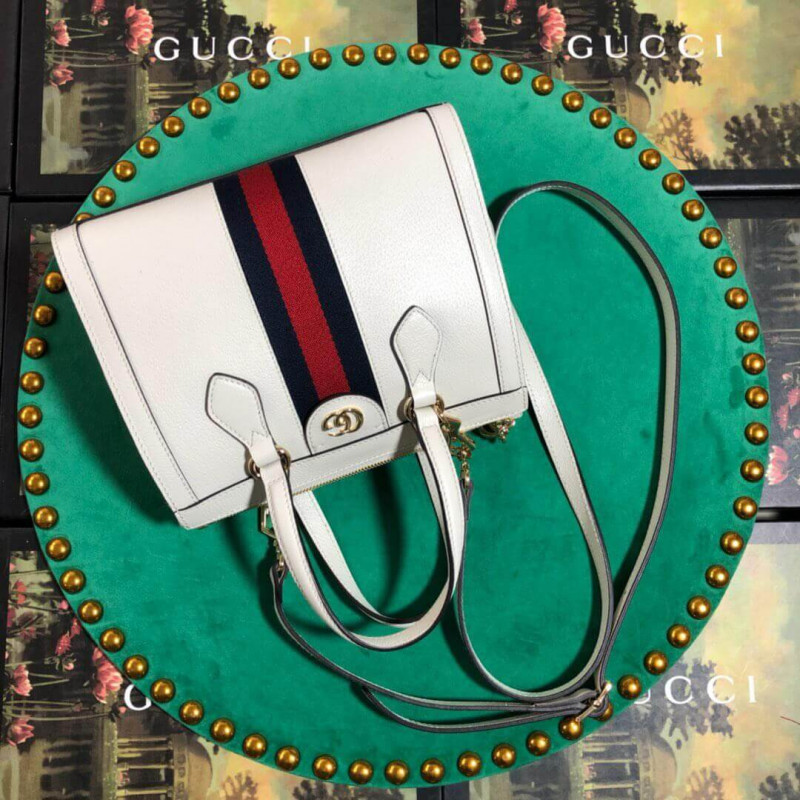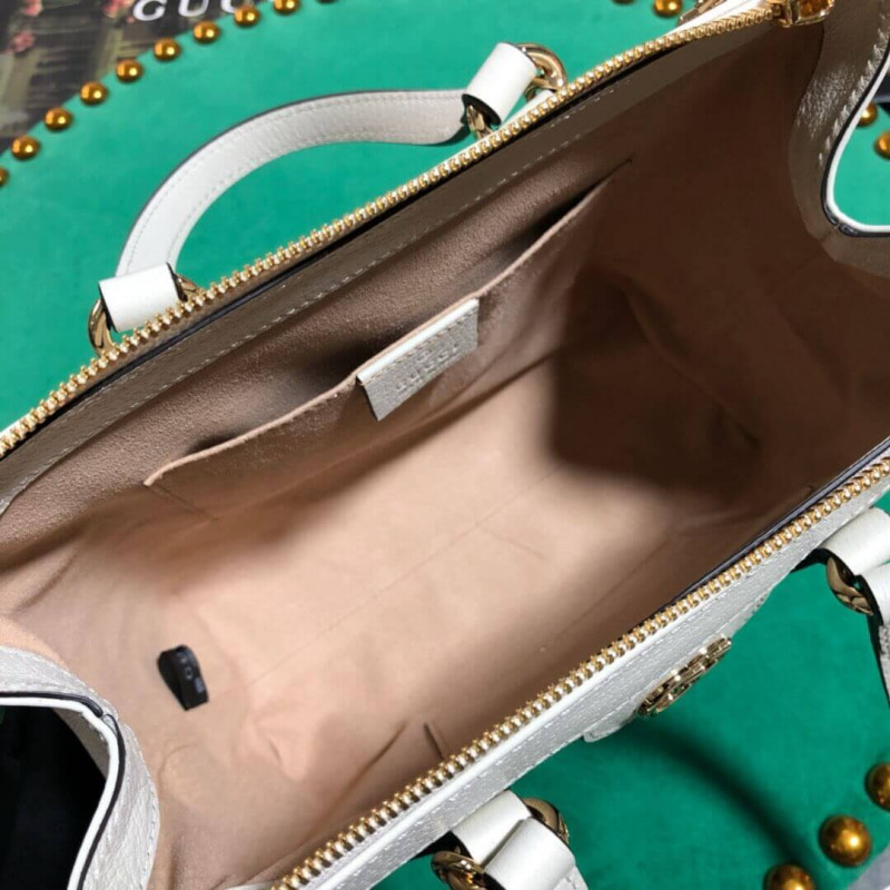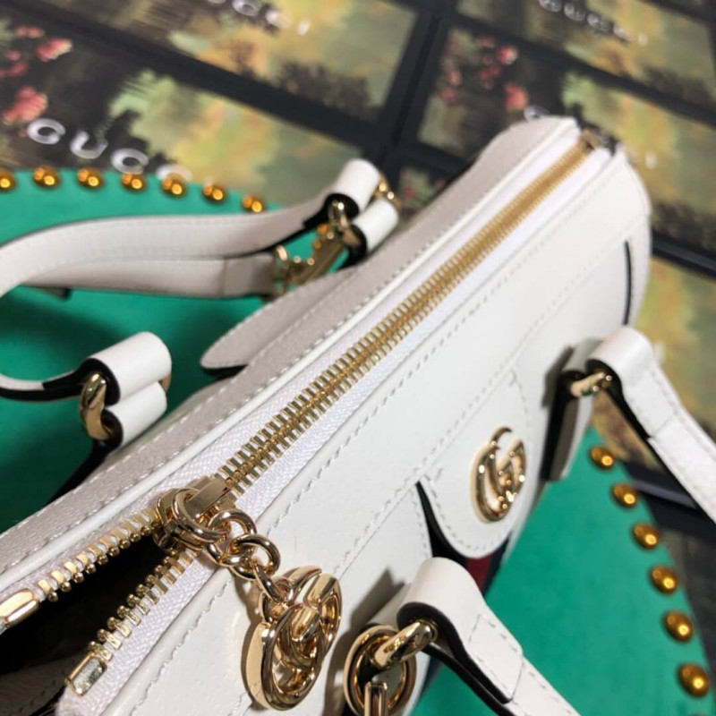The world of Ophidia evolves with the introduction of the small top handle tote in black leather. Equipped with a detachable shoulder strap and inlaid green and red Web stripe, the accessory is enhanced by a petite play on the Double G, an archival Gucci code from the 70s that appears atop a leather tab detail and on the zipper pull.