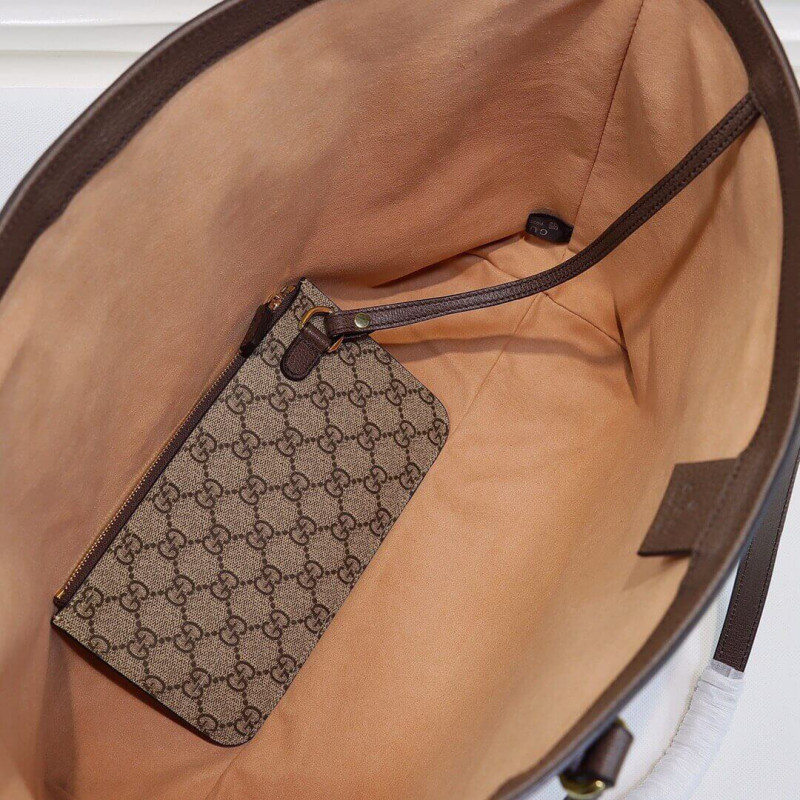 A classic combination of the House s most defining codes—the GG motif and Web stripe—the world of Ophidia continues to evolve, incorporating new shapes and silhouettes each season. With recognizable design elements in a practical new shape, this new medium sized tote is trimmed with textured leather and topped with Double G hardware.