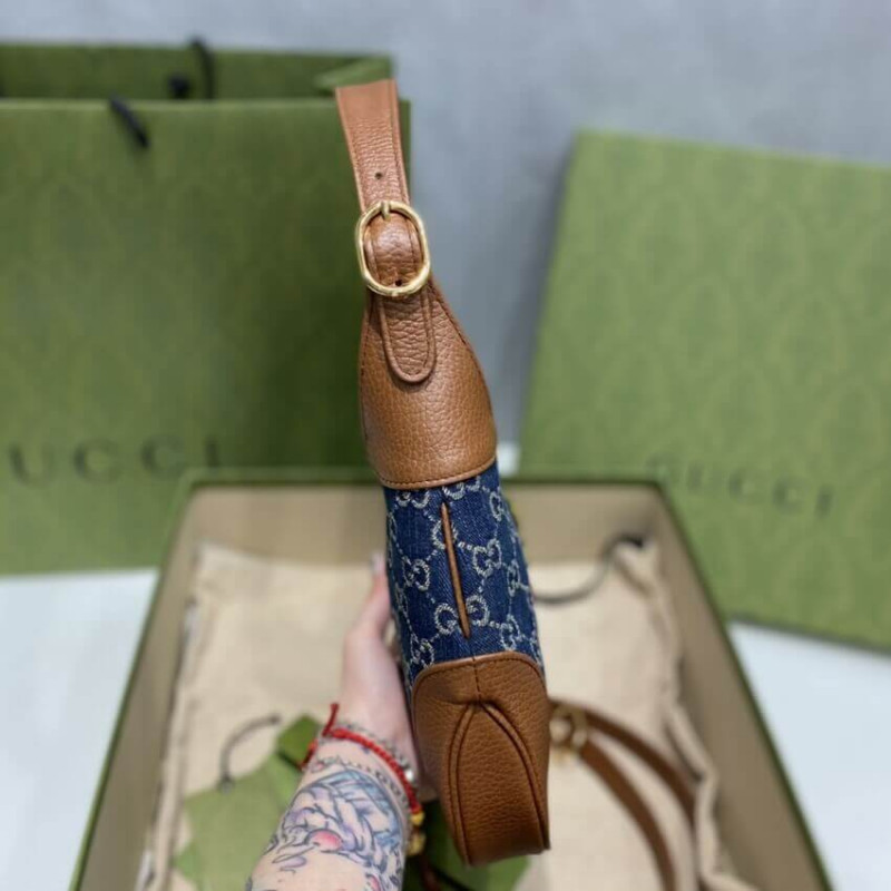Brought back to the forefront, the recognizable shape is presented in denim with a GG motif and enhanced with an additional, detachable shoulder strap. Attached to the bag with a buckle closure, the second strap adds a contemporary feel to the archival style, providing new ways to wear—from top handle, shoulder to cross body. The Jackie 1961: available exclusively in Gucci stores and on Gucci.com