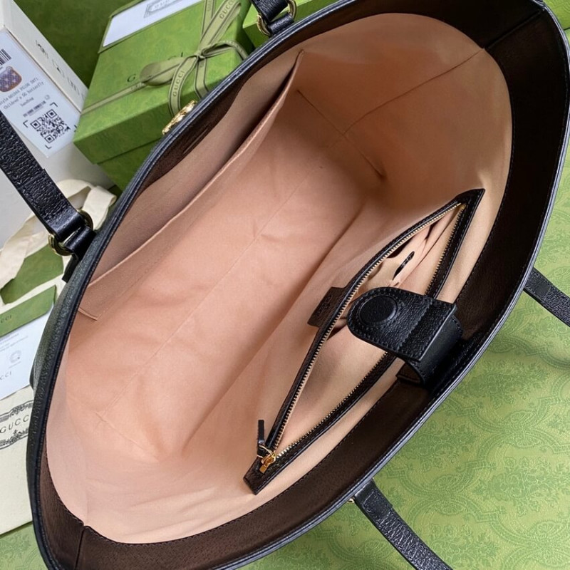 Enriched with vintage details, the world of Ophidia expands with the introduction of a black leather tote. With a softly structured silhouette, the bag pairs two archival details as a tribute to the origins of the House. The Double G is a reference to Guccio Gucci s monogram while the green and red Web stripe is a celebration of the brand s equestrian roots.