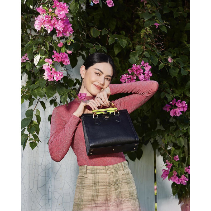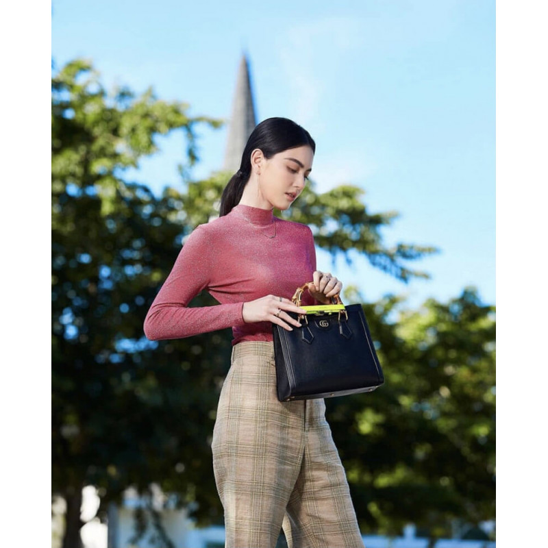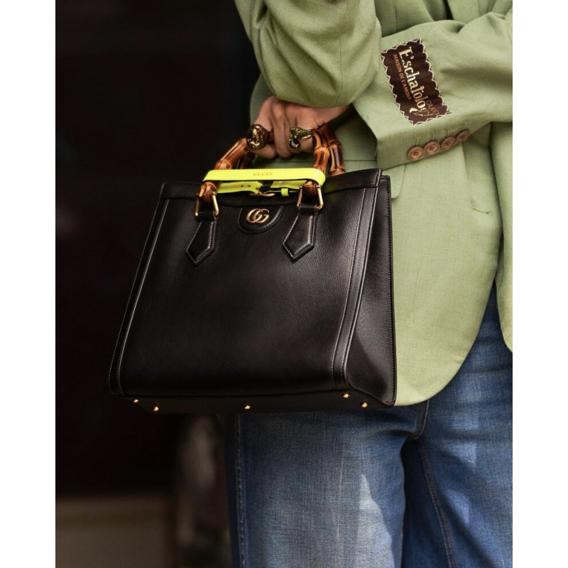Combining recognizable elements of the House, the small tote bag is defined by its bamboo handles and Double G hardware. Crafted from black leather, the accessory is further accentuated by two neon bands, a playful reference to the bands used to keep handles in shape.
