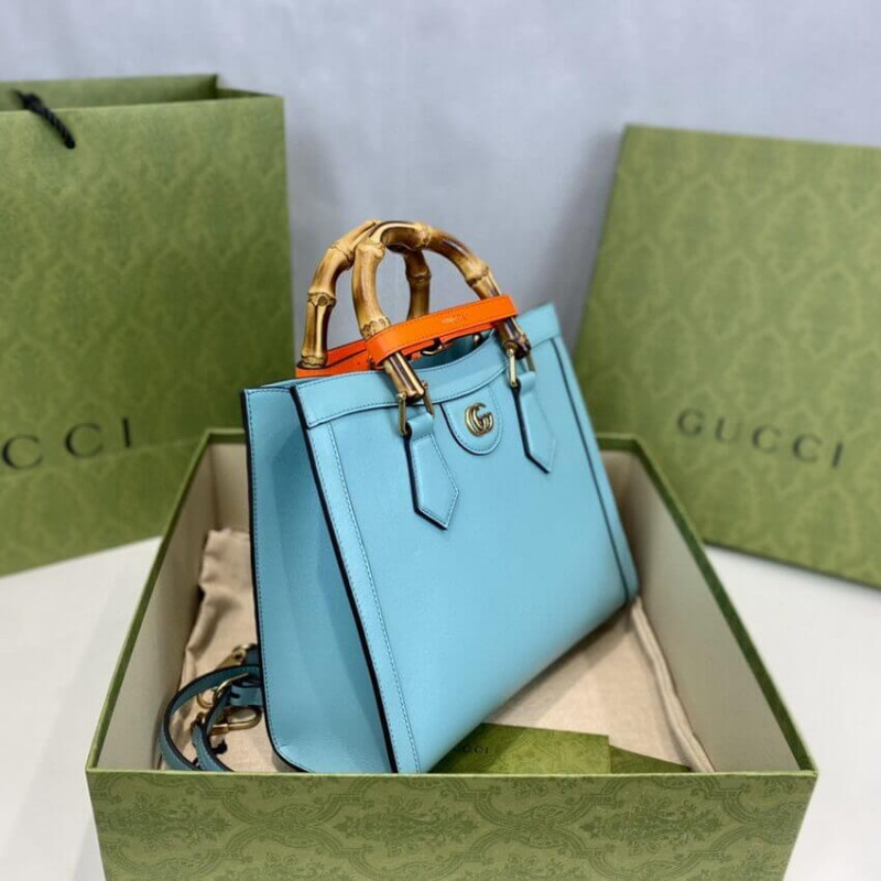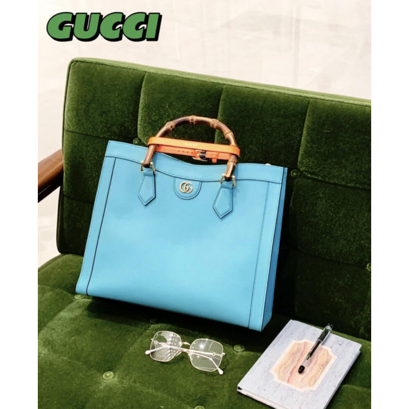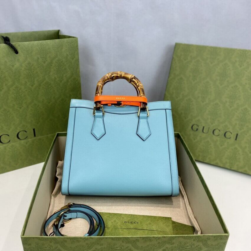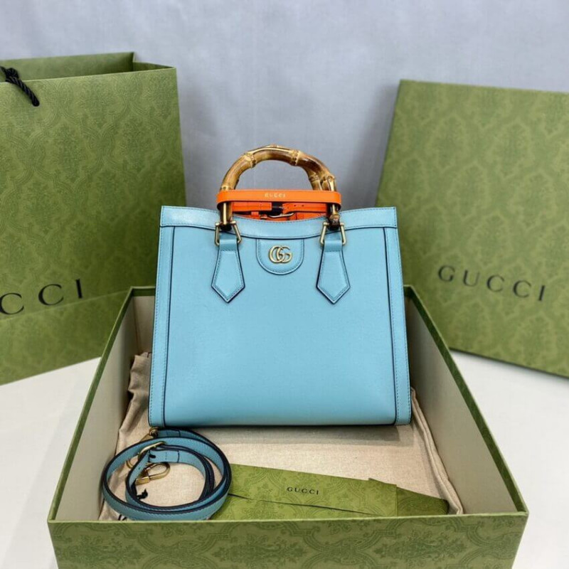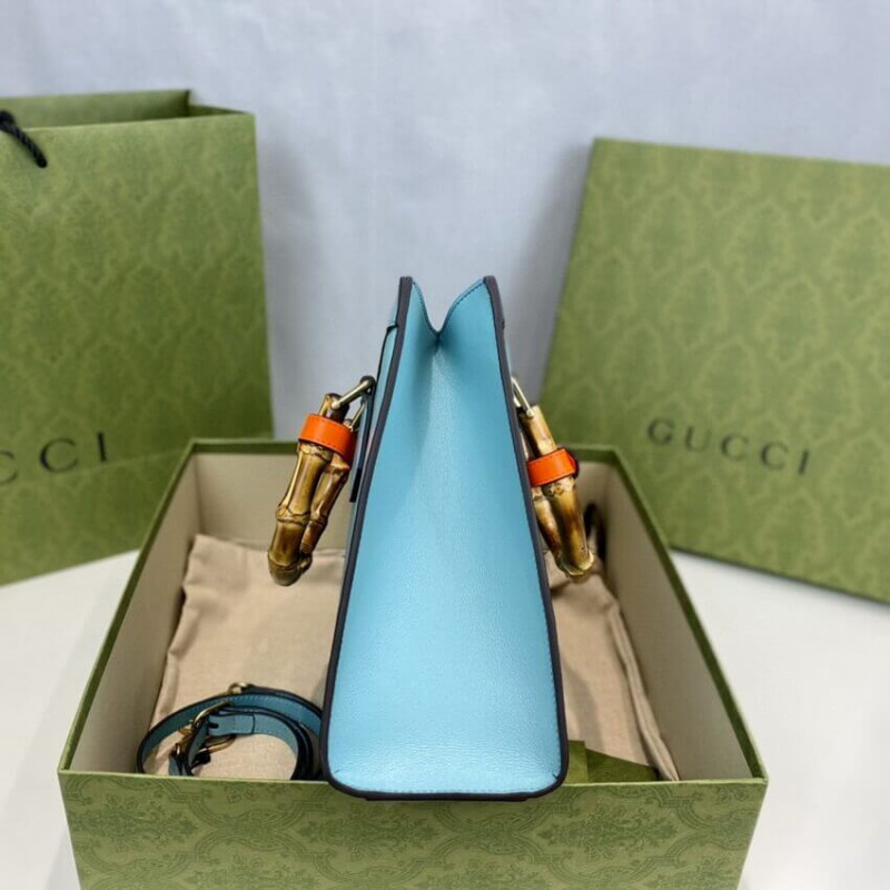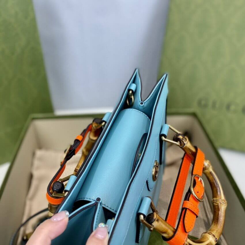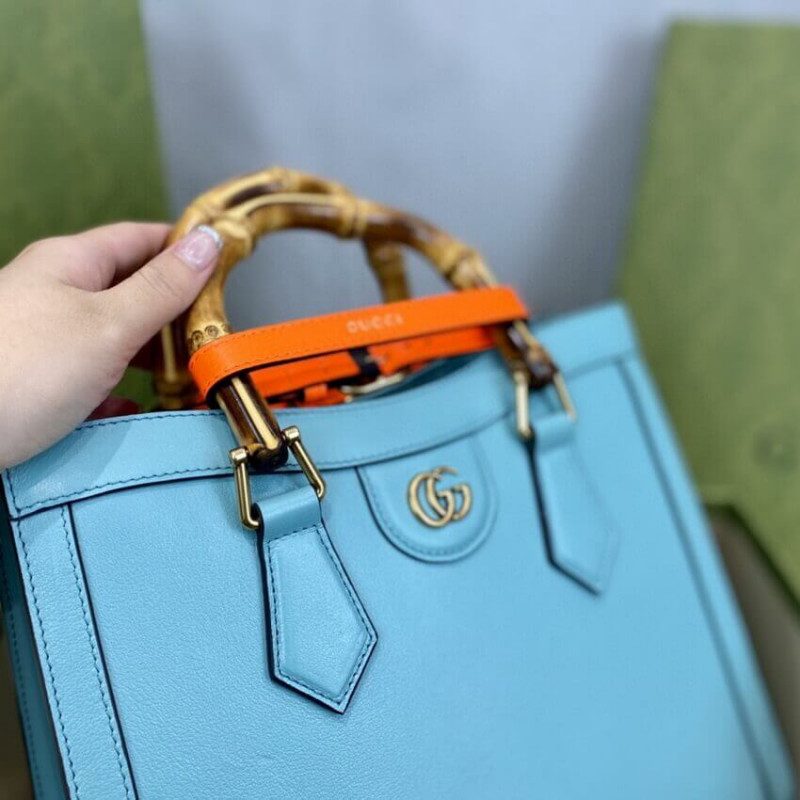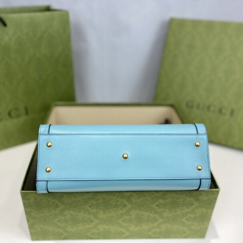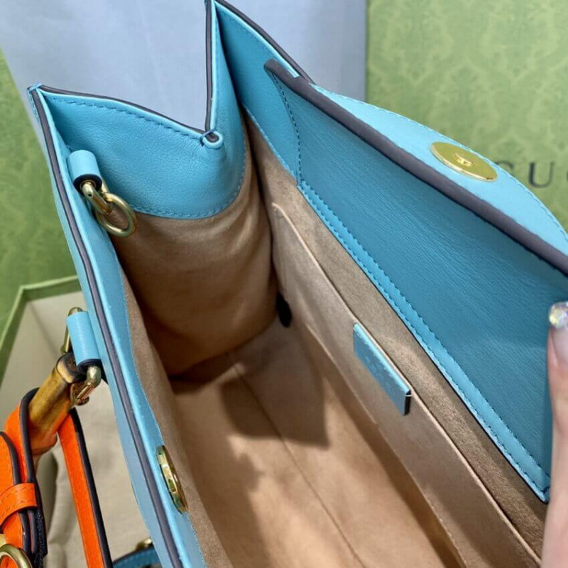 Combining recognizable elements of the House, the small tote bag is defined by its bamboo handles and Double G hardware. Crafted from black leather, the accessory is further accentuated by two neon bands, a playful reference to the bands used to keep handles in shape.