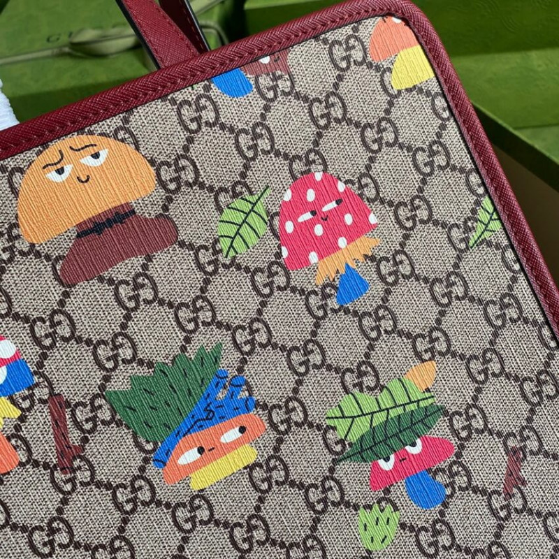 Children s storybooks continue to inspire the House. Here. this children s tote bag pairs the GG monogram motif with a cartoon-inspired woodland print. The joyful pattern features plants from the forest as dancing characters.