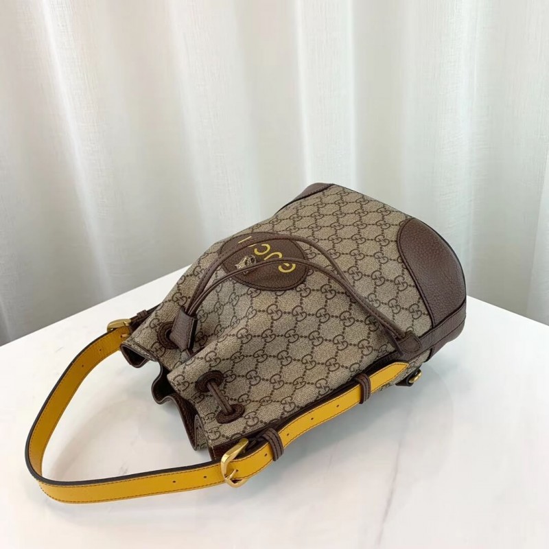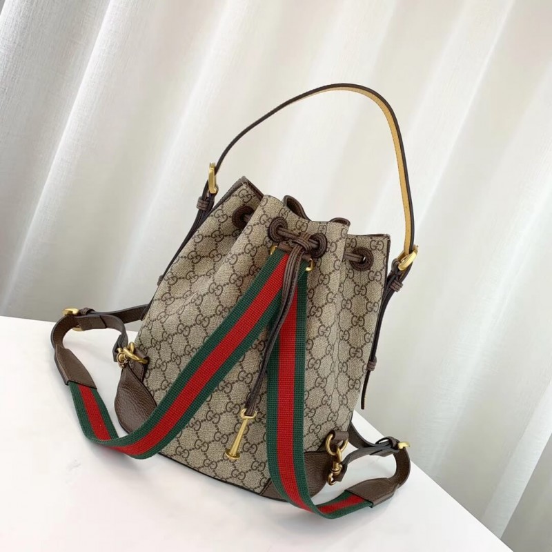 A drawstring backpack with a bucket shape made in soft GG Supreme, crafted from a coated microfiber fabric. The back shoulder straps come with a mechanism that allows them to be released and adjusted to be worn as a shoulder strap. The contrast handle pays homage to the House’s past, when artisans would repair luggage by replacing worn handles with new ones in any colors that were available.