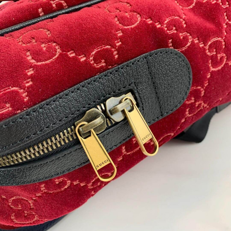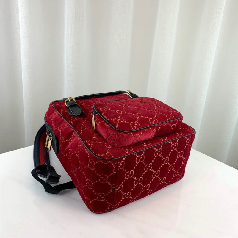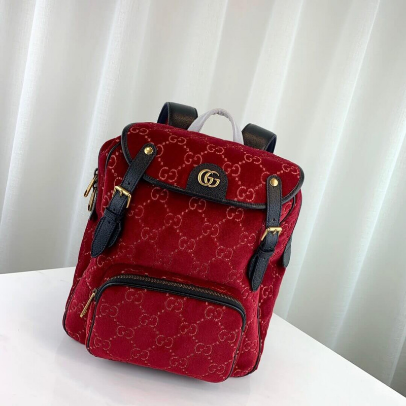 The backpack is presented in a smaller silhouette for Pre-Fall 2019, in dark blue GG velvet with leather trims. The distinctive GG motif is embedded into the soft velvet fabric, contrasted by black leather buckles, trims and gold-toned hardware. The padded leather straps feature a hidden House detail, with the blue and red stripe at the interior.