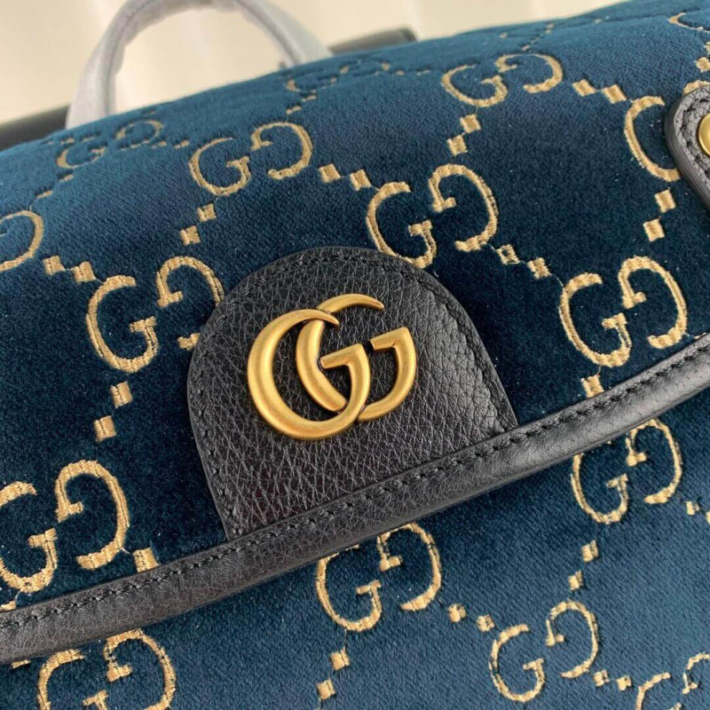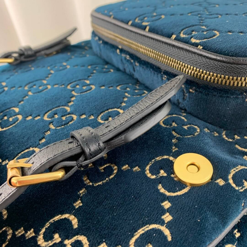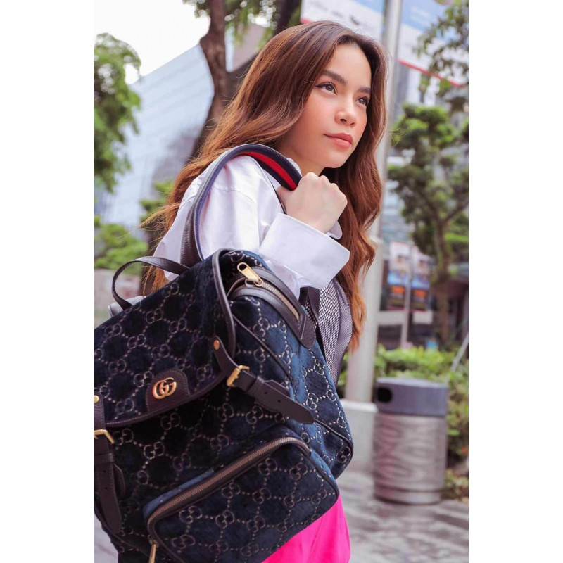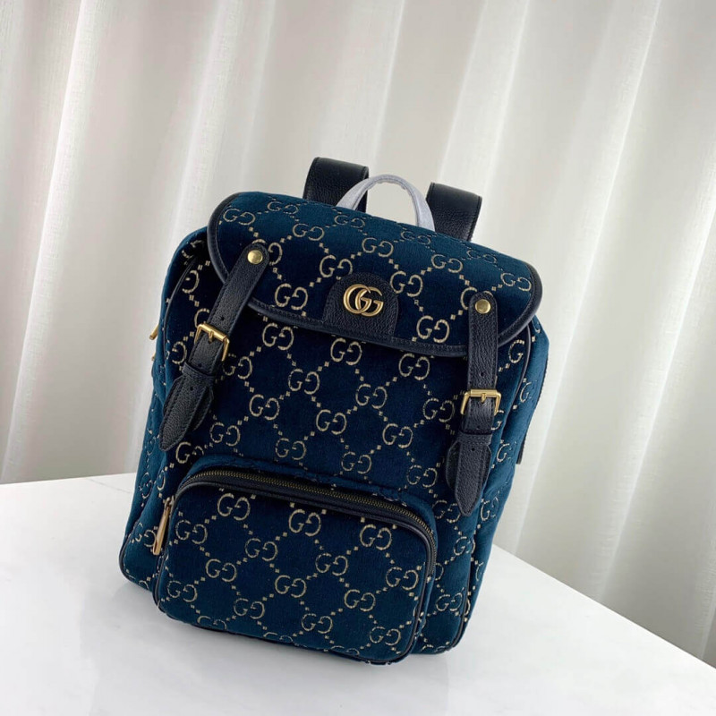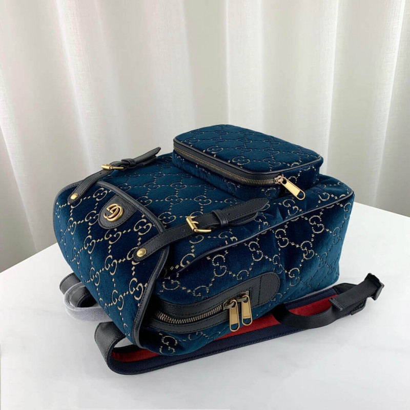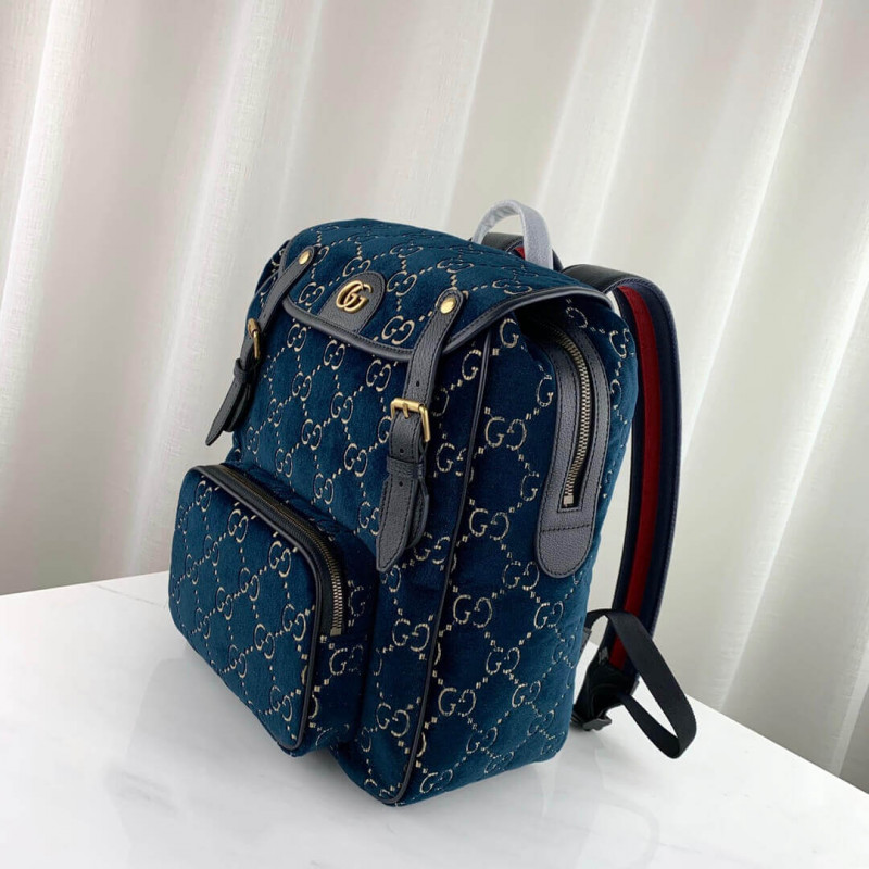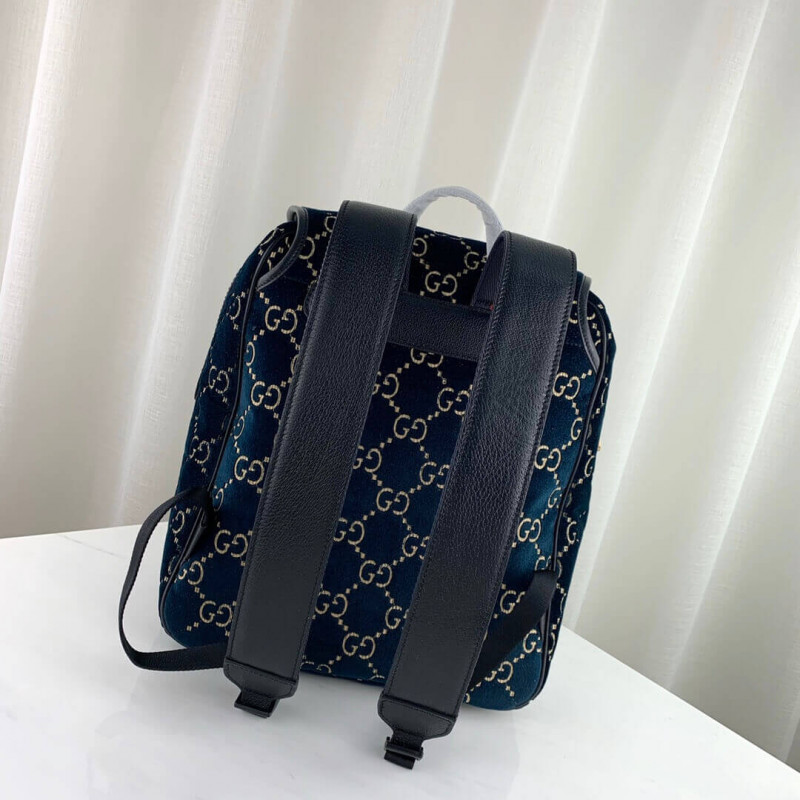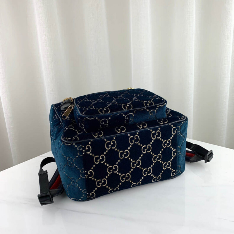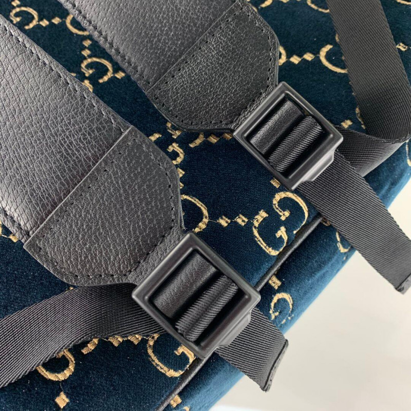 The backpack is presented in a smaller silhouette for Pre-Fall 2019, in dark blue GG velvet with leather trims. The distinctive GG motif is embedded into the soft velvet fabric, contrasted by black leather buckles, trims and gold-toned hardware. The padded leather straps feature a hidden House detail, with the blue and red stripe at the interior.