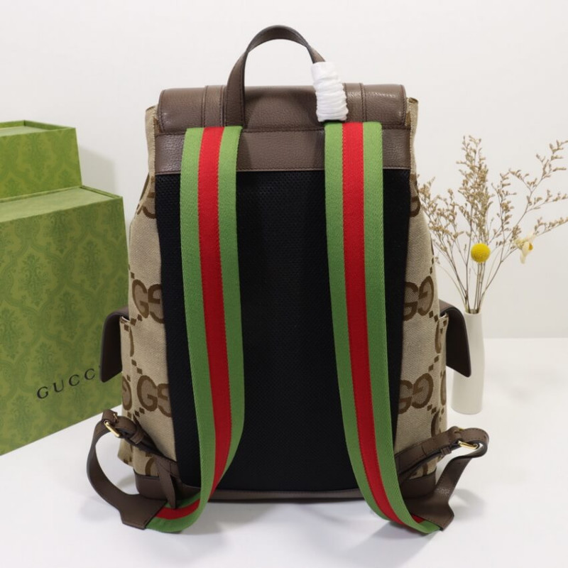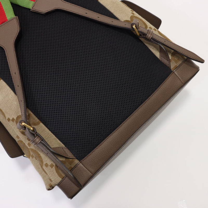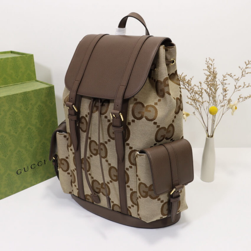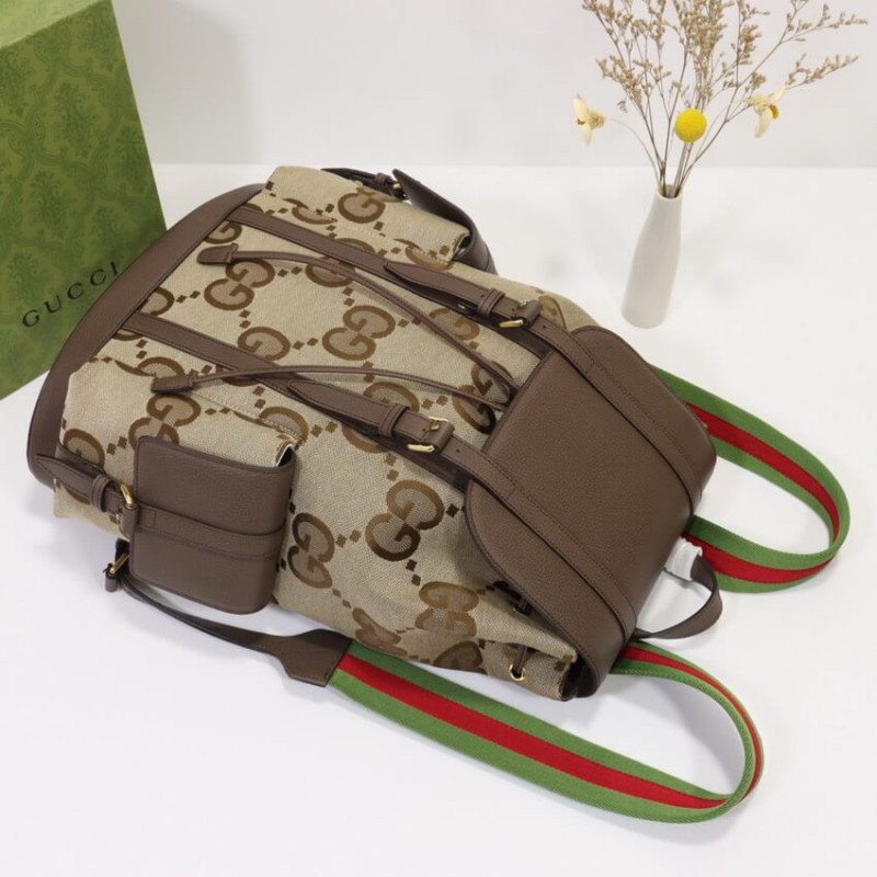 Introduced for the Aria Collection, the GG motif appears in a maximalist, jumbo-sized version atop this backpack. The House s logo symbols continue to be reimagined each season, celebrated in different ways. The accessory is accentuated by a contrasting brown leather trim.- 34 x 42 x 16 cm- Camel and ebony jumbo GG canvas- Brown leather trim- Cotton linen lining- Padded straps- Inside: 1 padded laptop case, 1 open pocket- Outside: 2 pockets with magnetic closure