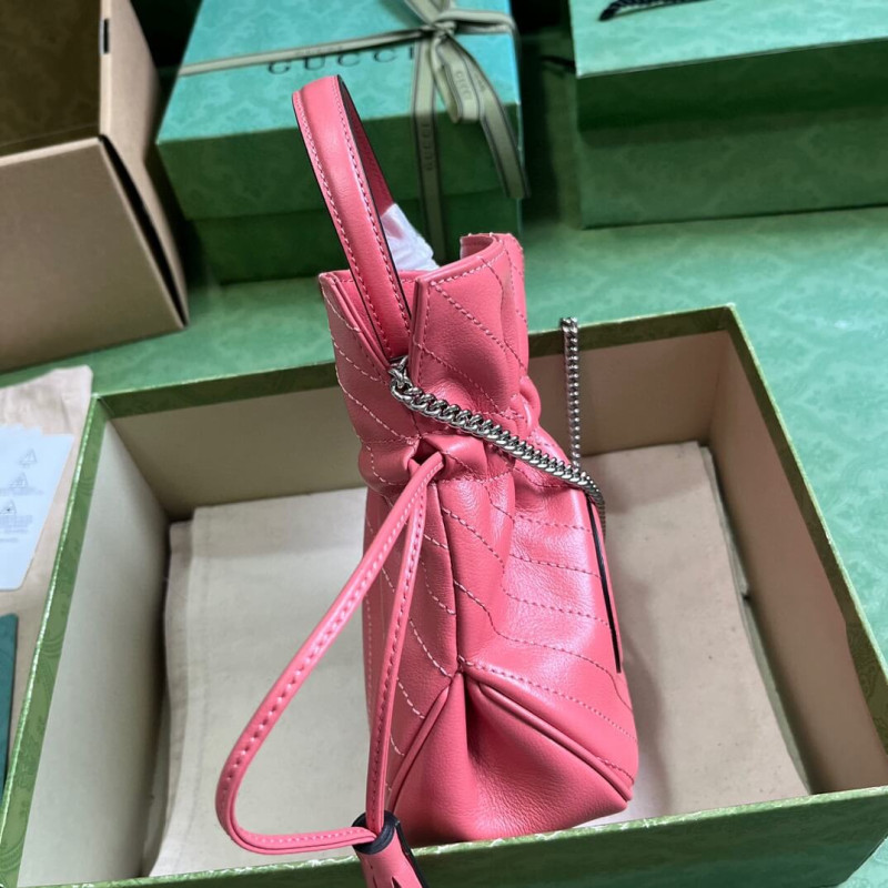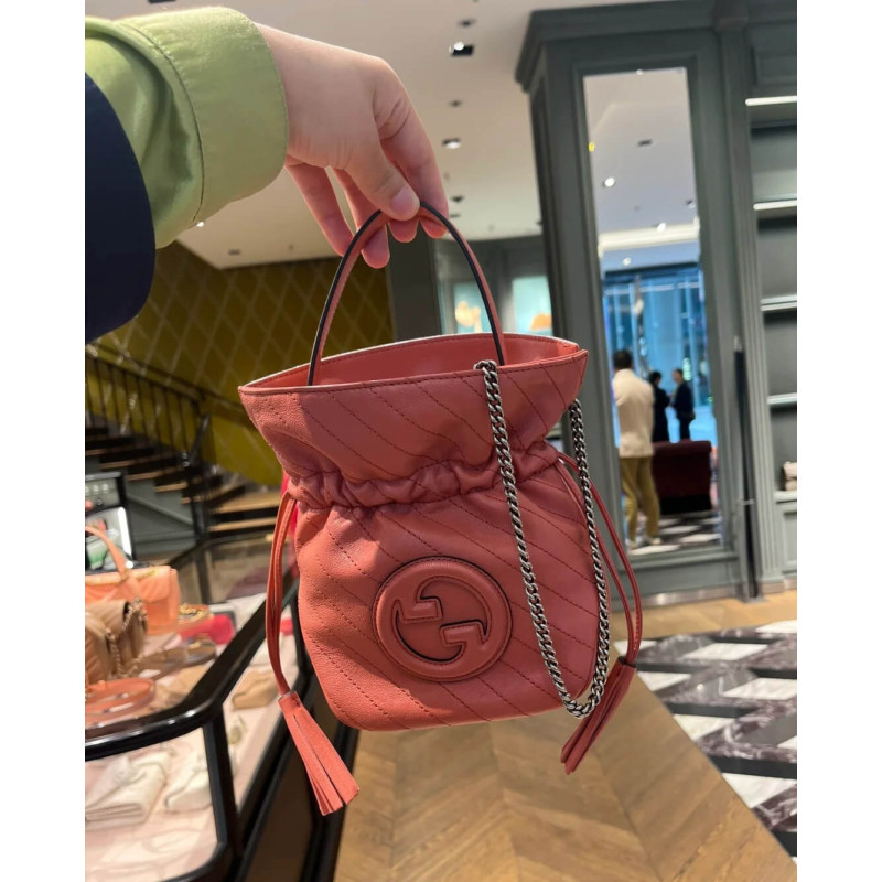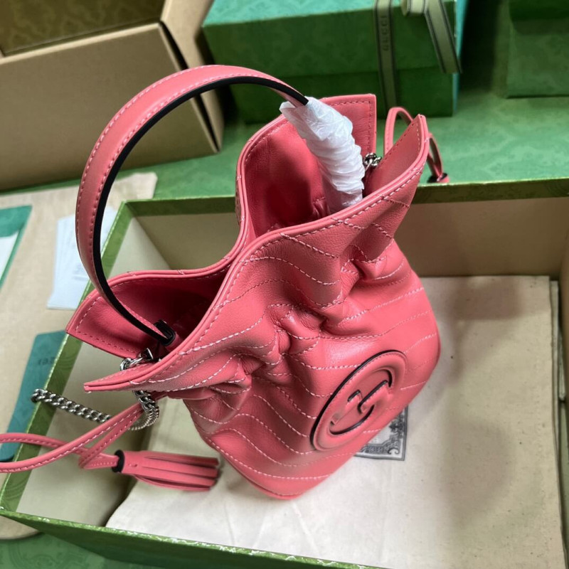 A bold motif of the House, the Gucci Blondie continues to exude subtle style, thanks to its tonal leather appearance. Formed from a rounded geometric version of the Interlocking G, the line exemplifies Gucci s contemporary design. The logo detail defines this mini bucket bag in pink leather with tassel details.