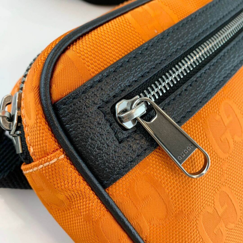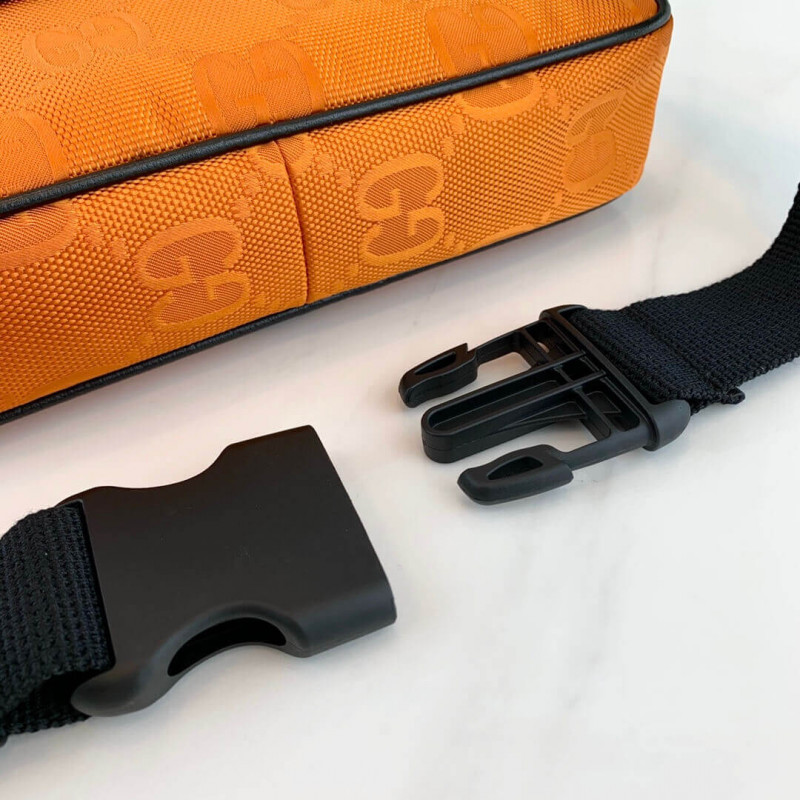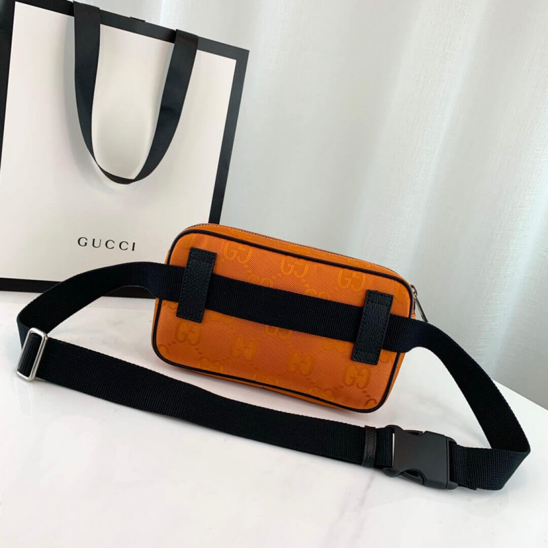 A line of accessories and ready-to-wear is presented for Pre-Fall 2020 made from recycled materials and trims, supporting the House s commitment to sustainability. Gucci Off The Grid is the first collection from Gucci Circular Lines—a concept created to support the House s vision for circular production. Designed for those mindful of their environmental impact, Gucci Off The Grid uses recycled, organic, bio-based and sustainably sourced materials. Regenerated nylon, crafted using recycled sewing thread and trims displays the GG pattern against an opaque background in black. The belt bag is completed with an adjustable buckle closure and front zipper pocket.