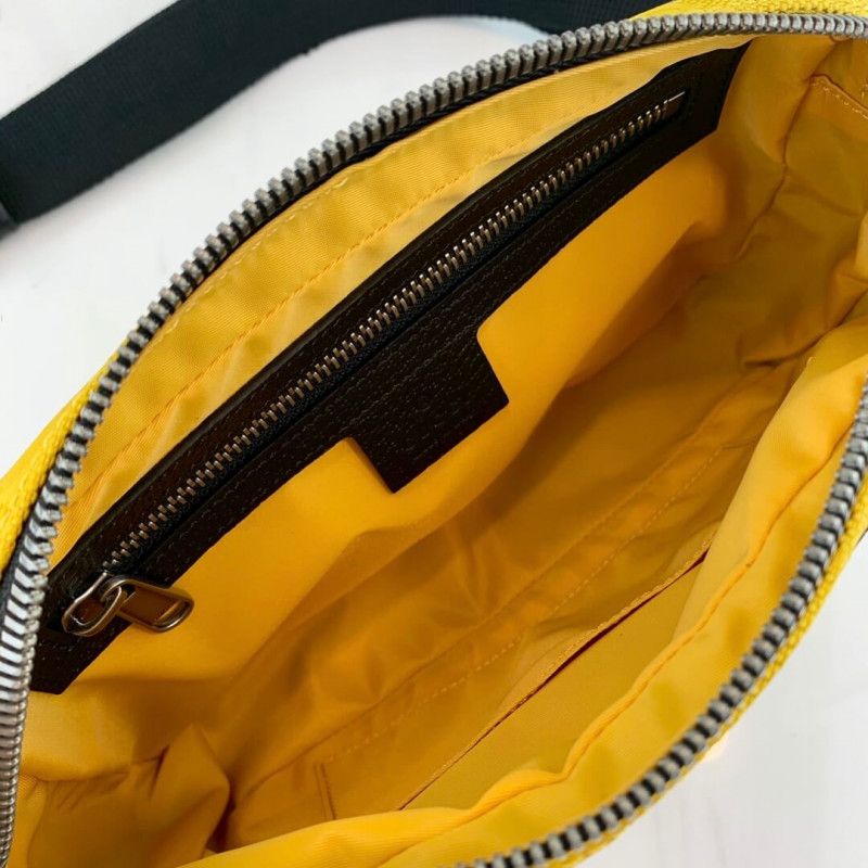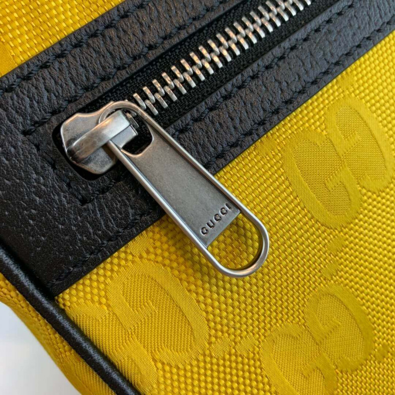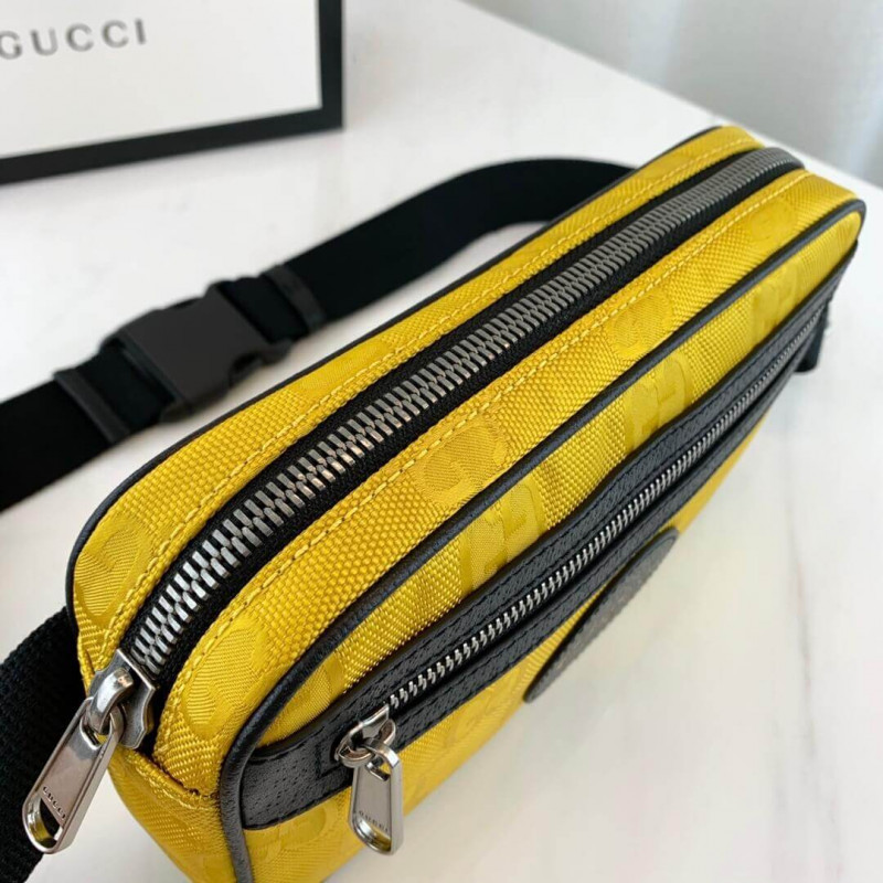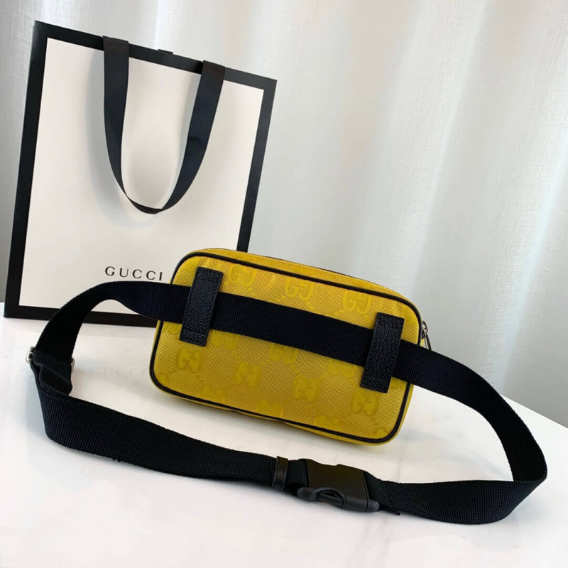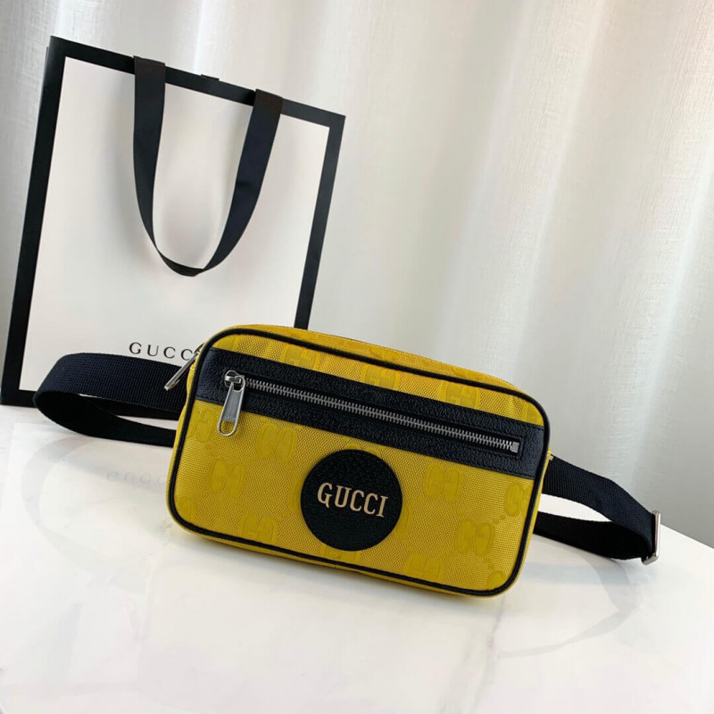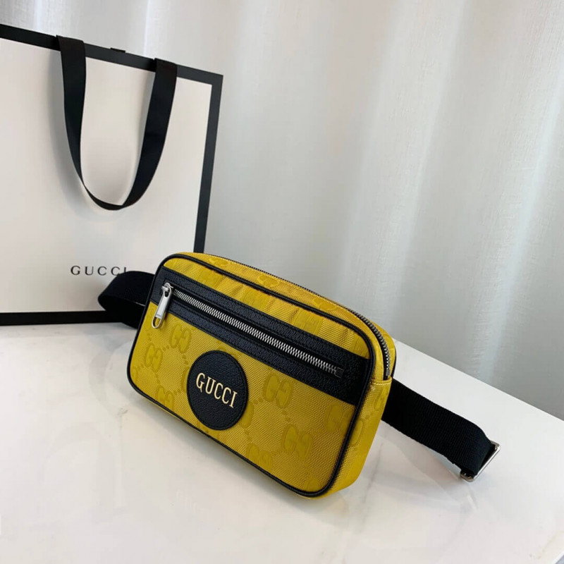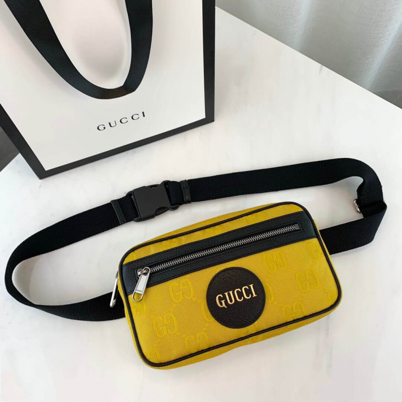 A line of accessories and ready-to-wear is presented for Pre-Fall 2020 made from recycled materials and trims, supporting the House s commitment to sustainability. Gucci Off The Grid is the first collection from Gucci Circular Lines—a concept created to support the House s vision for circular production. Designed for those mindful of their environmental impact, Gucci Off The Grid uses recycled, organic, bio-based and sustainably sourced materials. Regenerated nylon, crafted using recycled sewing thread and trims displays the GG pattern against an opaque background in black. The belt bag is completed with an adjustable buckle closure and front zipper pocket.