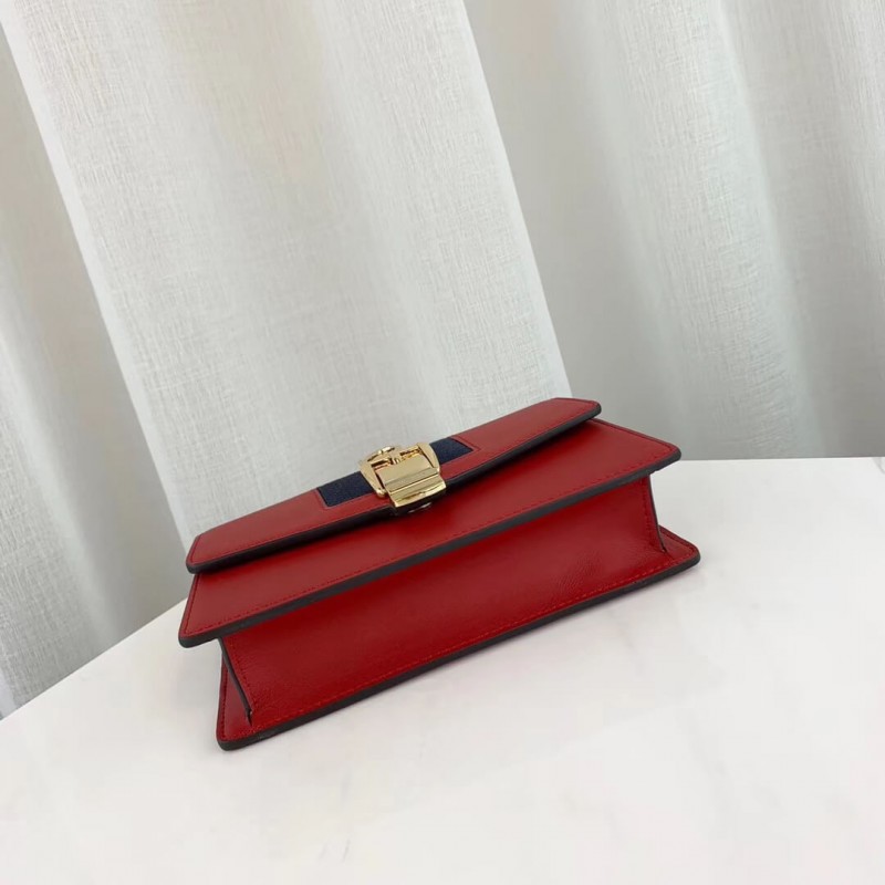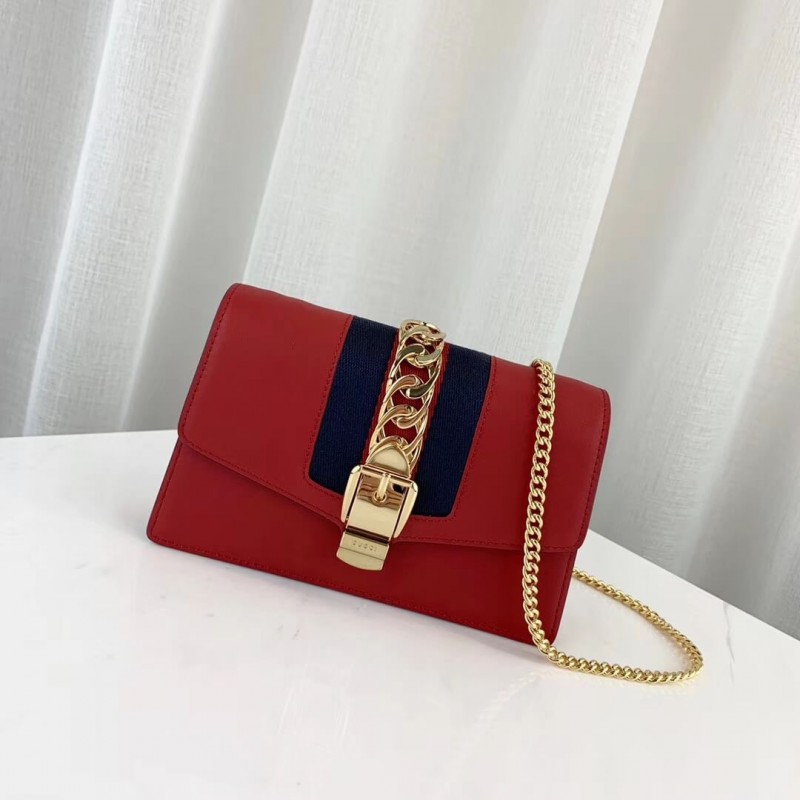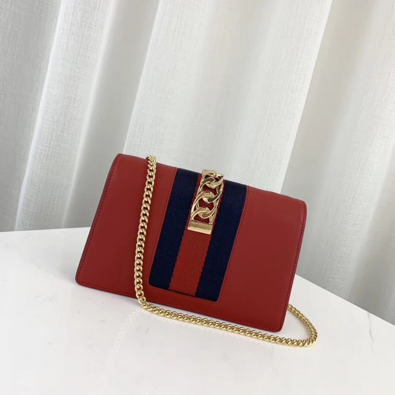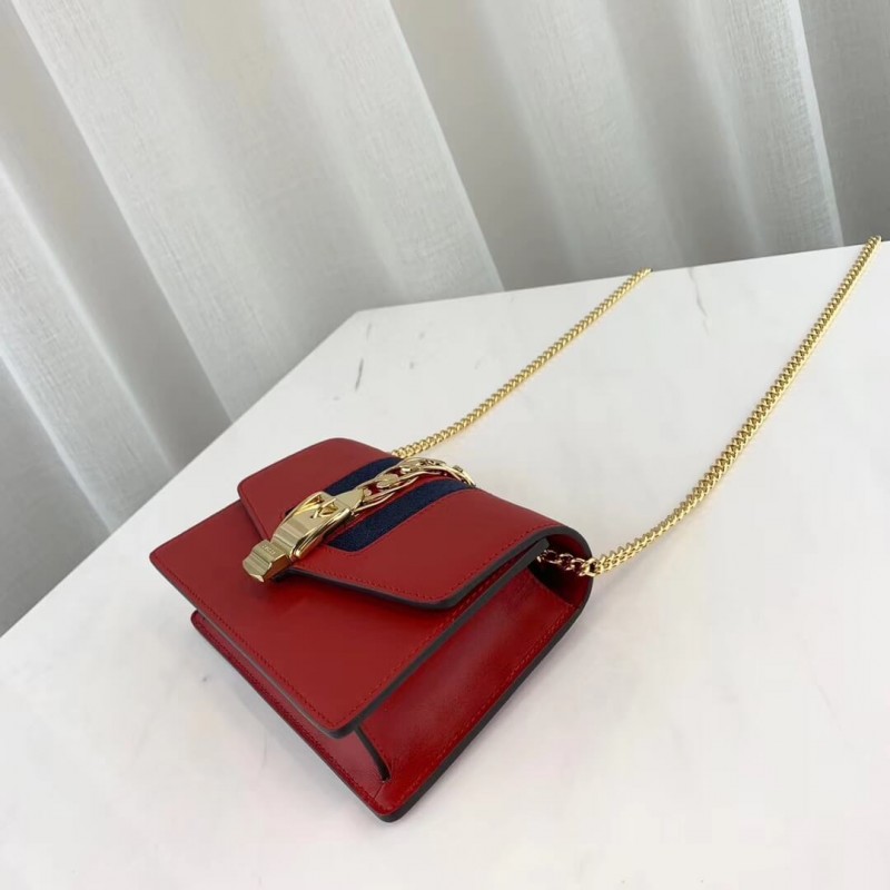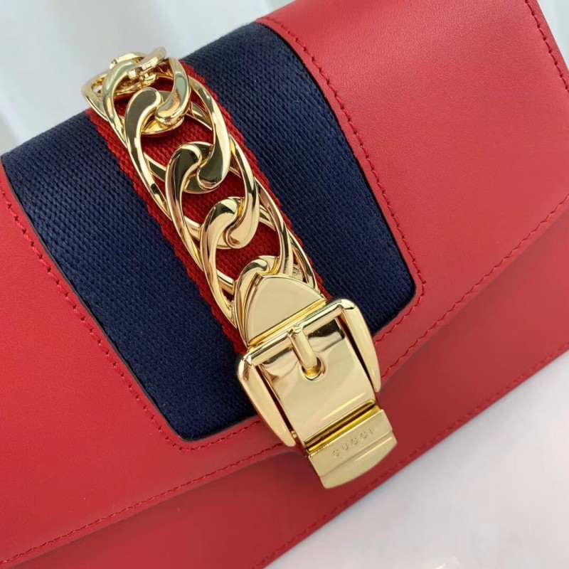 he Sylvie mini chain bag features the nylon Web embedded under the leather and decorated with a gold chain and buckle. The metal buckle closure was taken from the House’s archives. Made in our smooth, classic leather.