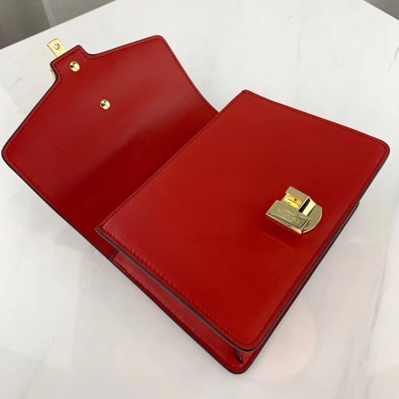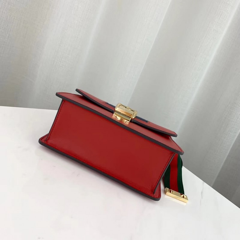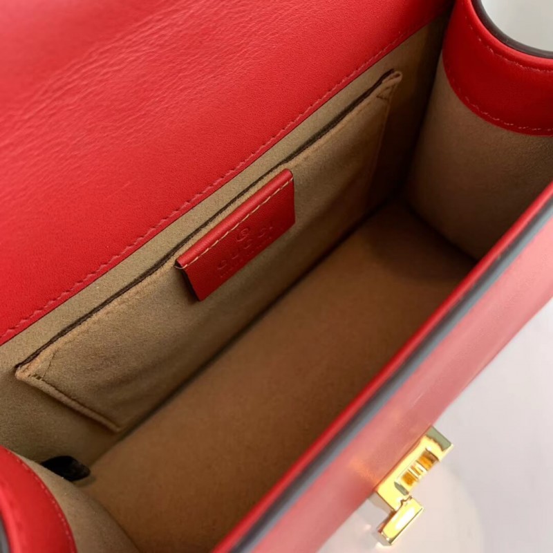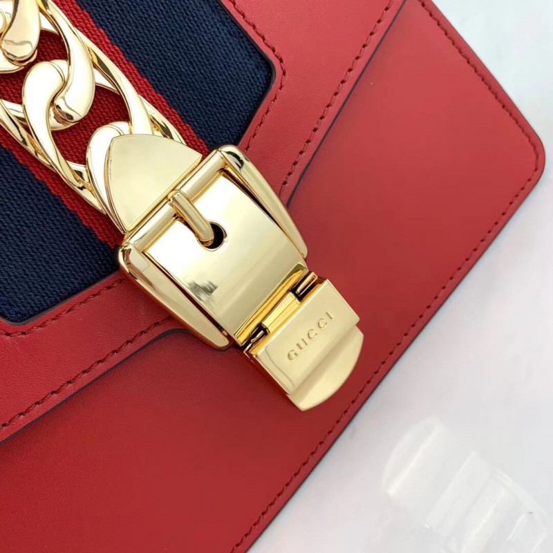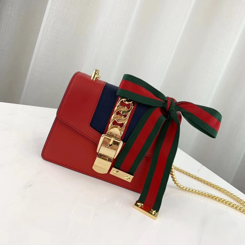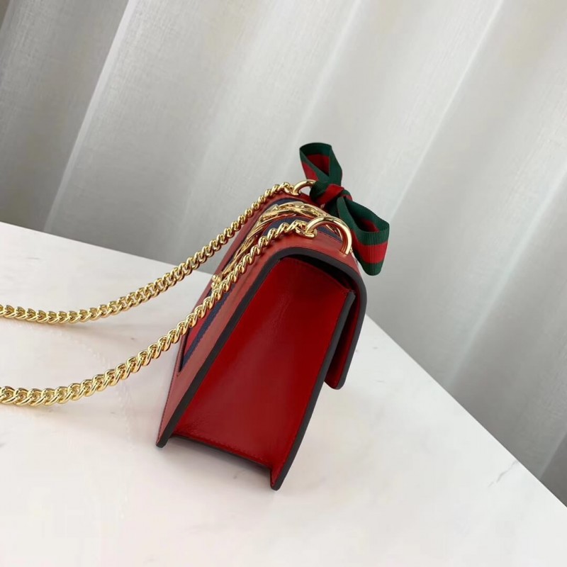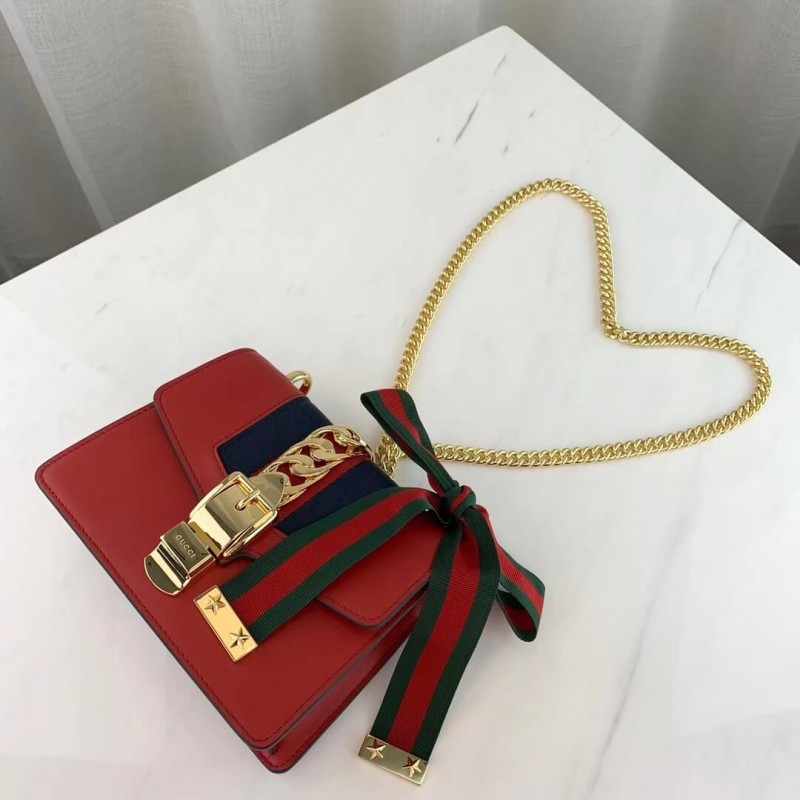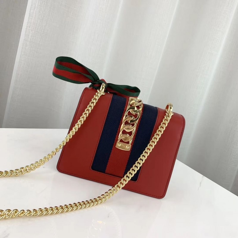 Our Sylvie bag in a mini structured shape with a chain shoulder strap and grosgrain Web bow. The nylon Web is embedded under the leather and decorated with a gold-toned chain and buckle. Made in our smooth, classic leather.