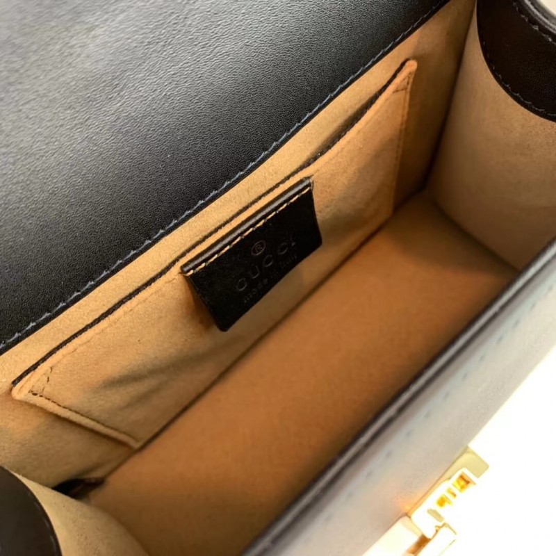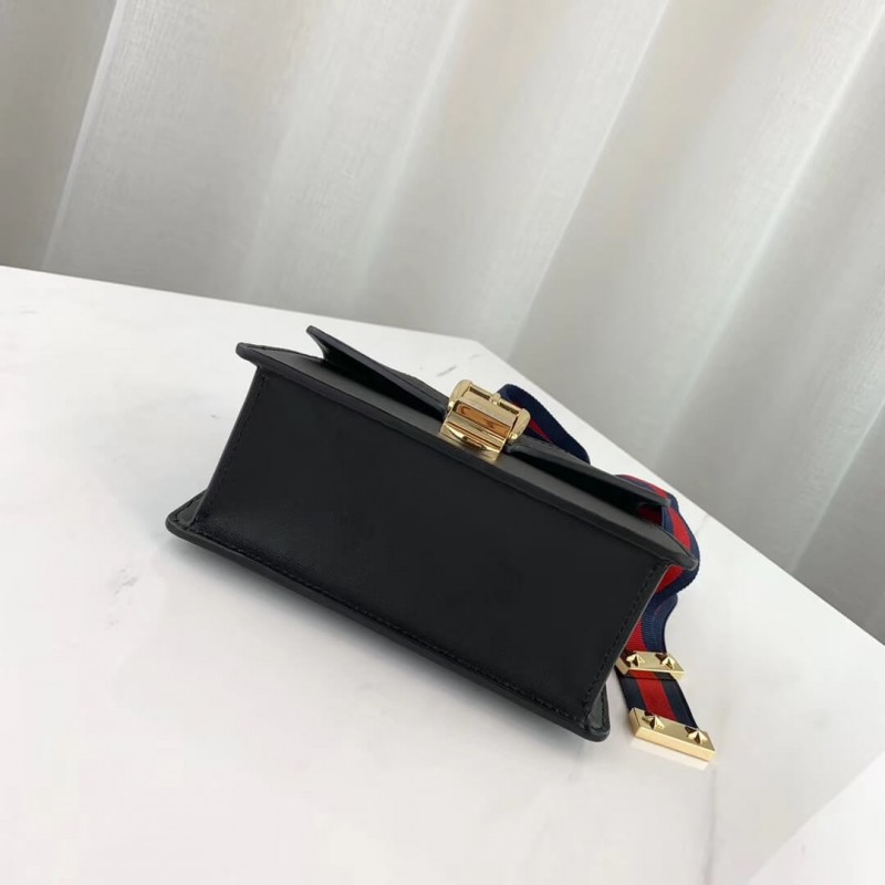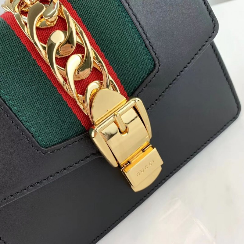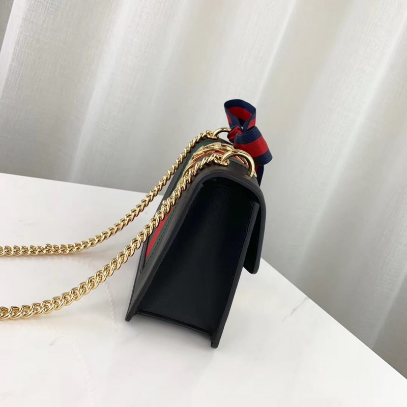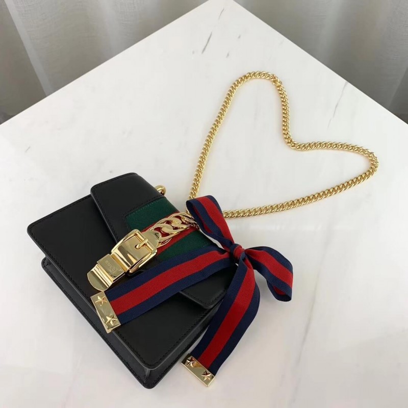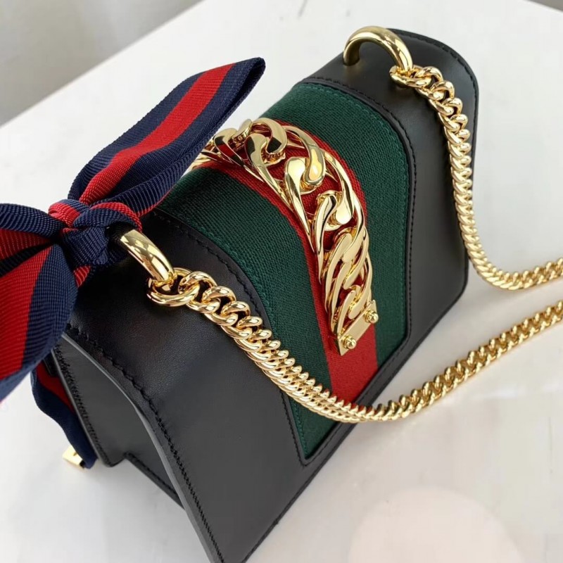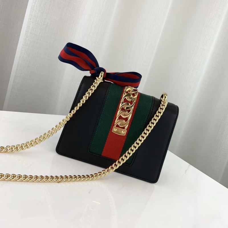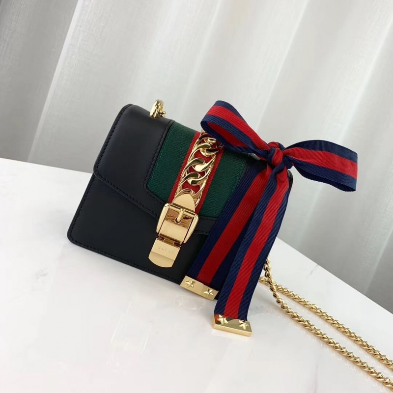 Our Sylvie bag in a mini structured shape with a chain shoulder strap and grosgrain Web bow. The nylon Web is embedded under the leather and decorated with a gold-toned chain and buckle. Made in our smooth, classic leather.