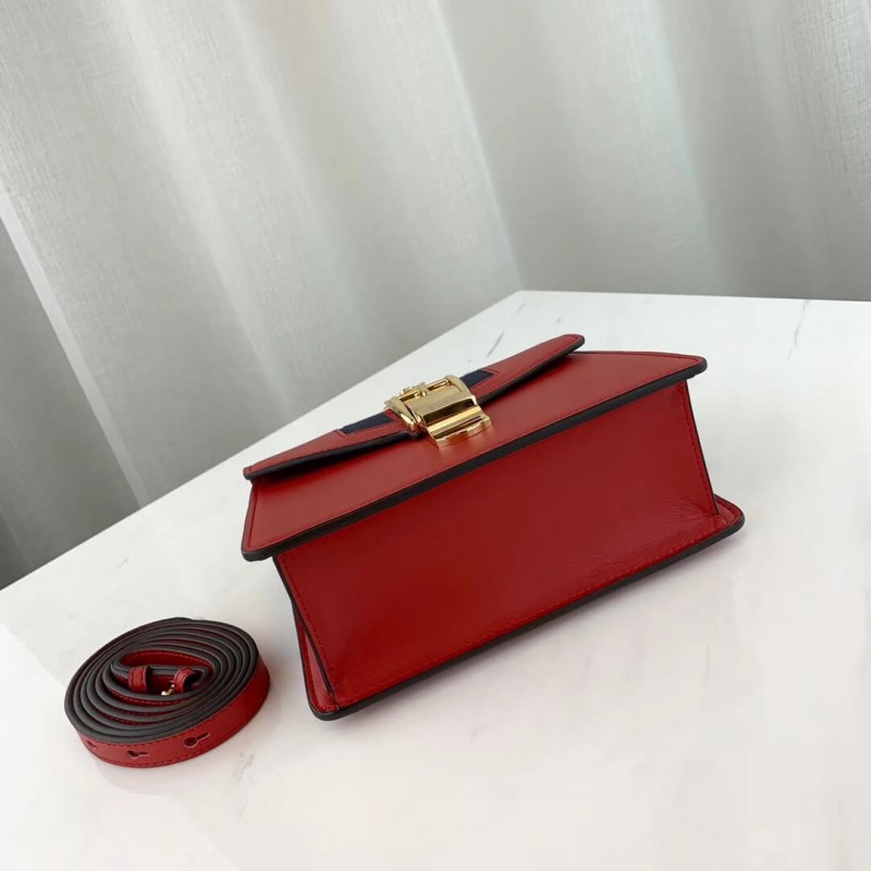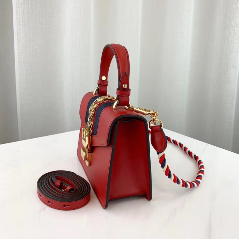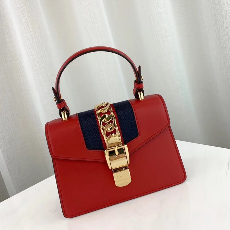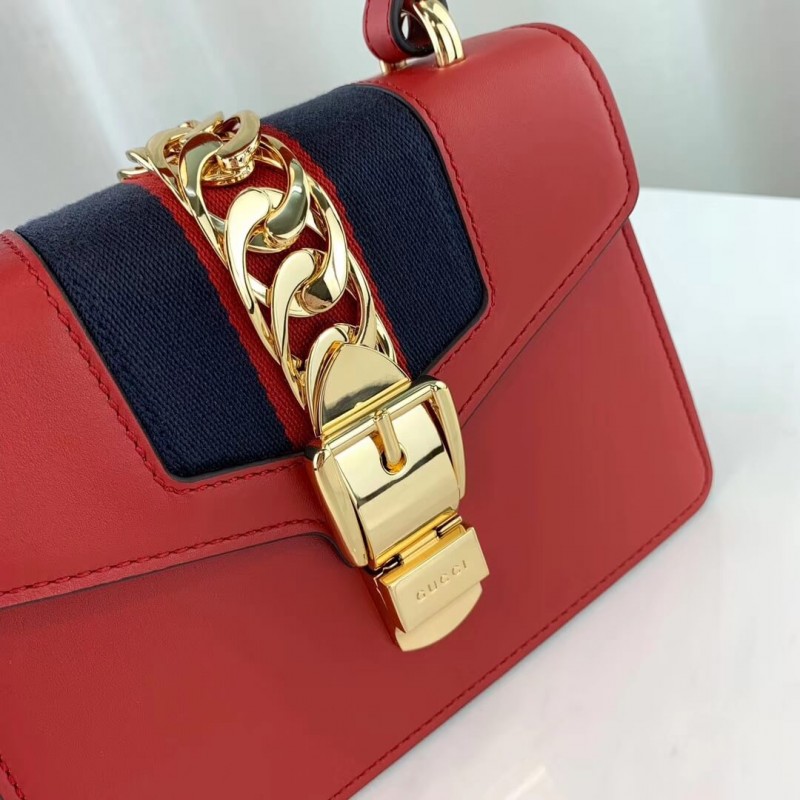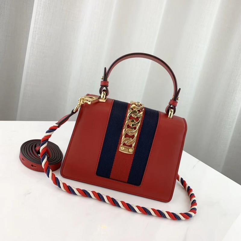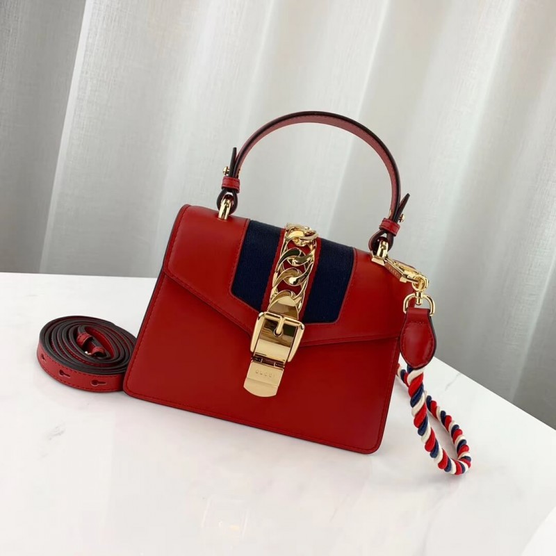 The Sylvie mini bag in a top handle shape with nylon Web embedded under the fabric and decorated with a gold chain and buckle.