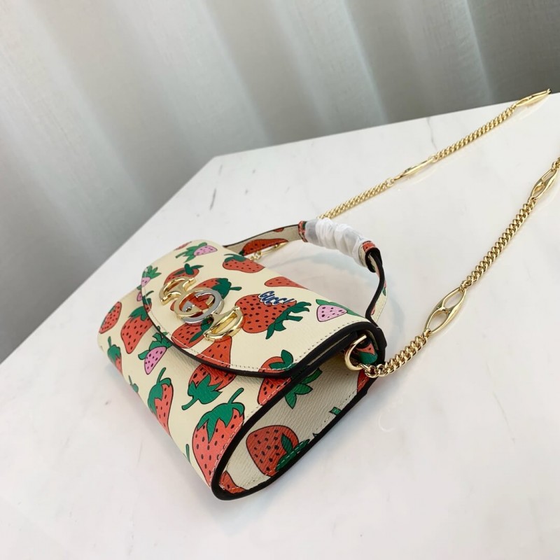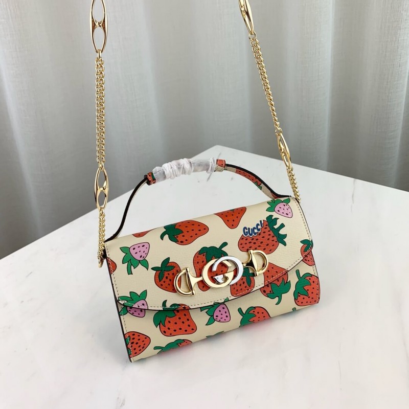 Presented on ivory leather, the Gucci Strawberry print walked the Spring Summer 2019 runway, evoking a vintage 70s feel. Shown on the small shoulder bag, it s contrasted with the Interlocking G Horsebit in a modern mix of silver and gold tones. The bag can be carried cross body, used as a clutch when the chain is removed and worn as a top handle when the leather handle is extended. Introduced in the evocative setting of the Théâtre Le Palace in Paris, the Gucci Zumi line takes its name from actress and experimental musician Zumi Rosow, who walked the Spring Summer 2019 runway carrying the bag.