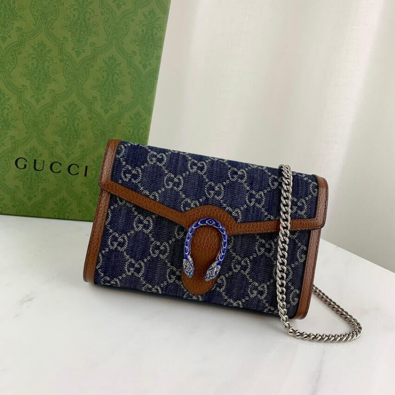 A part of the Epilogue collection, the mini Dionysus chain bag is presented with a strong logo feel in GG eco washed organic jacquard. Continuing to frame House codes in new ways, the bag s emblematic tiger head closure is enriched with vibrant blue enamel which complements the denim s dark shade. The style is completed by a contrasting leather trim.