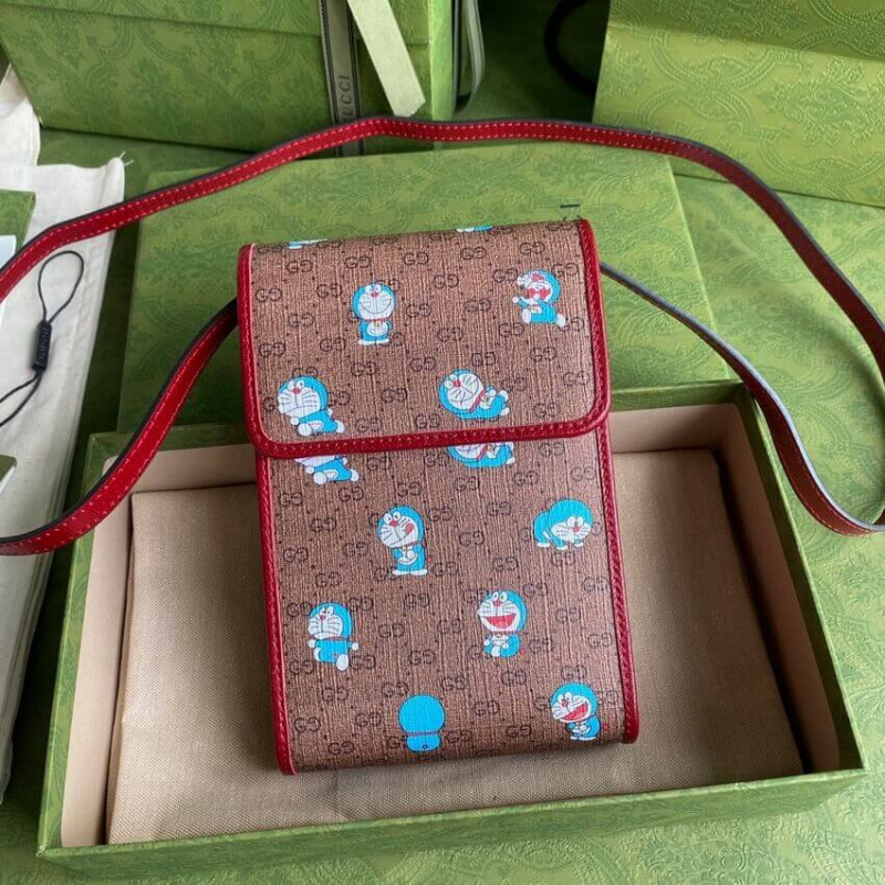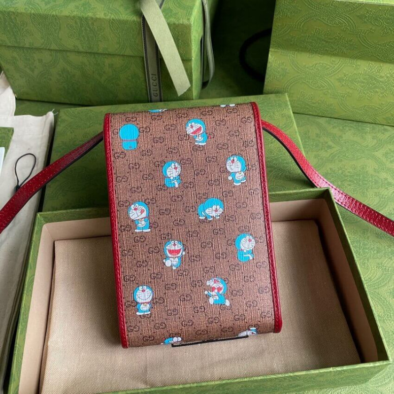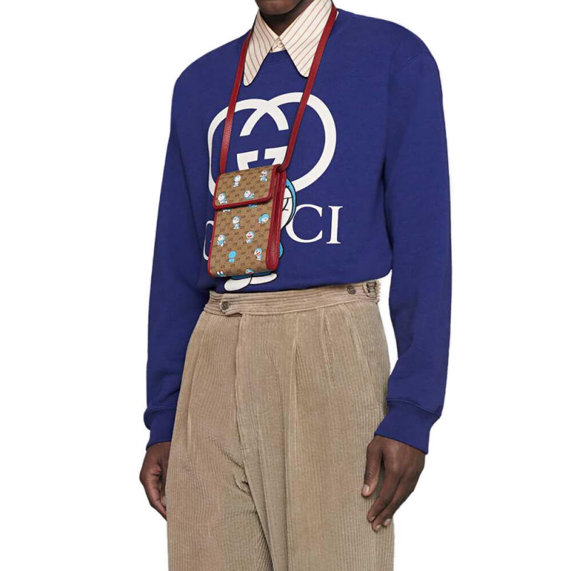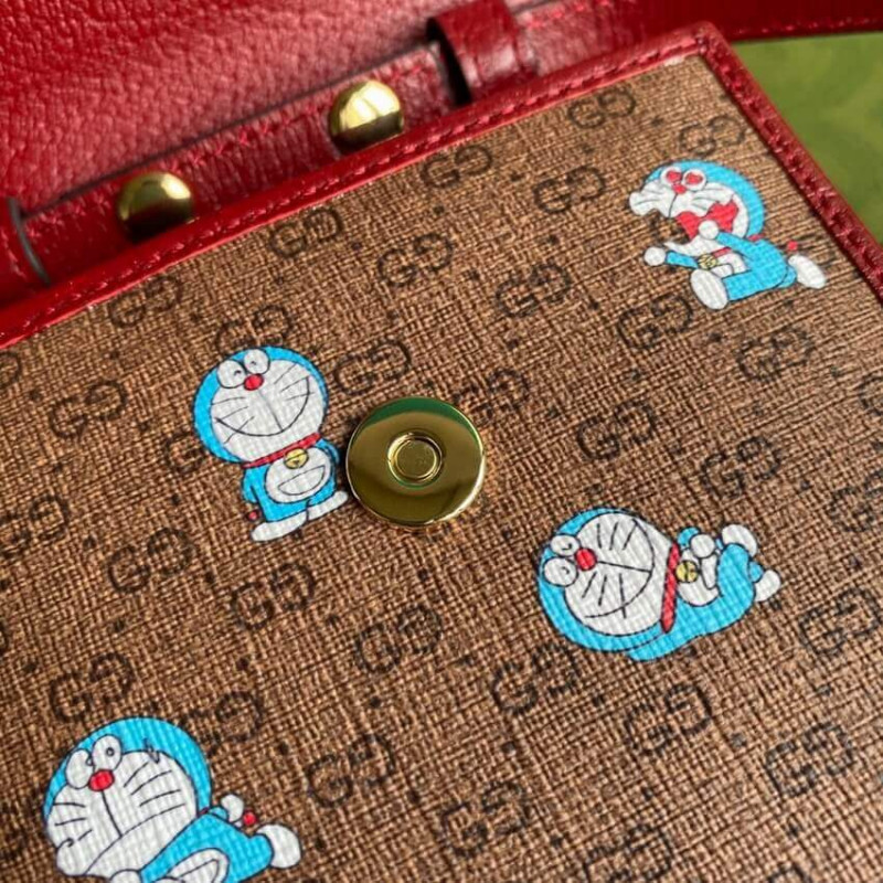 This bag is part of a special collaboration between Doraemon and Gucci. Born on September 3rd, 2112, a cat-type robot was sent from the 22nd century to help a young boy called Nobita with secret gadgets from his four-dimensional pouch. A playful character, Doraemon hates mice and loves Dorayaki, a sweet pancake.