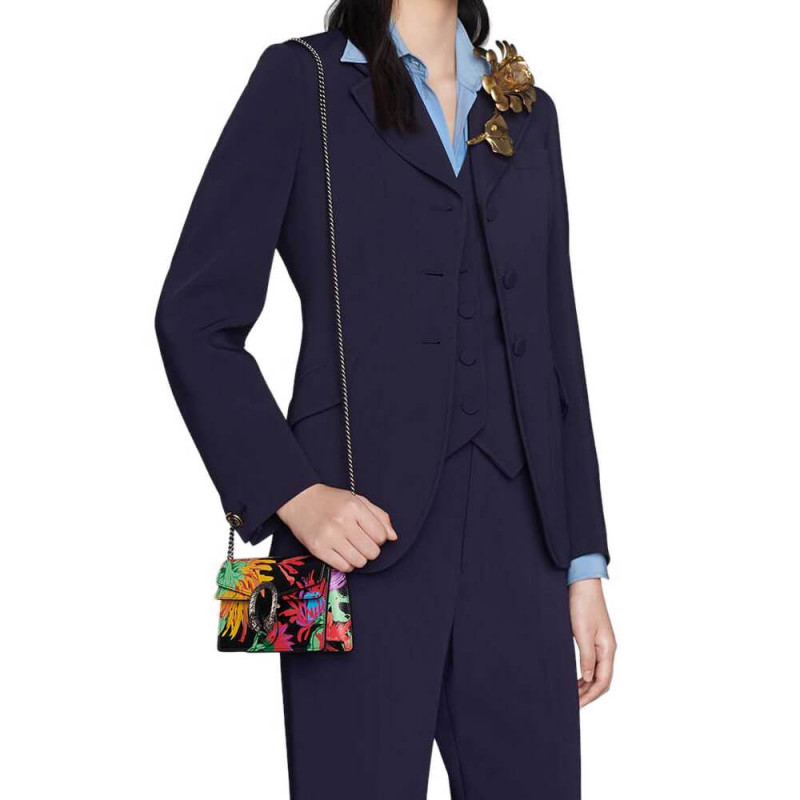 A bright botanical print by Ken Scott animates this mini shoulder bag. Nicknamed the ‘Fashion Gardener,’ Ken Scott was an American designer who lived in Milan in the ‘60s and ‘70s and whose colourful floral drawings were reflective of his eclectic personality. The Dionysus is completed by its signature tiger head closure.