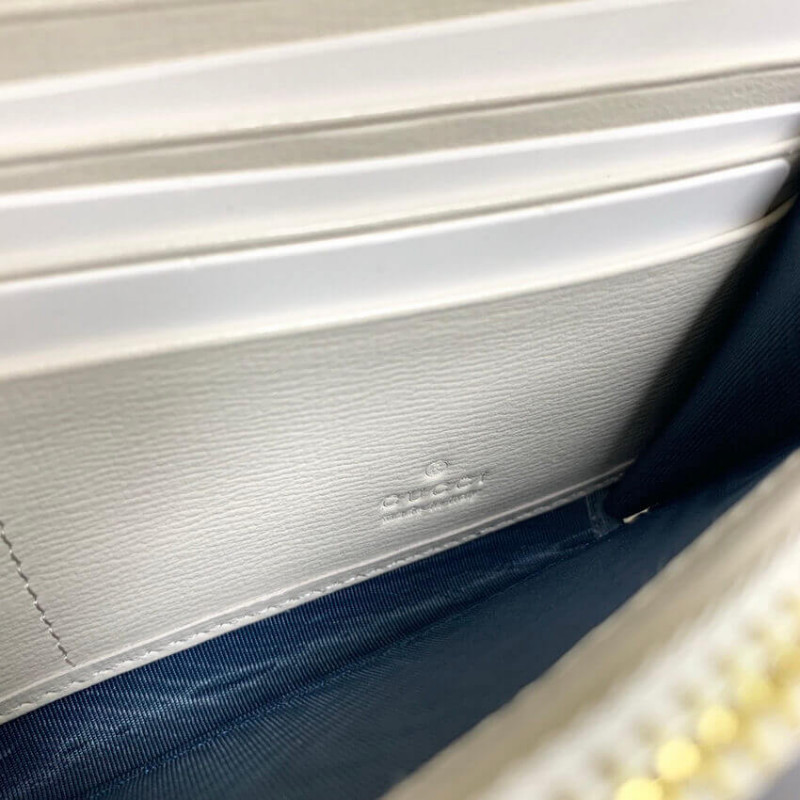 Transformed from its traditional half-moon shape, the Jackie 1961 is reimagined as a slimline chain wallet. The accessory s contemporary silhouette is paired with the House s monogram canvas and the green and red Web stripe, strengthening the link between past and present.A contrasting white leather trim completes the style.