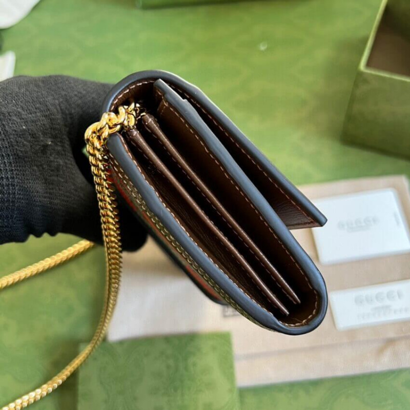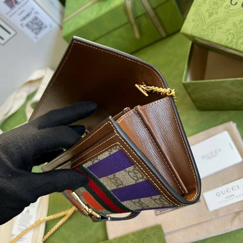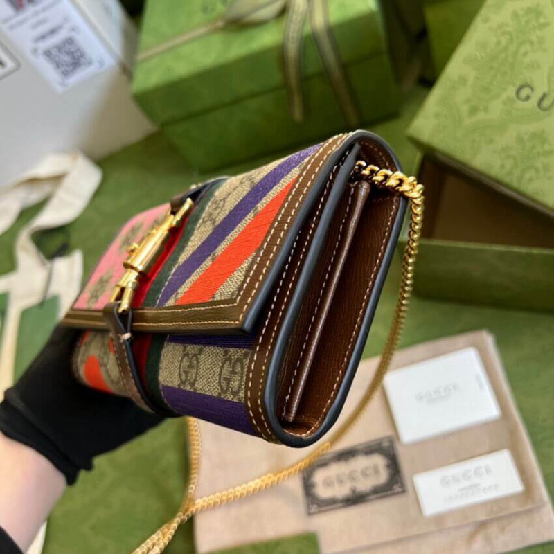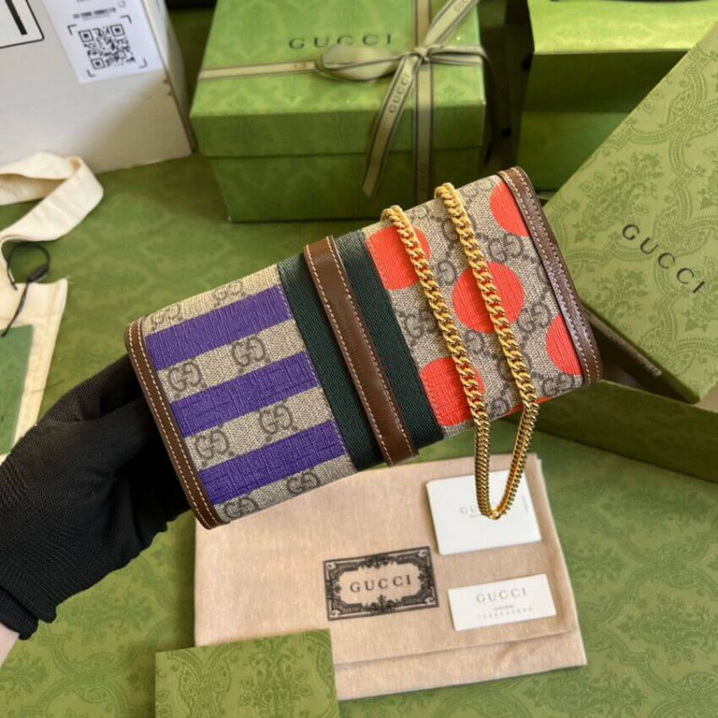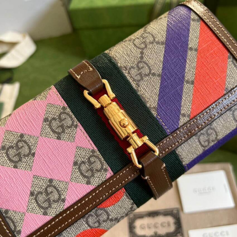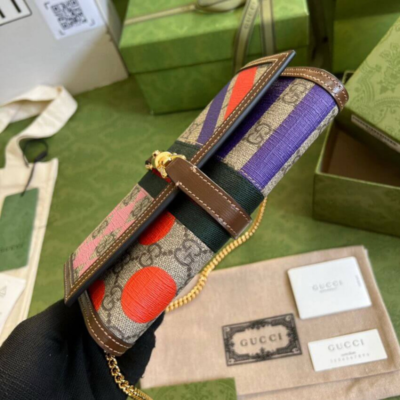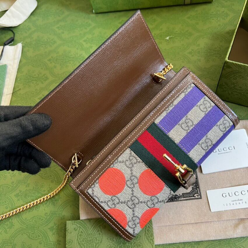 This item features bright and colorful geometric motifs that recall the uniforms worn by horse riding jockeys. The collection is inspired by the Parade Ring, or paddock, where horses walk around as a warm-up before the race and to help racegoers pick a winner. Here the print appears on this Jackie 1961 wallet, completed by a chain strap.