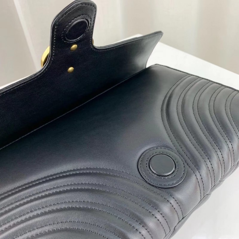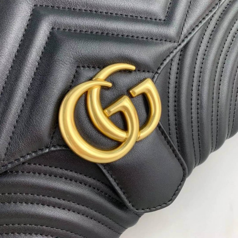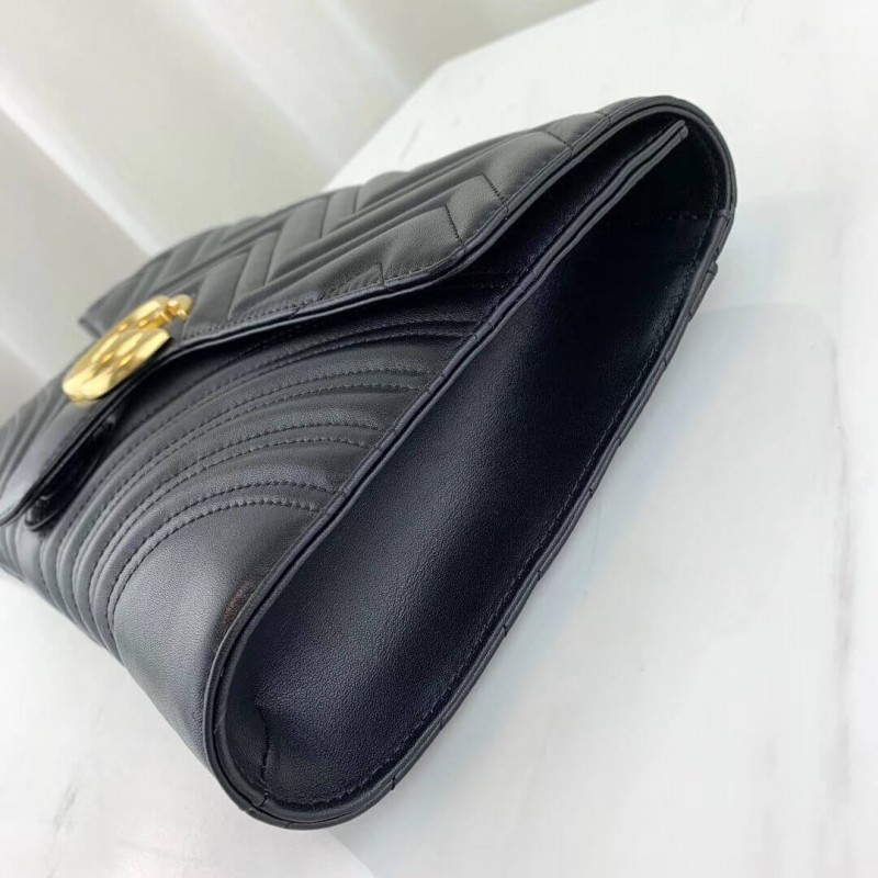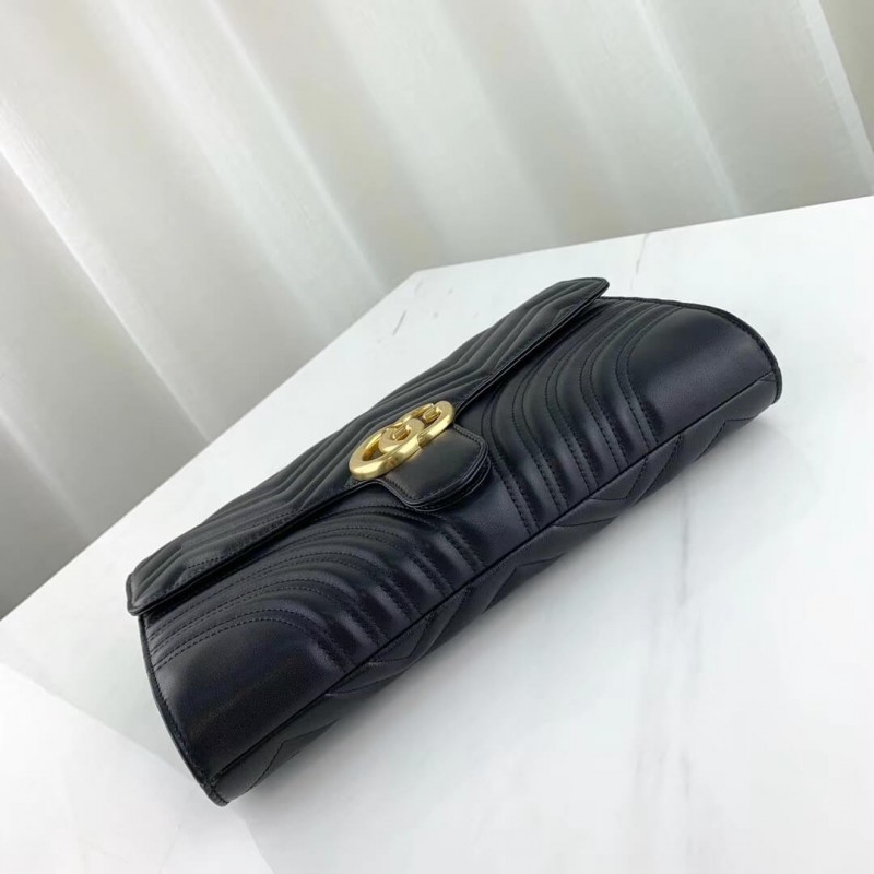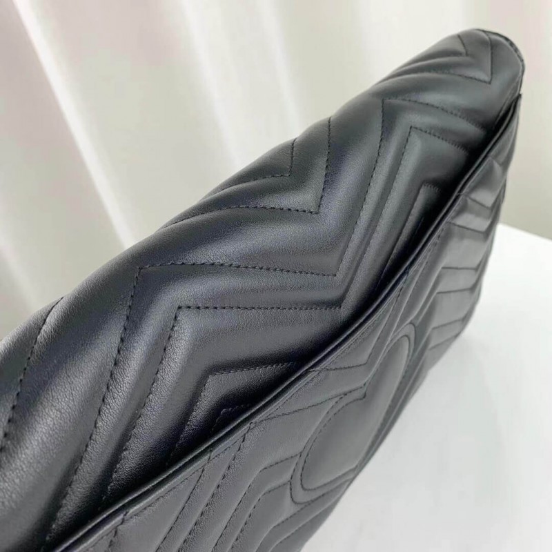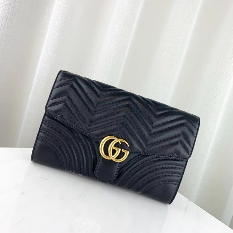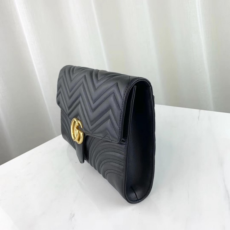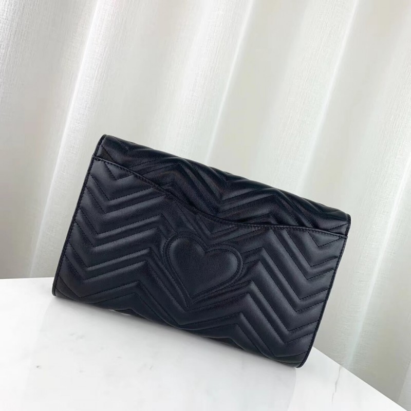 The GG Marmont clutch has a softly structured shape with open back pocket and an oversized flap closure with Double G hardware. Made in matelassé chevron leather with a heart on the back.
