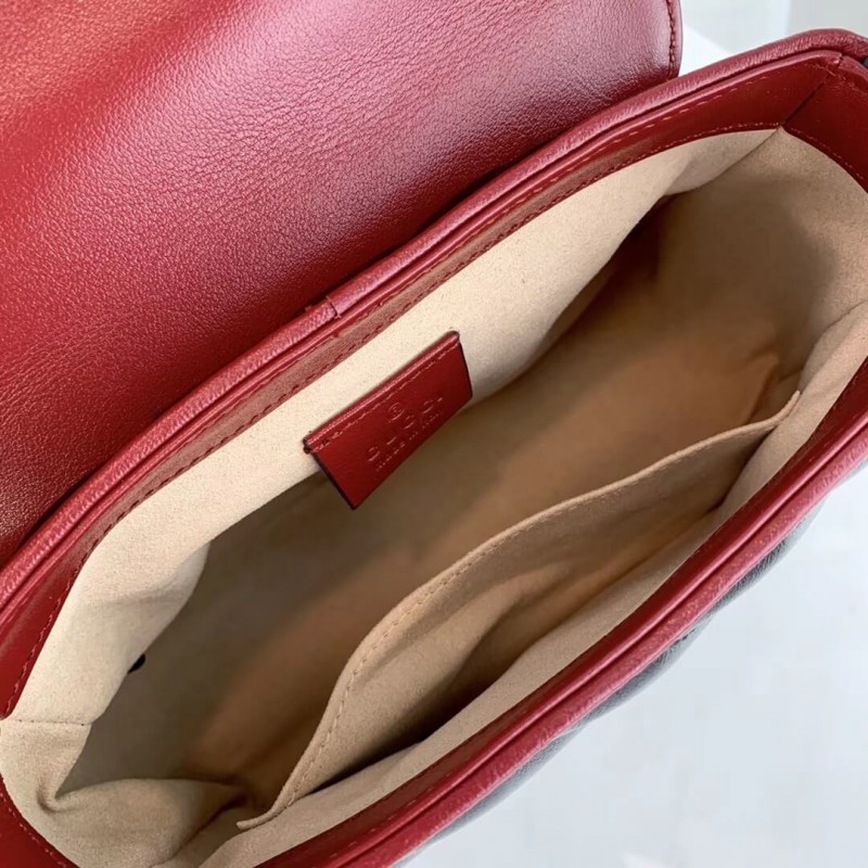 The GG Marmont bag is reimagined for Pre-Fall 2019, made from black diagonal matelassé quilted leather and completed with a twisted torchon Double G embellishment. The mini top handle s distinct softly structured shape is outlined in contrast cerise piping, highlighting its oversized flap closure. A removable chain strap allows the satchel shape to also be worn as a shoulder bag.