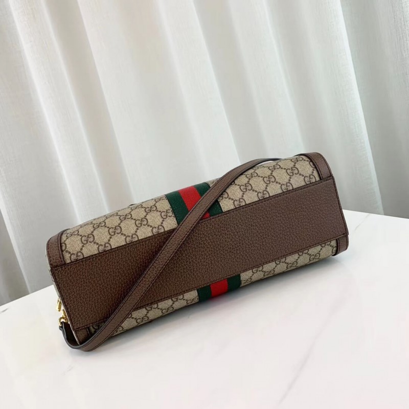 The world of Ophidia evolves with the introduction of a boston bag crafted in GG Supreme canvas with inlaid green and red Web stripe. The accessory is enhanced by a petite play on the Double G, an archival Gucci code from the 70s that appears atop a leather tab detail and on the zipper pull. The bag is completed with a detachable shoulder strap which allows it to be carried in multiple ways.
