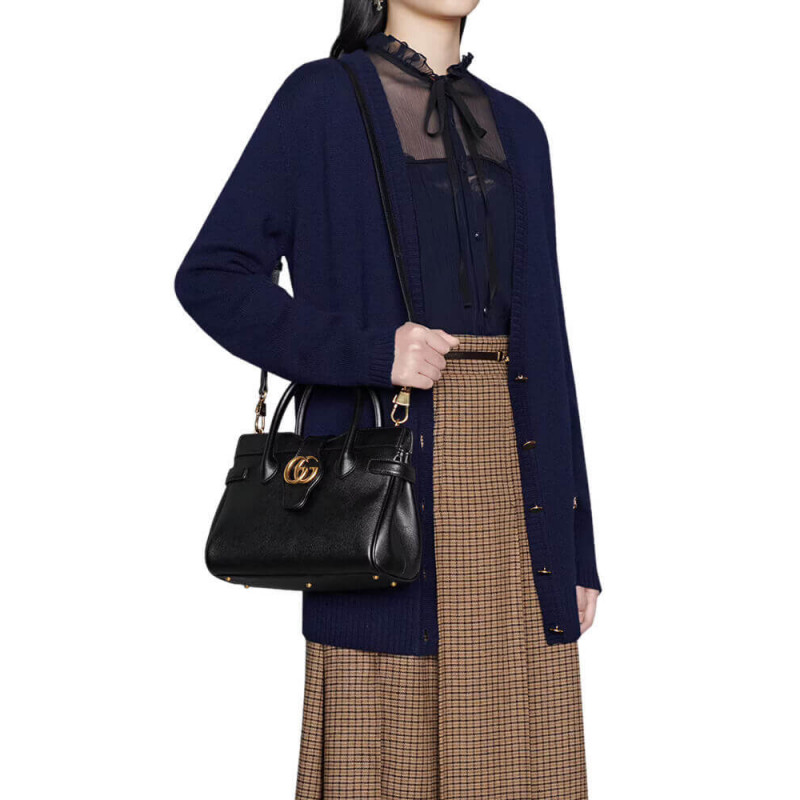 Taken from the 70s archives, the Double G recalls one of the heydays of the House. The hardware first appeared as a monogram belt buckle but has evolved into one of the brand s most emblematic codes. Here, the gold-toned detail defines a top handle bag in black leather. A detachable shoulder strap adds a versatile note to the style.