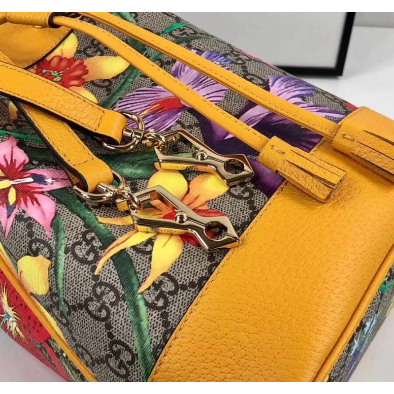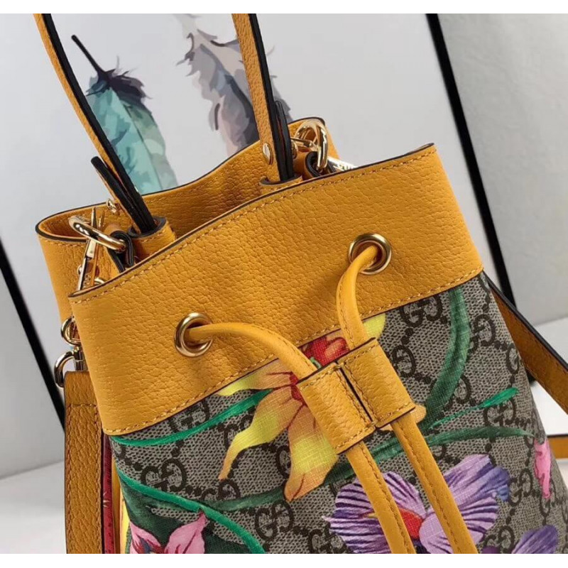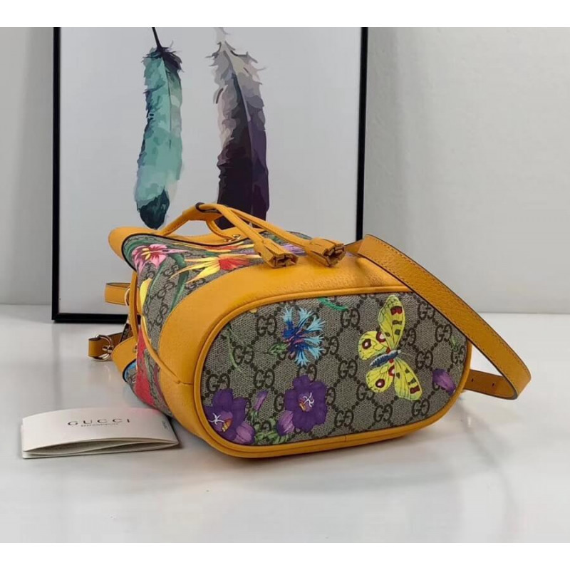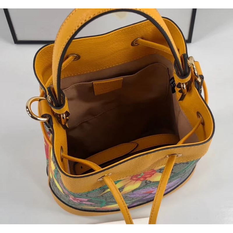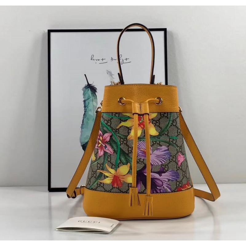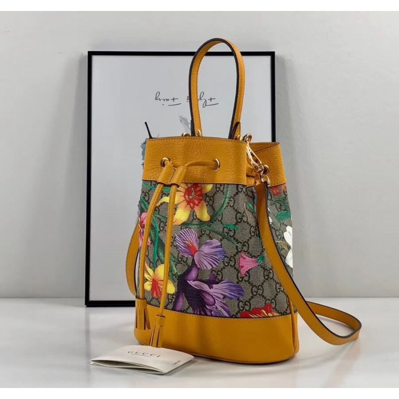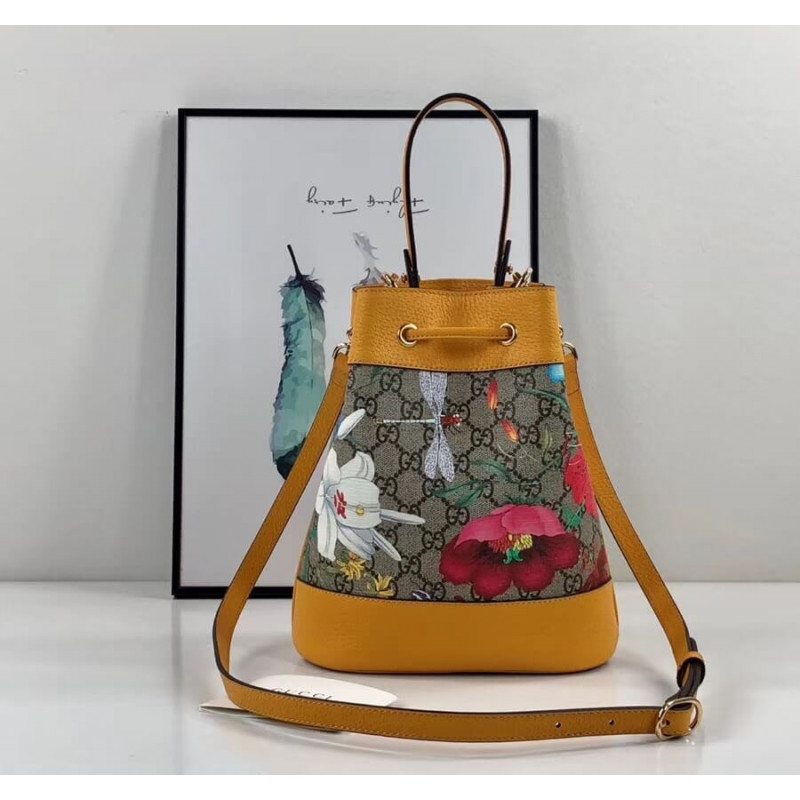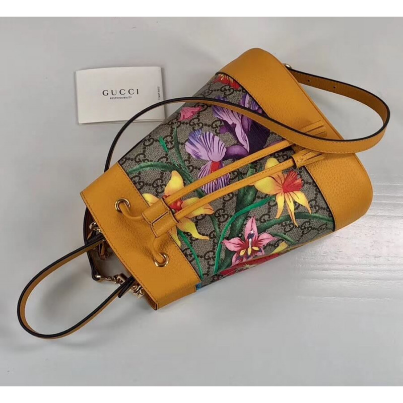 A special collection combines two of the House s most distinctive designs into an unexpected and contemporary fabric, animating classic silhouettes like the Ophidia bucket bag. The historic Flora motif, first presented by Vittorio Accornero more than 50 years ago, is layered over the House monogram and trimmed with bright green leather—a modern take on the two archival patterns available exclusively online.- 20.5 x 26 x 11 cm- Online Exclusive- Beige/ebony GG Supreme canvas with Flora print, a material with low environmental impact, with leather trim- Green and red Web- Shiny gold-toned hardware- Internal leather tag with “Gucci Limited Edition”- Created using a special holographic printing technique, this item’s dedicated packaging features a striped tie dye effect and tropical inspired image of palm trees.- Interior open and smartphone pockets- Leather handle with 4.5" drop- Detachable, adjustable shoulder strap with 21" drop- Drawstring closure- Microfiber lining with a suede-like finish