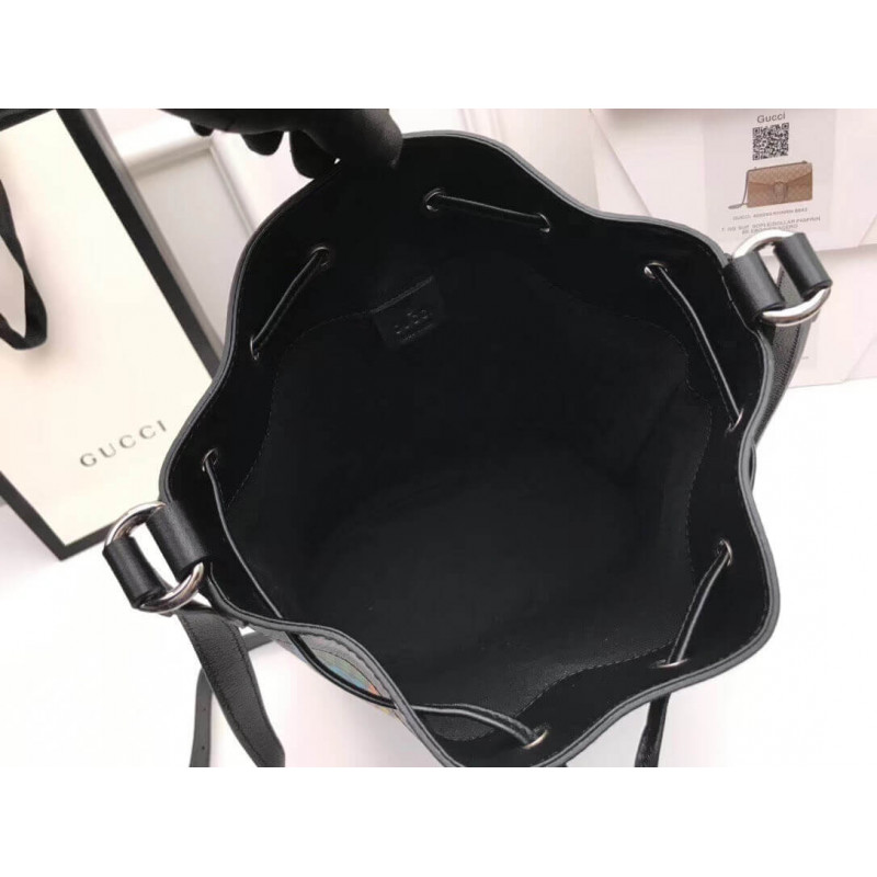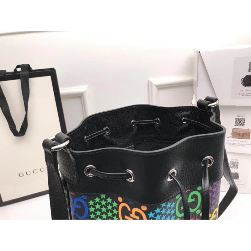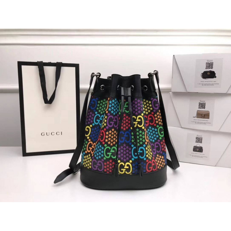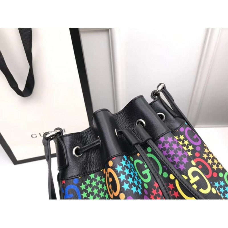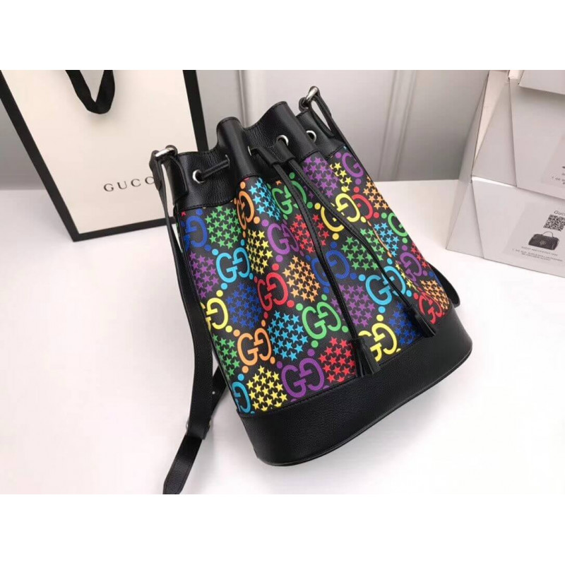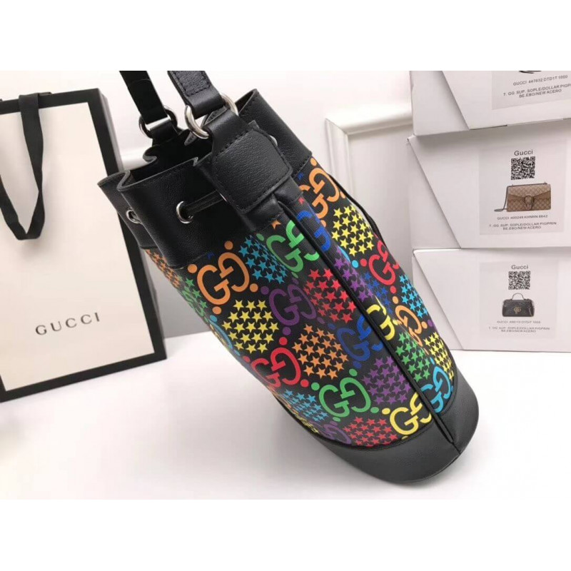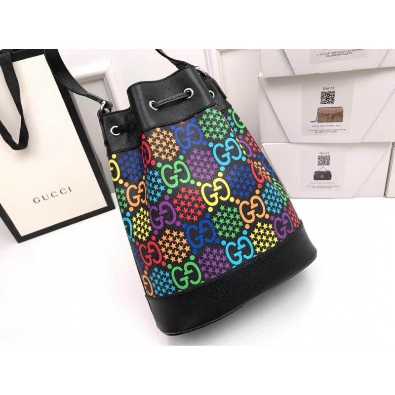 A modern take on the historic GG pattern, the GG Psychedelic motif decorates classic shapes throughout the Cruise 2020 collection, including the bucket bag with drawstring closure. Seen throughout ready-to-wear and accessories, the monogram is presented in brightly shaded hues with a star design that creates a hologram effect, trimmed here with bright pink leather.