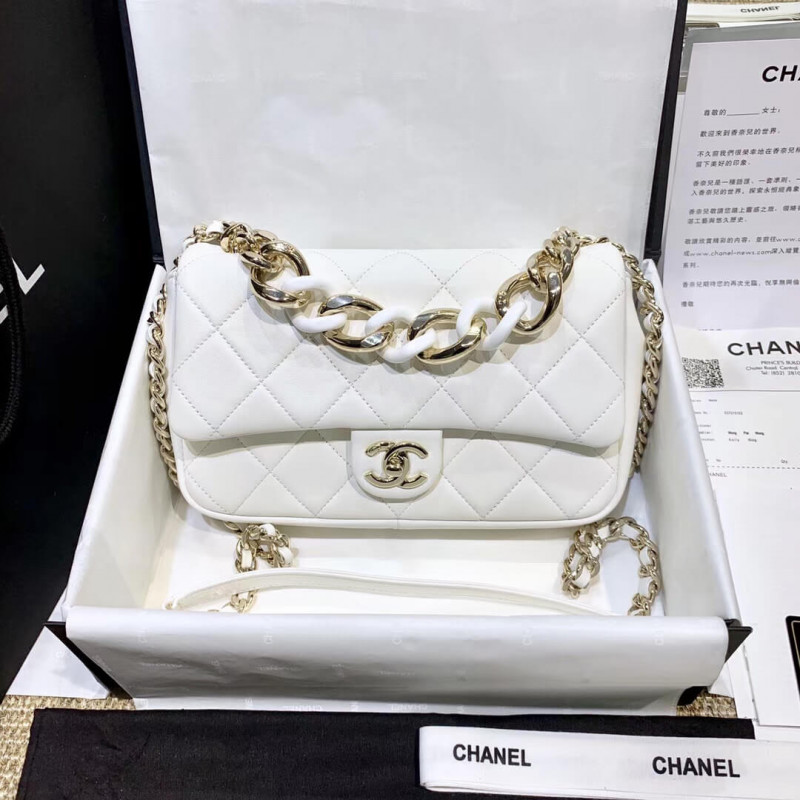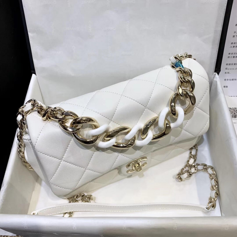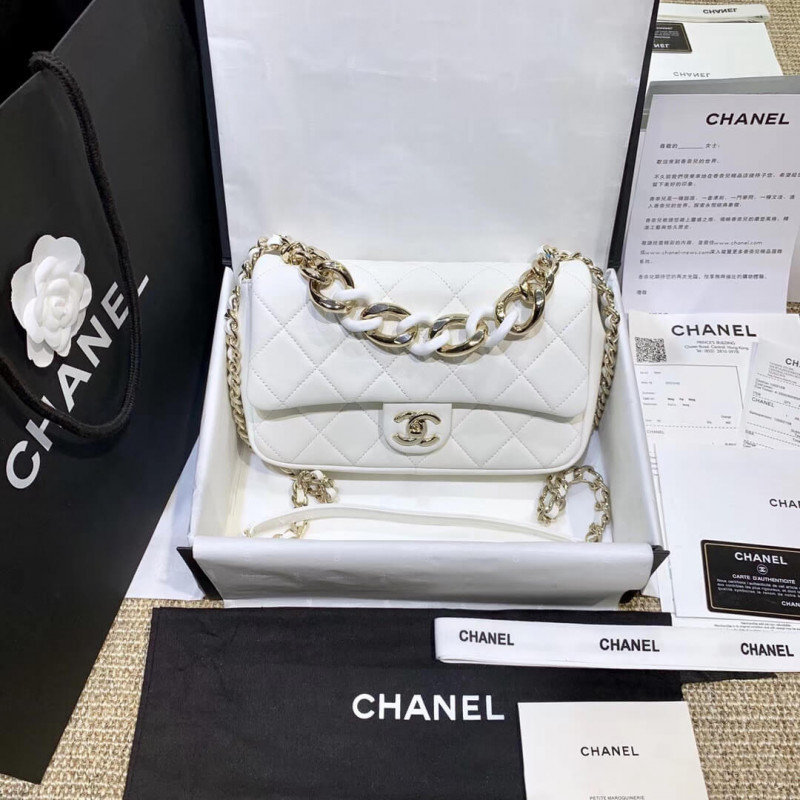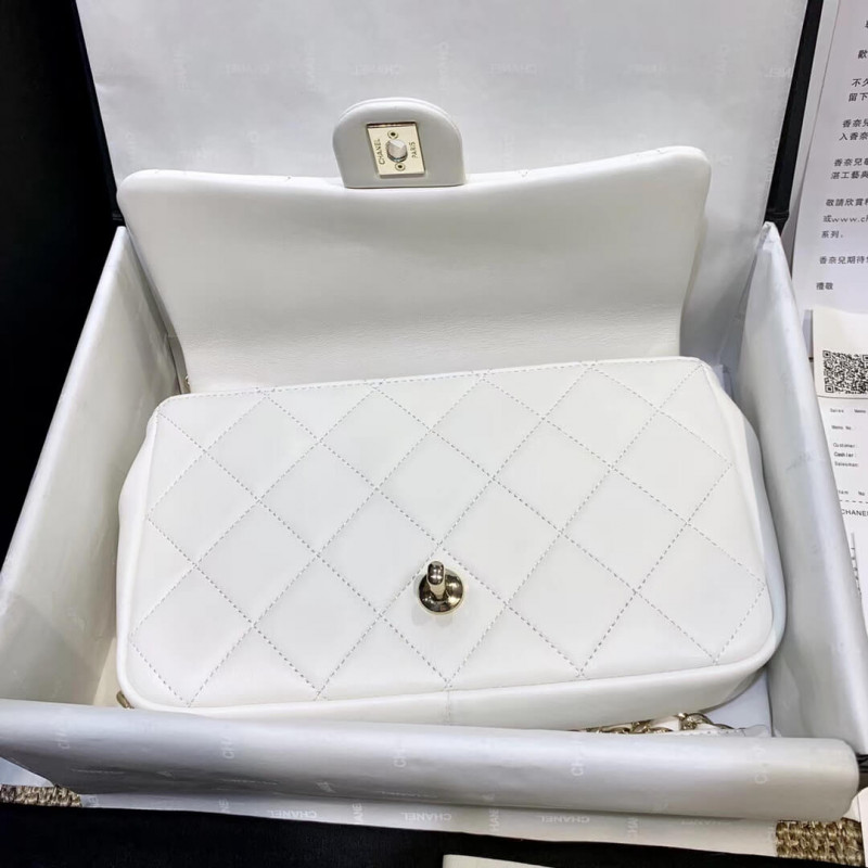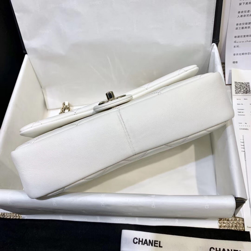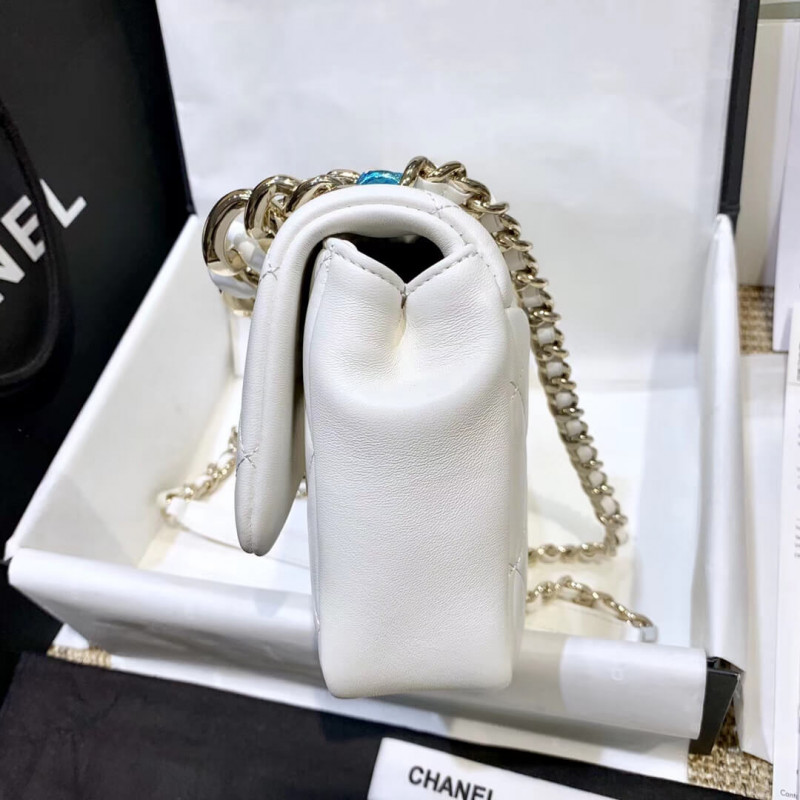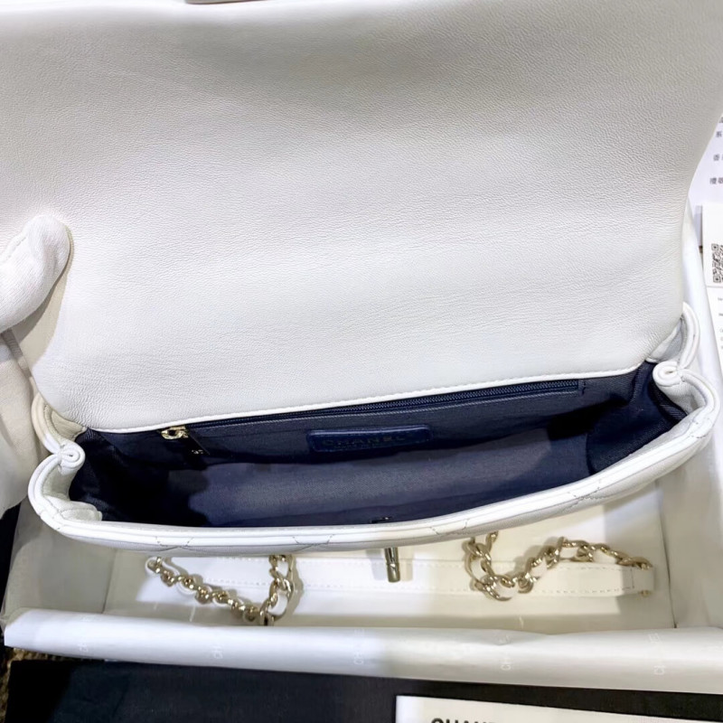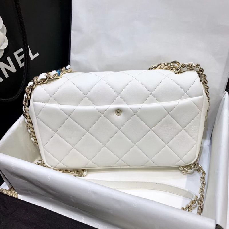 The new version has much a softer tone, and it feels smoother. It also features the same lambskin appeal like the Classic Bags. The CC smooth CC logo including the woven chain leather strap are both stunning too. Then zoom further in. The large gold chain is partly colored, with the same shade as the body of the bag. The back comes with a back pocket but can be closed with what-seems-to-be a snap button.